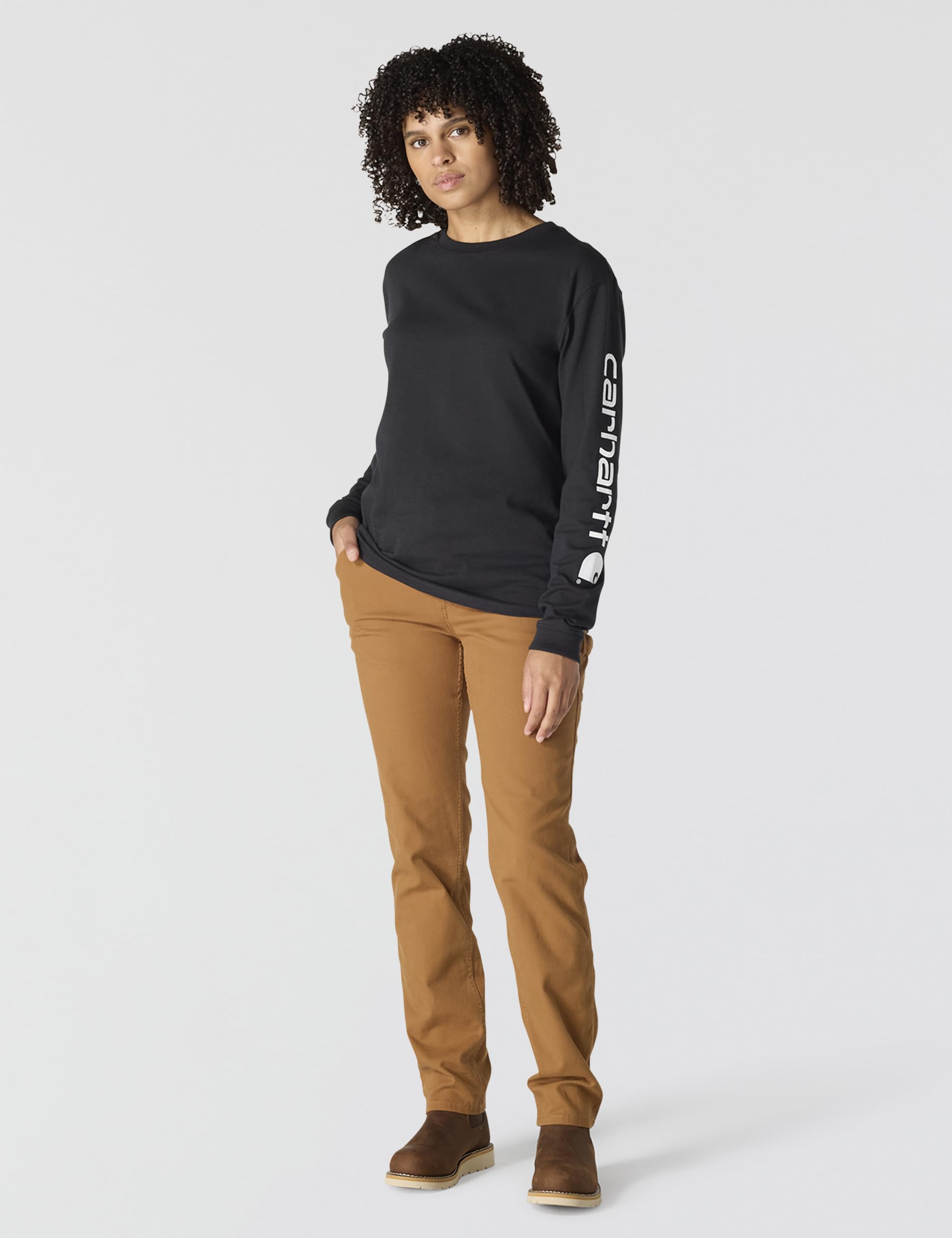 Description For well over a century, the Carhartt name has stood for quality and dependability on the job. This women's long-sleeve t-shirt is made of heavyweight cotton jersey and features a Carhartt logo on the sleeve.