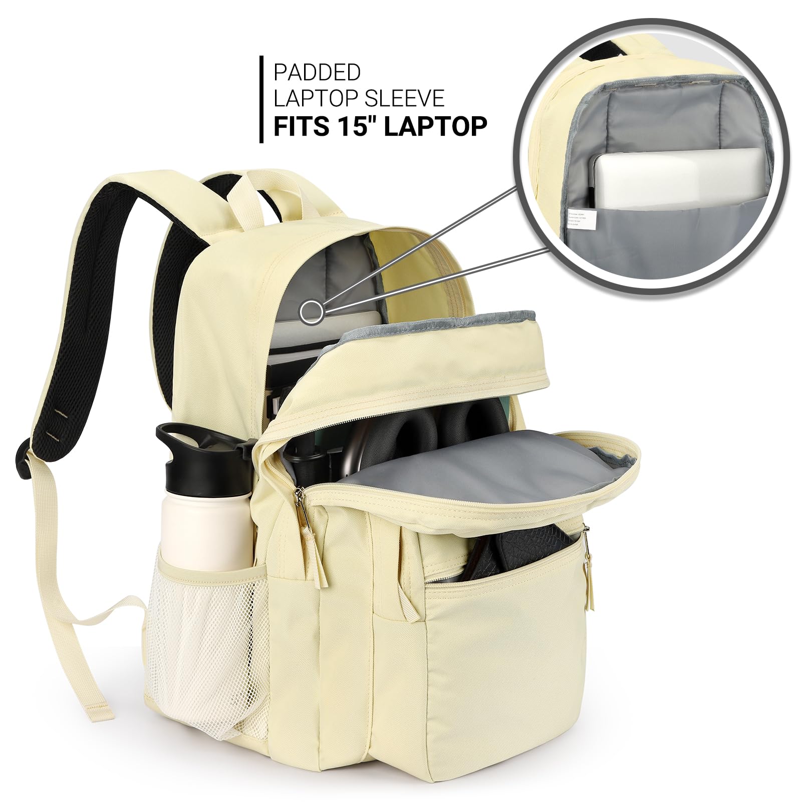 Convenient Storage Backpack: Our unisex laptop backpack features two main compartments, including a dedicated laptop sleeve for up to 15.6" devices. It also boasts a discrete front stash pocket, a utility pocket with an integrated organizer, and an additional external zippered pouch for quick access. Plus, two side pockets accommodate various water bottle sizes.