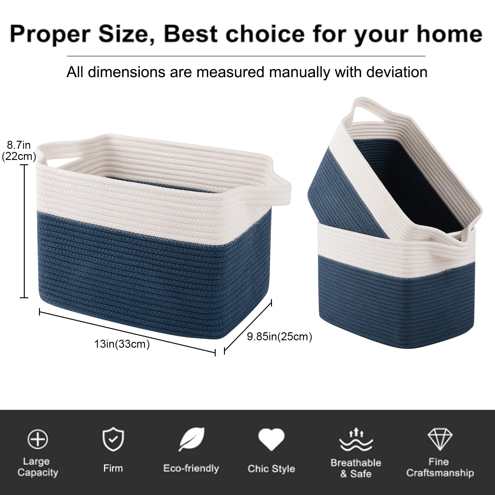 Multifunctional Storage Basket:13"x9.85"x8.7"inch, large capacity, convenient to store more daily necessities.Our baskets are handmade with flexible material, which may result in slight size variations. It is a perfect storage basket for living room, bedroom, bathroom, baby room, utility room, playroom, classroom. Store household items (towels, toiletries, etc.),Office Supplies, fruit, snacks , books, baby diapers or toys. Use for dog toy storage organization to keep your living space tidy