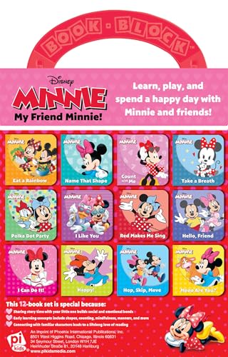 Recipient of Seal of Approval from The National Parenting Center. Come along with Minnie Mouse and her pals to explore concepts including shapes, singing, counting, and friendship! These 12 sturdy board books with "just-my-size pages" are perfect for little hands, leading the way to a lifelong love of reading. Books are housed in a convenient carry case with a handle, for fun and fashion on the go! This 12-book set is special because: Sharing story time with your little one builds social and emotional bonds Early learning concepts include shapes, counting, mindfulness, manners, and more Connecting with familiar characters leads to a lifelong love of reading Includes iconic Disney characters: Minnie Mouse, Mickey Mouse, Daisy Duck, Figaro, Donald Duck, Goofy, and Pluto