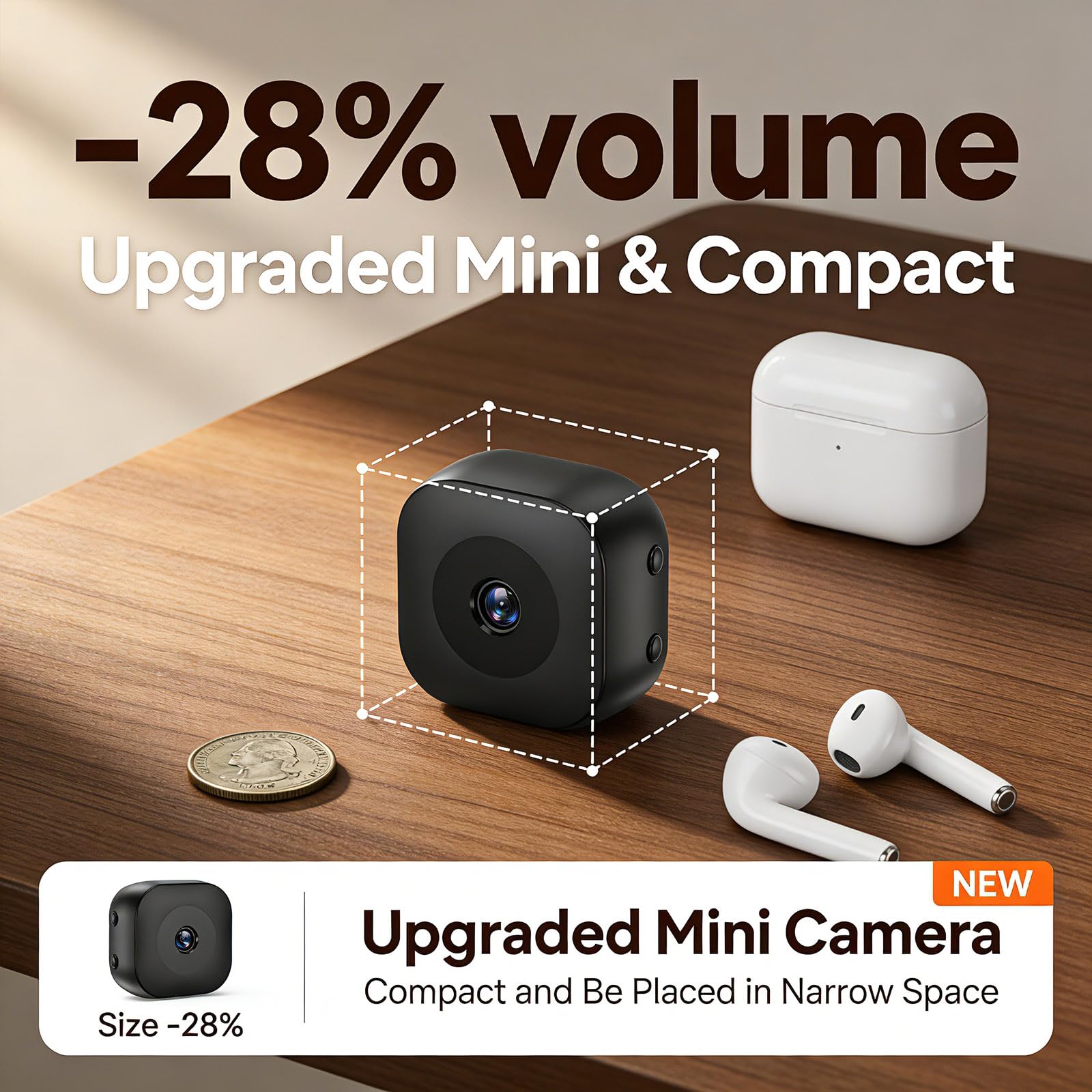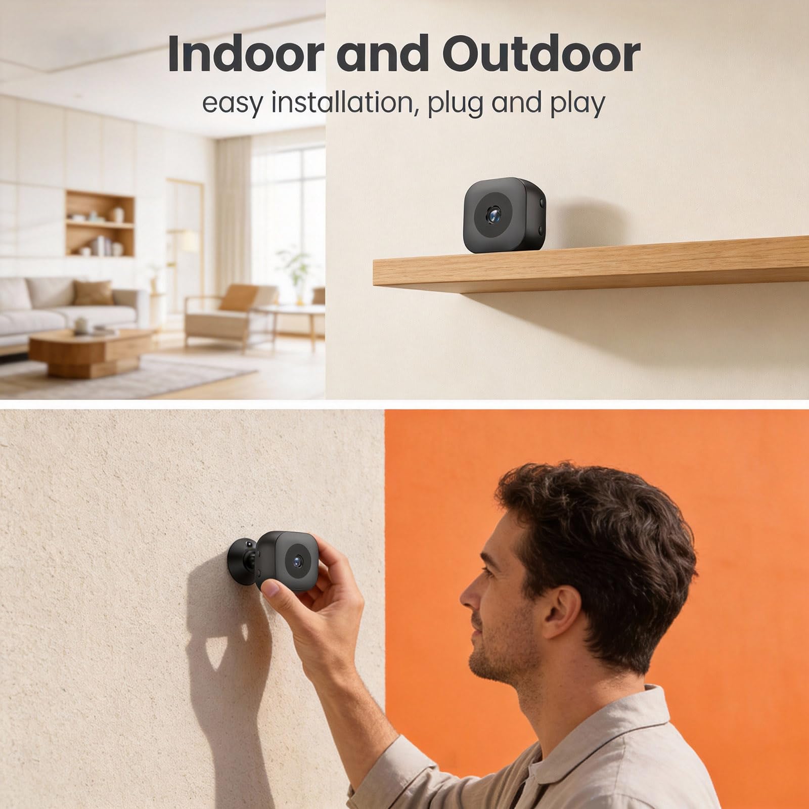 All Angle Adjustability:Crafted to merge naturally with any interior, this mini camera offers exceptional placement flexibility. With the included magnetic snap-on base and 3M adhesive, you can complete a drill-free installation on bookshelves, walls, or ceilings in moments.