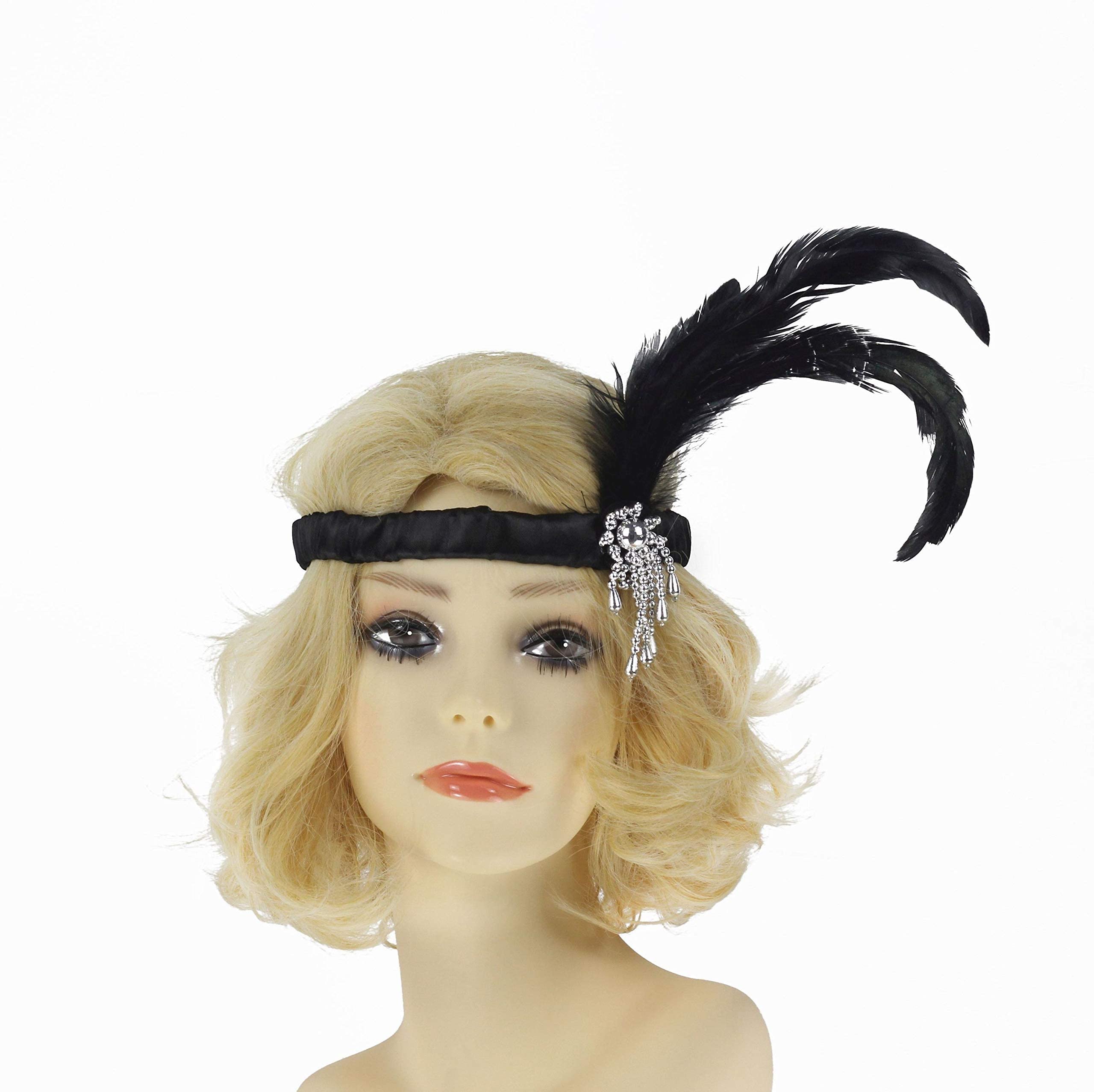 Flapper Headband: With feather and jewel detail, perfect for 20's night, one size fits most sizes,attached to a shinning black elastic band that allows for easy adjustment.