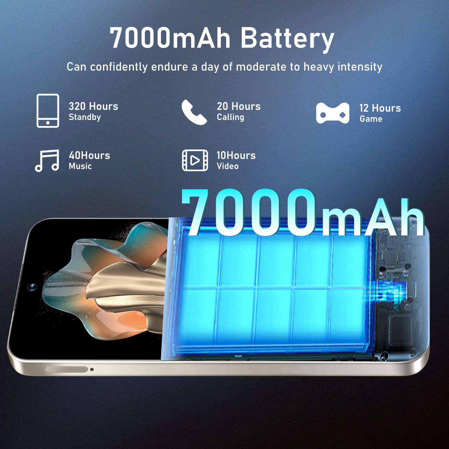 đ±ăLONG LASTING BATTERYă. With the 7000mAh big battery and own battery saving technology, smartphone unlocked can confidently last a full day of medium-to-heavy use without charging. Equipped with 20W fast charging, it can charge quickly when you needed