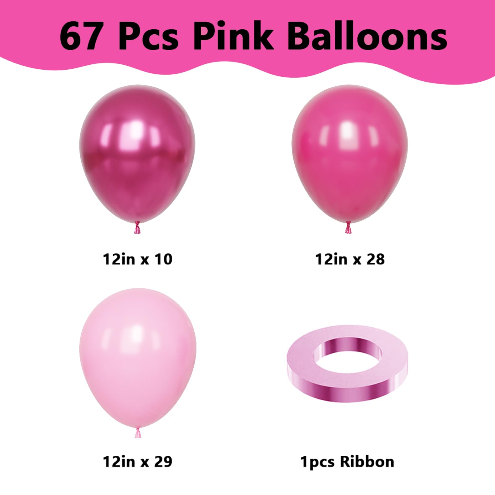 {All-in-One Kit} This pink balloon kit includes everything you need to create a stunning decoration,29 light pink balloons, 28 hot pink balloons, 10 metallic pink balloons and 1 roll of pink ribbons. The size of the balloon is about 12 inches after inflation. Birthday baby shower bridal shower party decorations.All in one value package! light pink and deep pink balloons are a great way to add a pop of color to any party without spending a lot of money.