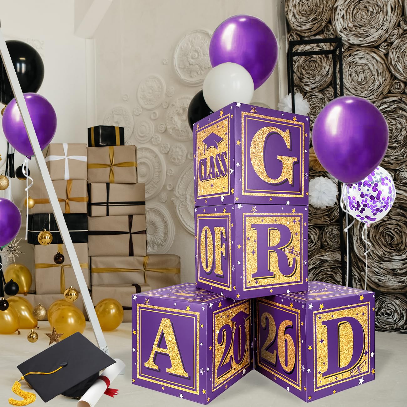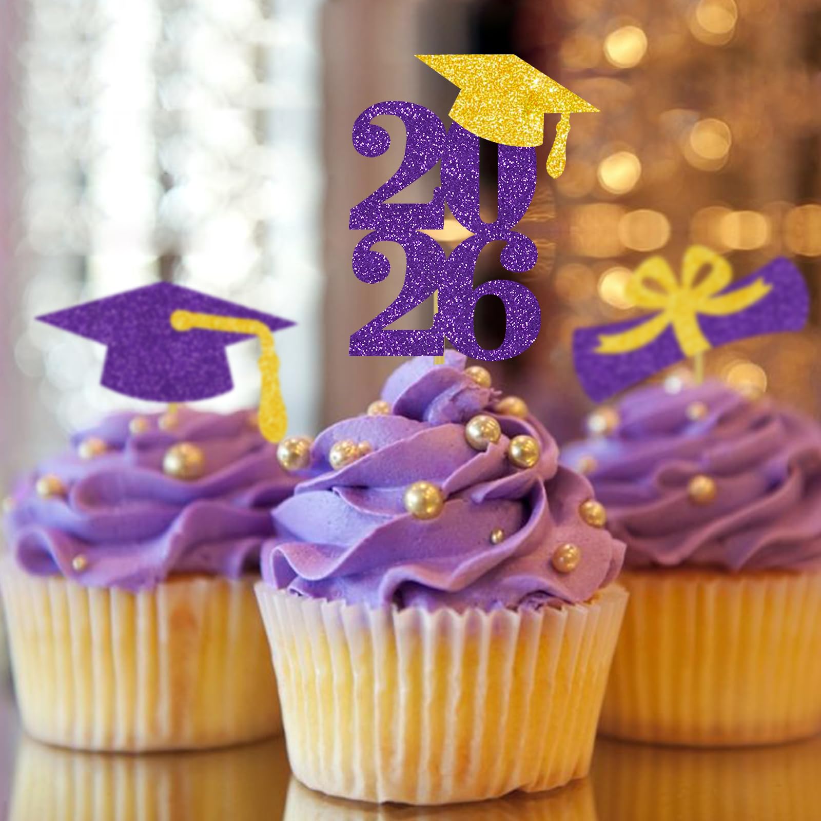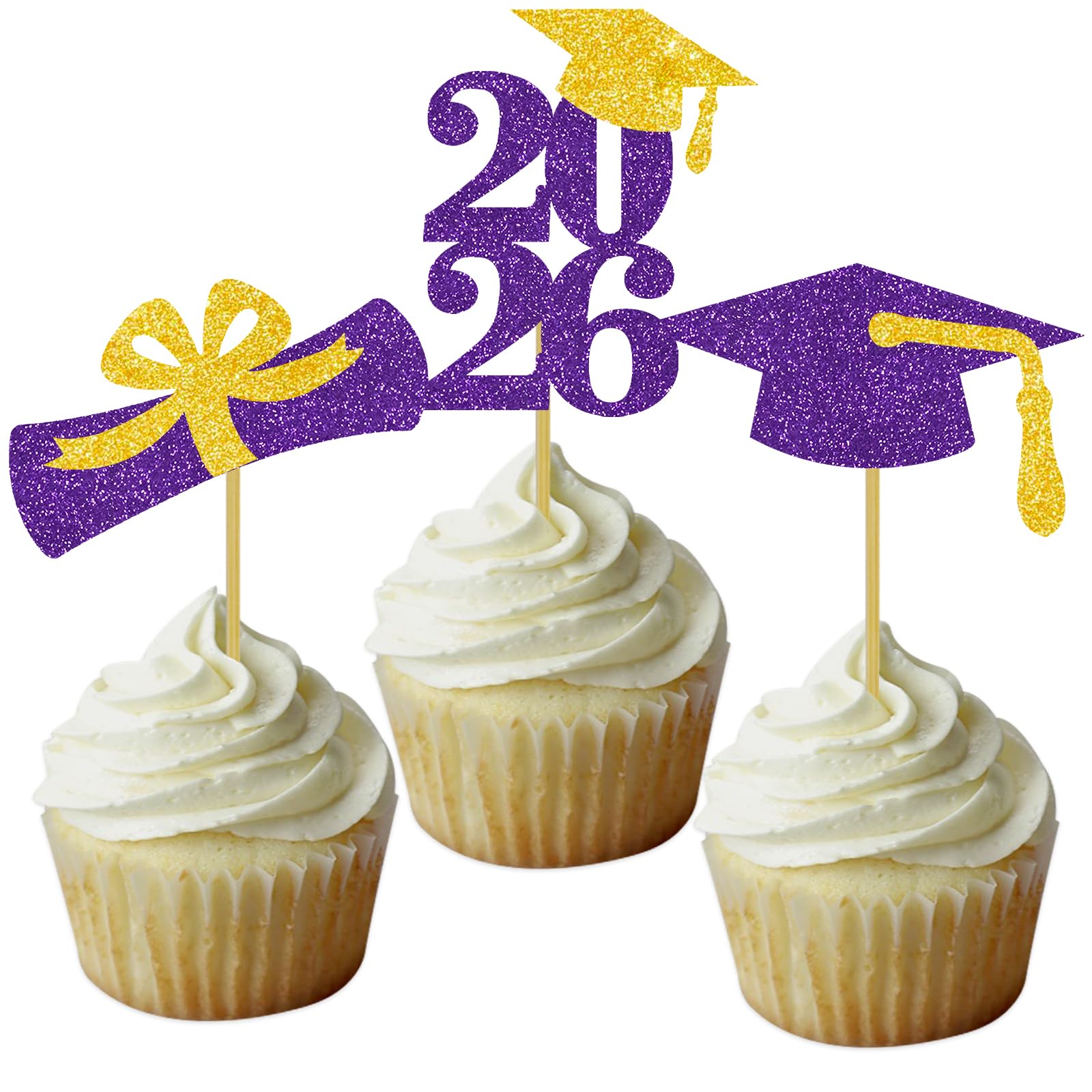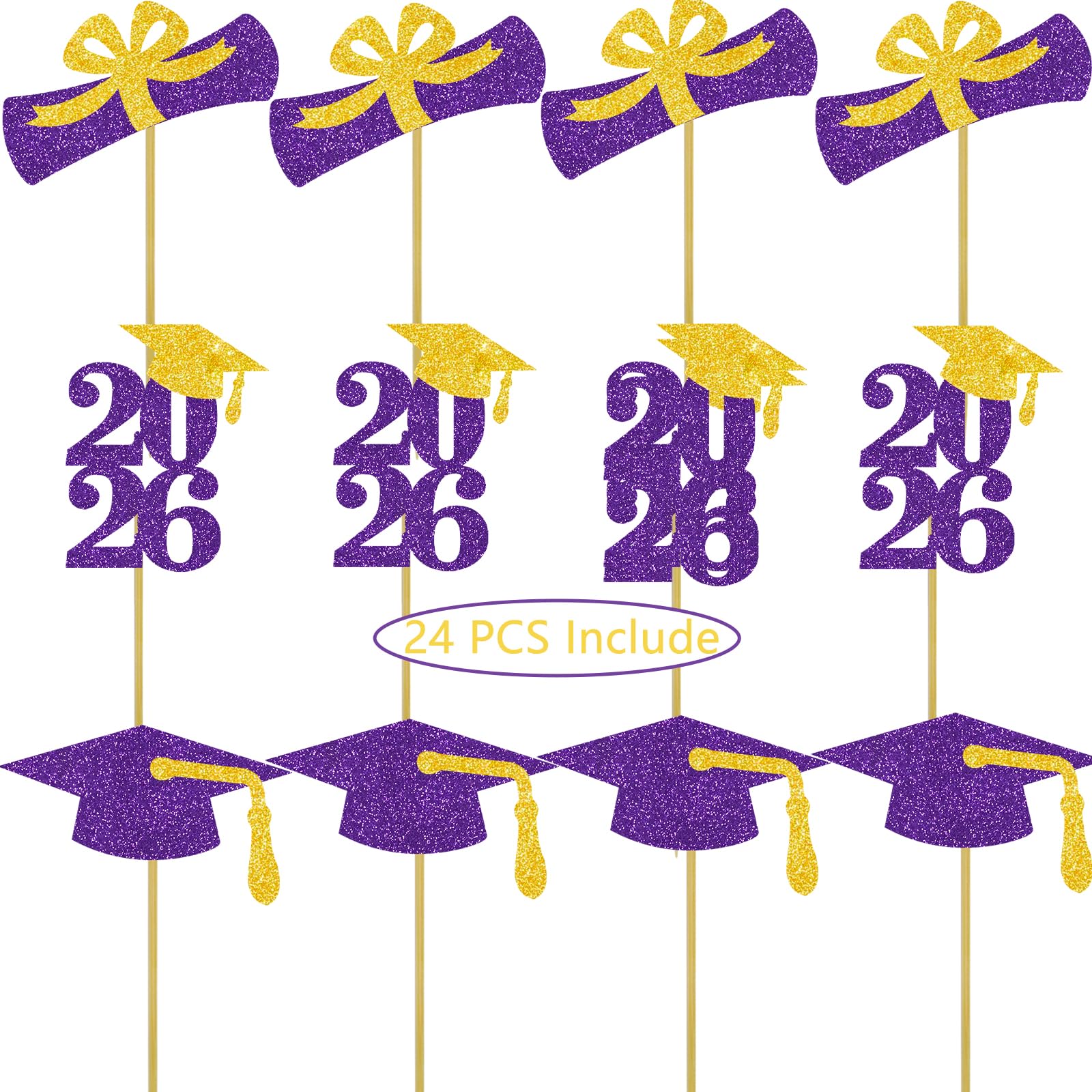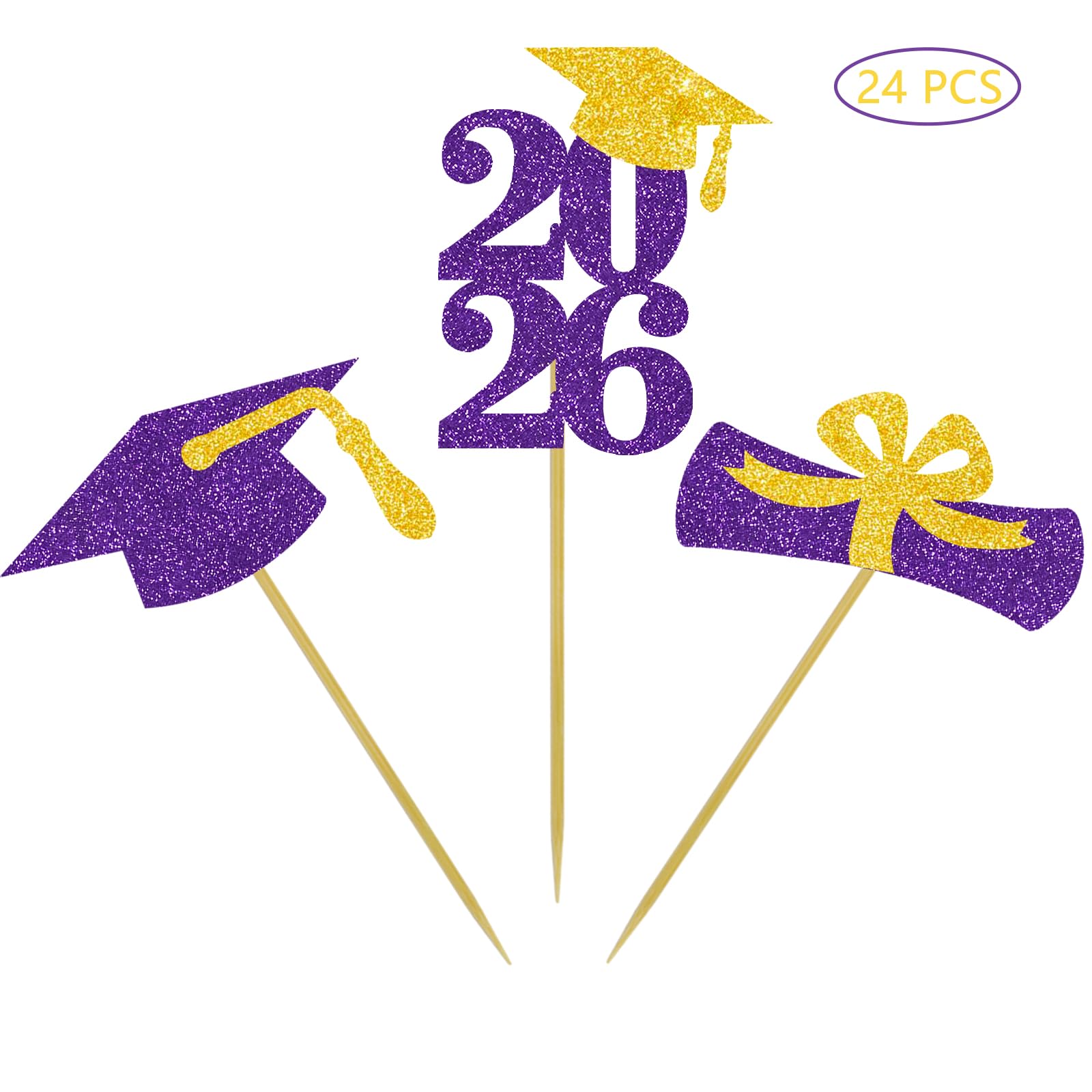2026 graduation cap cupcake toppers: 8 pcs purple grad cap cupcake toppers with gold tassel, 8 pcs purple 2026 number cupcake toppers, 8 pcs purple and gold diploma bow cupcake toppers