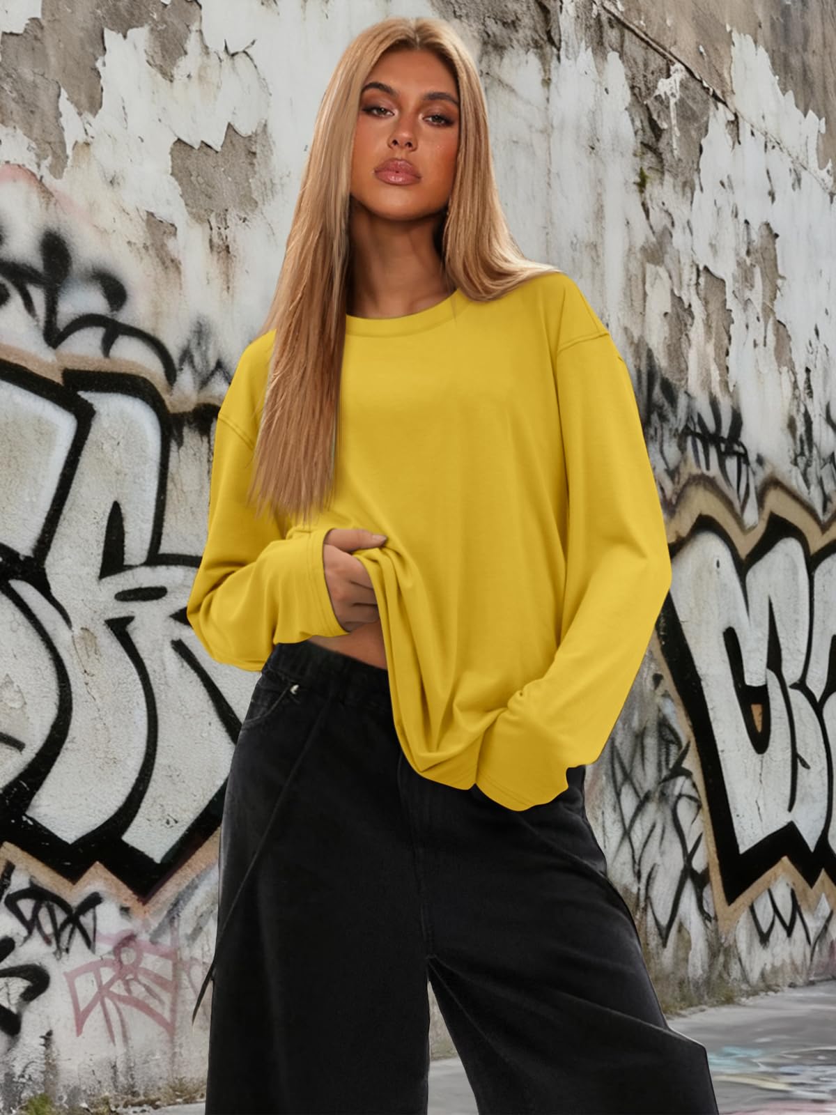 Design: This top features a soft, comfy, and casual style with a crew neck and long sleeves. It comes in both cropped and regular styles, giving you the option to wear it as a regular top or fold it up for a trendy top look.