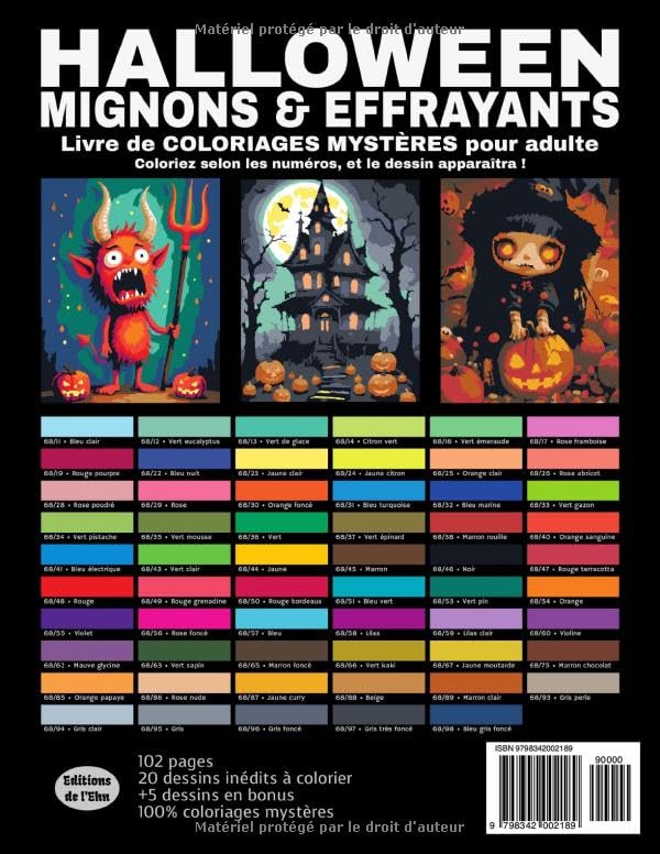 🎃 Livre de coloriages mystères sur le thème d'Halloween 🎃, rempli de créatures mignonnes et effrayantes... pour adulte et adolescent. Vous allez adorer colorier les 20 dessins inédits d'Halloween rassemblés dans ce livre de coloriage, ainsi que les 5 autres dessins ajoutés en bonus, qui sont issus d'autres livres de la même collection ( "Créatures Légendaires", "Animaux Fantastiques", "Oiseaux", "Fleurs" ) ! Le principe est simple : Des numéros sont inscrits dans les différentes zones du dessin. Coloriez chaque zone du dessin de la couleur indiquée par son numéro. Cela fera apparaître progressivement le dessin final ! Comptez environ 1 à 4 heures de coloriage par dessin. Beaucoup de plaisir et d'amusement en perspective ! Retrouvez dans ce livre des dessins mignons et effrayants pour vous plonger dans l'univers d'Halloween : Vampires 🧛♂️, Sorcières, Fantômes 👻, Squelettes 💀, Momies, Diablotins, Loups-garous 🐺, Monstre de Frankenstein, Maisons hantées, Enfants terrifiants, Personnages à tête de citrouille, Jack-o'-lantern 🎃, Chauve-souris 🦇, Araignées 🕷️, Chats noirs... Chaque coloriage mystère est dessiné sur une page de droite, ce qui permet de découper et d'exposer tous les coloriages, puisqu'il n'y a qu'un seul dessin par feuille. Découvrez à l'arrière du livre des exemples de coloriages mystères contenus dans ce livre. Ce livre est une excellente idée de cadeau ! 🎁 Alors si vous voulez faire un heureux, ou une heureuse, ajoutez maintenant à votre panier ce magnifique livre de coloriage...