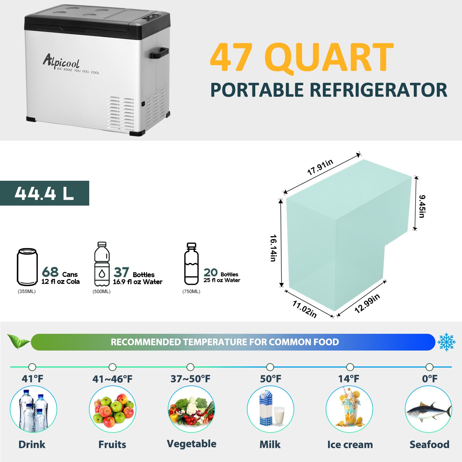STORAGE SPACE:Exterior Size 22.6"x14.4"x19.3", 53 Quart(50 Liter) capacity ,fits 68 x 12ozs cans of Cola.Fruit, meat, ice-cream can be kept fresh in our C40 refrigerator.