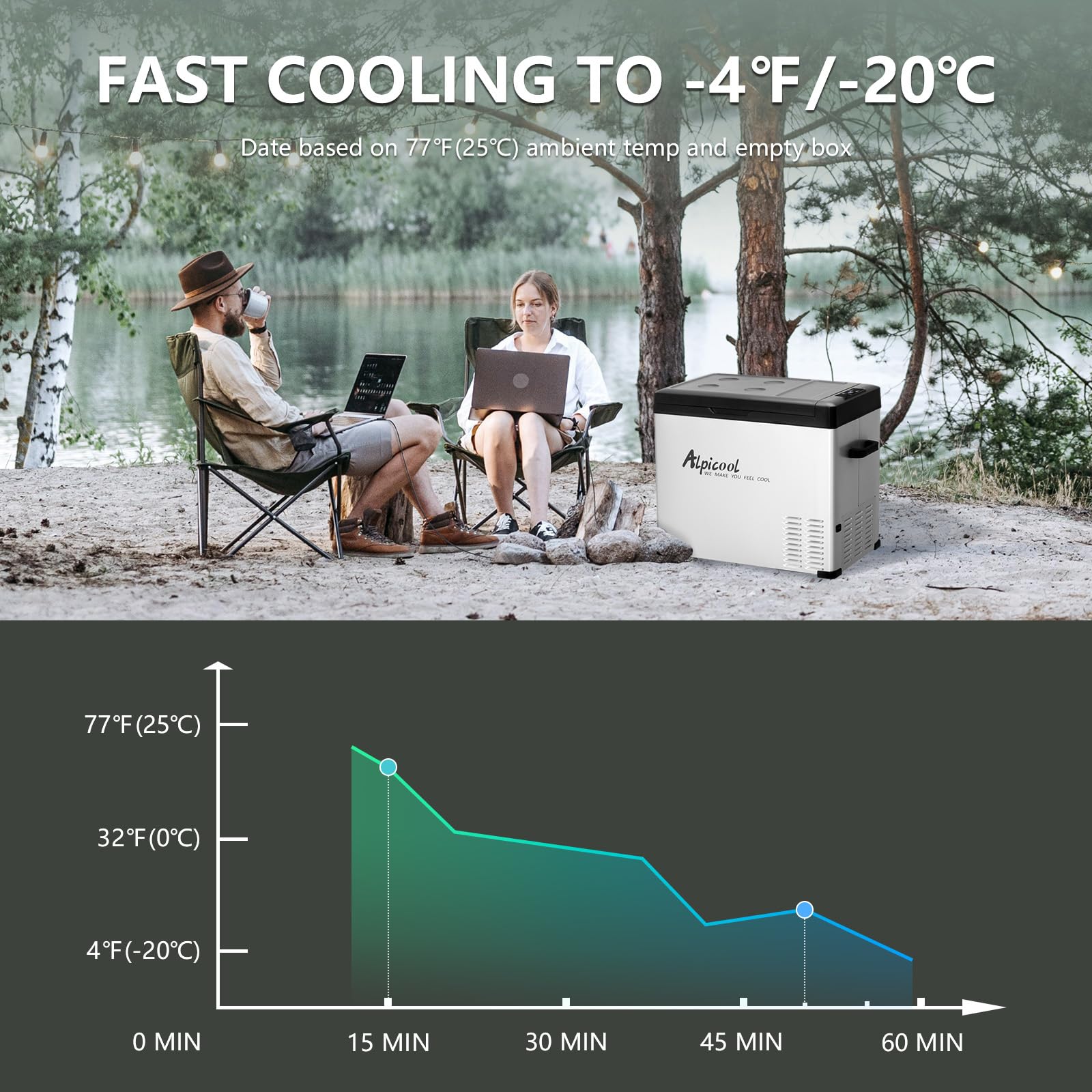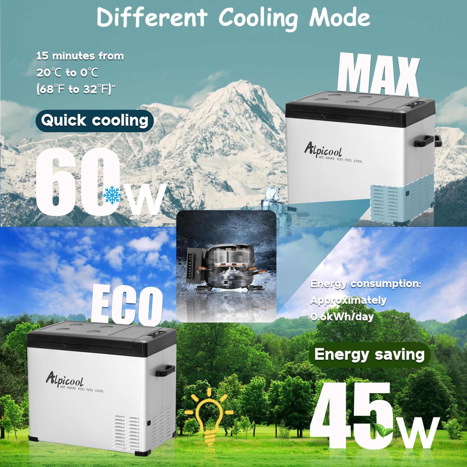 FASTER COOLING : Intelligent compressor cooling technology , from 77℉(25℃) to 32℉(0℃) only needs 30 minutes. Adjustable MAX and ECO cooling mode, MAX is fast cooling mode, ECO is energy saving mode.