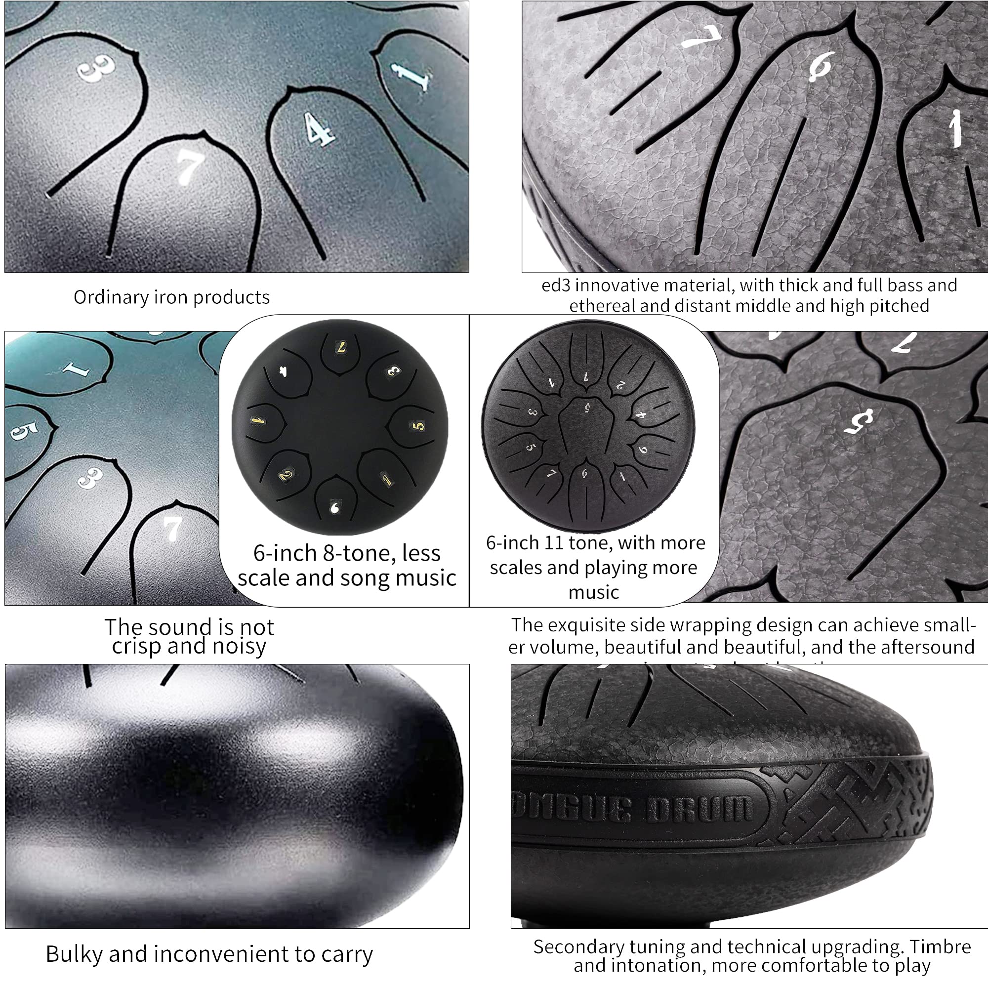 【Easy to Play】Each tongue of this steel tongue drum is precision laser-cut for accurate, stable pitches. With 11 notes in the key of C, this tongue drum lets you play beautiful melodies easily, even with no musical background.Suitable for both professional performances and beginners, this steel drum is perfect for players of all levels.