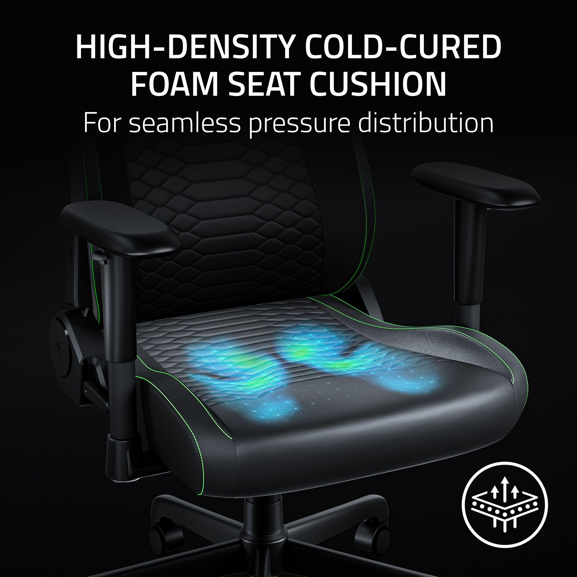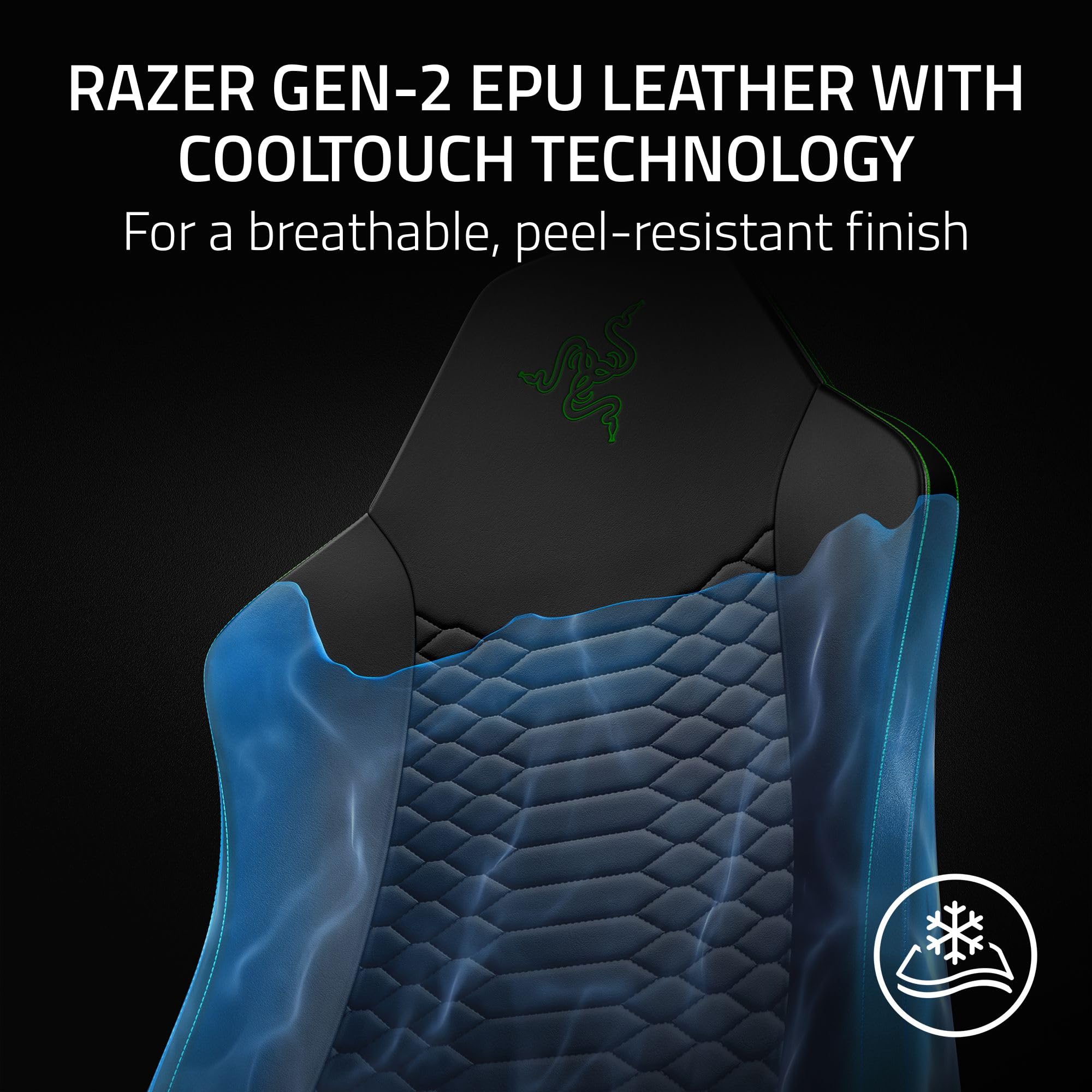 RAZER GEN-2 EPU LEATHER WITH COOLTOUCH TECHNOLOGY — Stay cool and comfortable with CoolTouch technology that offers high thermal effusivity and 13x more durability than standard PU leather for a premium, long-lasting finish