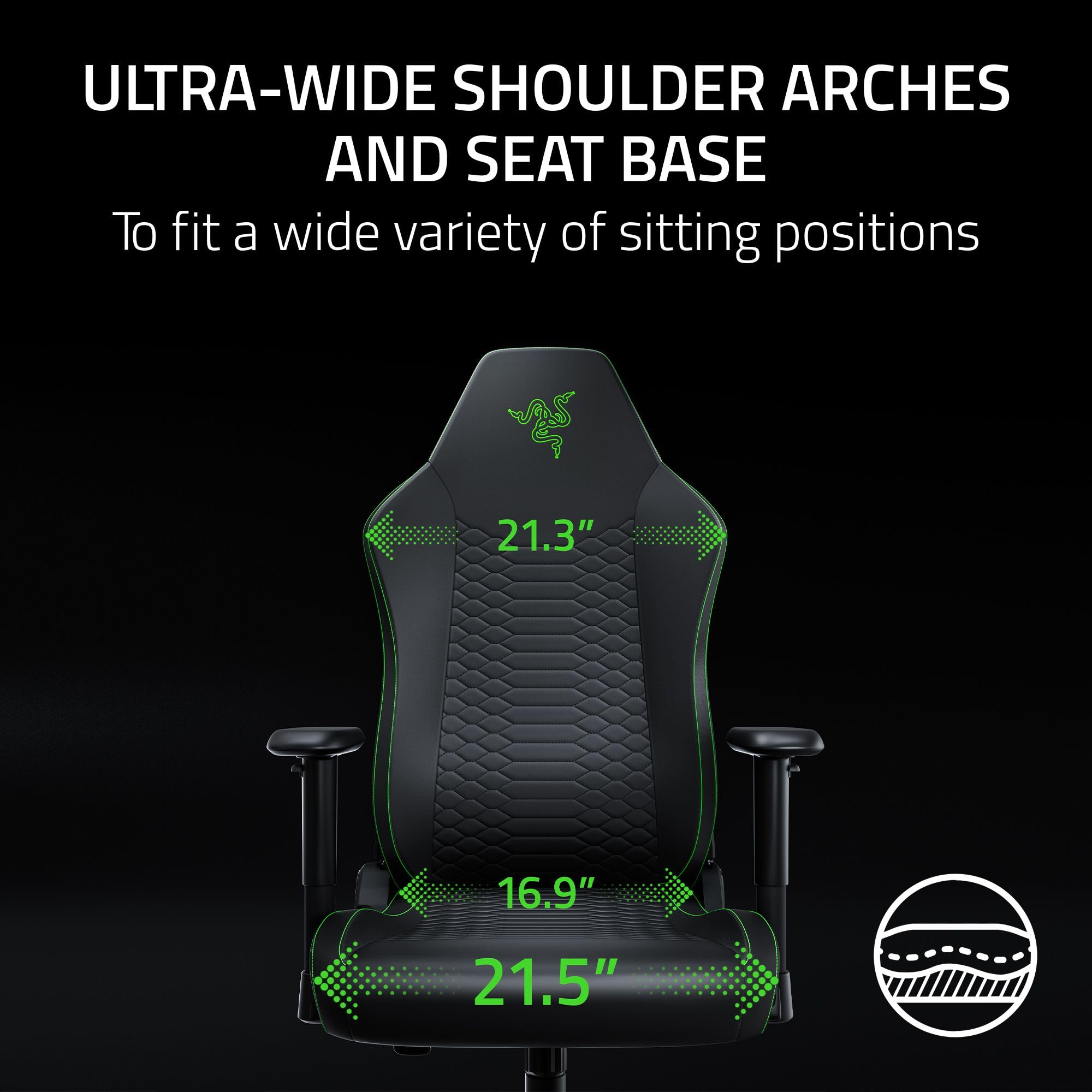 ULTRA-WIDE SHOULDER ARCHES AND SEAT BASE — The spacious, open design provides total freedom of movement, allowing to sit cross-legged or shift positions naturally for unrestricted comfort during long-duration sessions