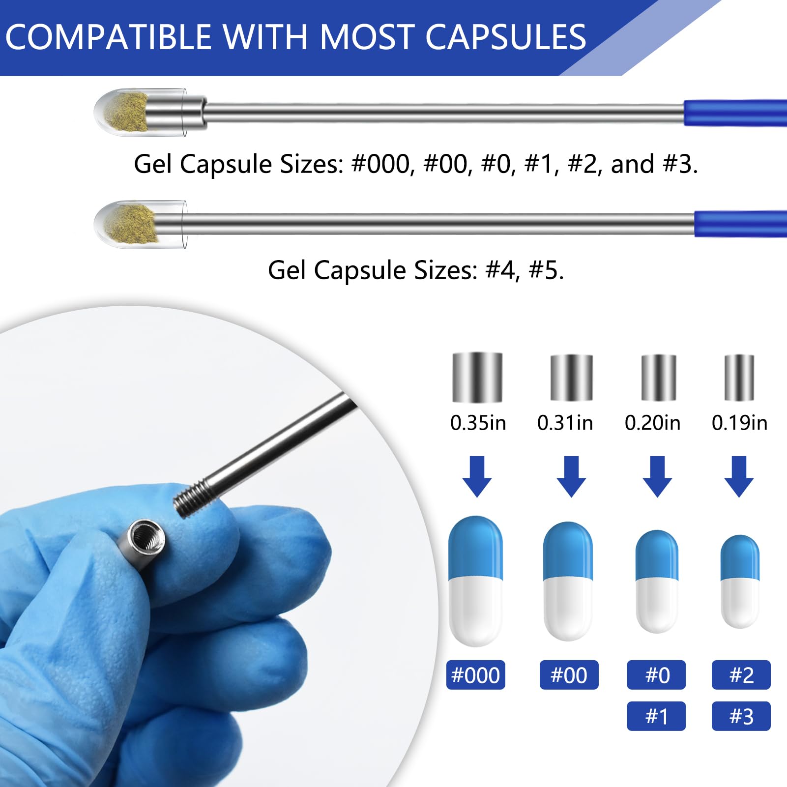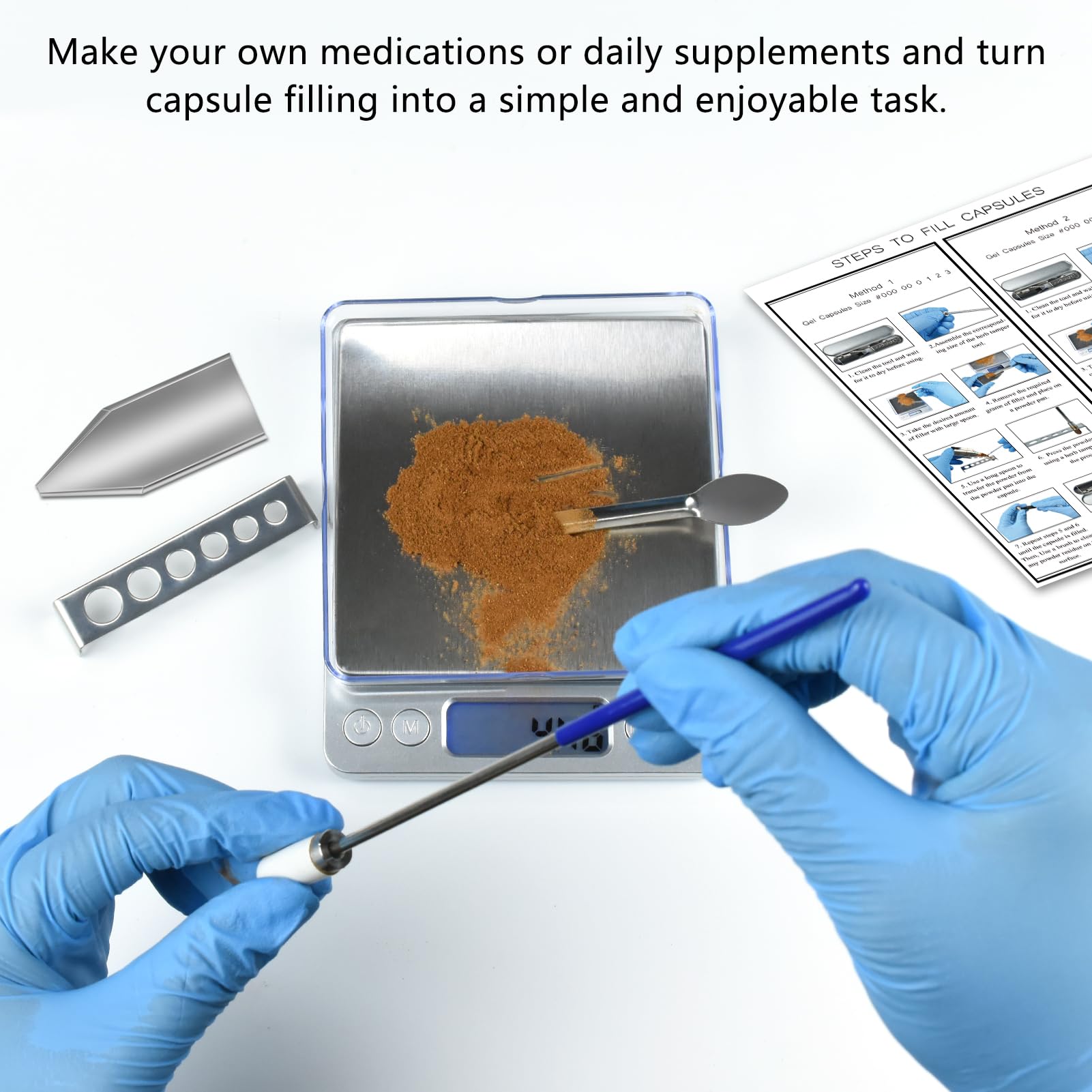 Suitable for All Common Capsule Sizes: This capsule filling tool is designed to work with six common capsule sizes: 000#, 00#, 0#, 1#, 2#, 3# 4# and 5#. Whether you are filling them with medication or supplements, this tool set fully meets your daily needs.