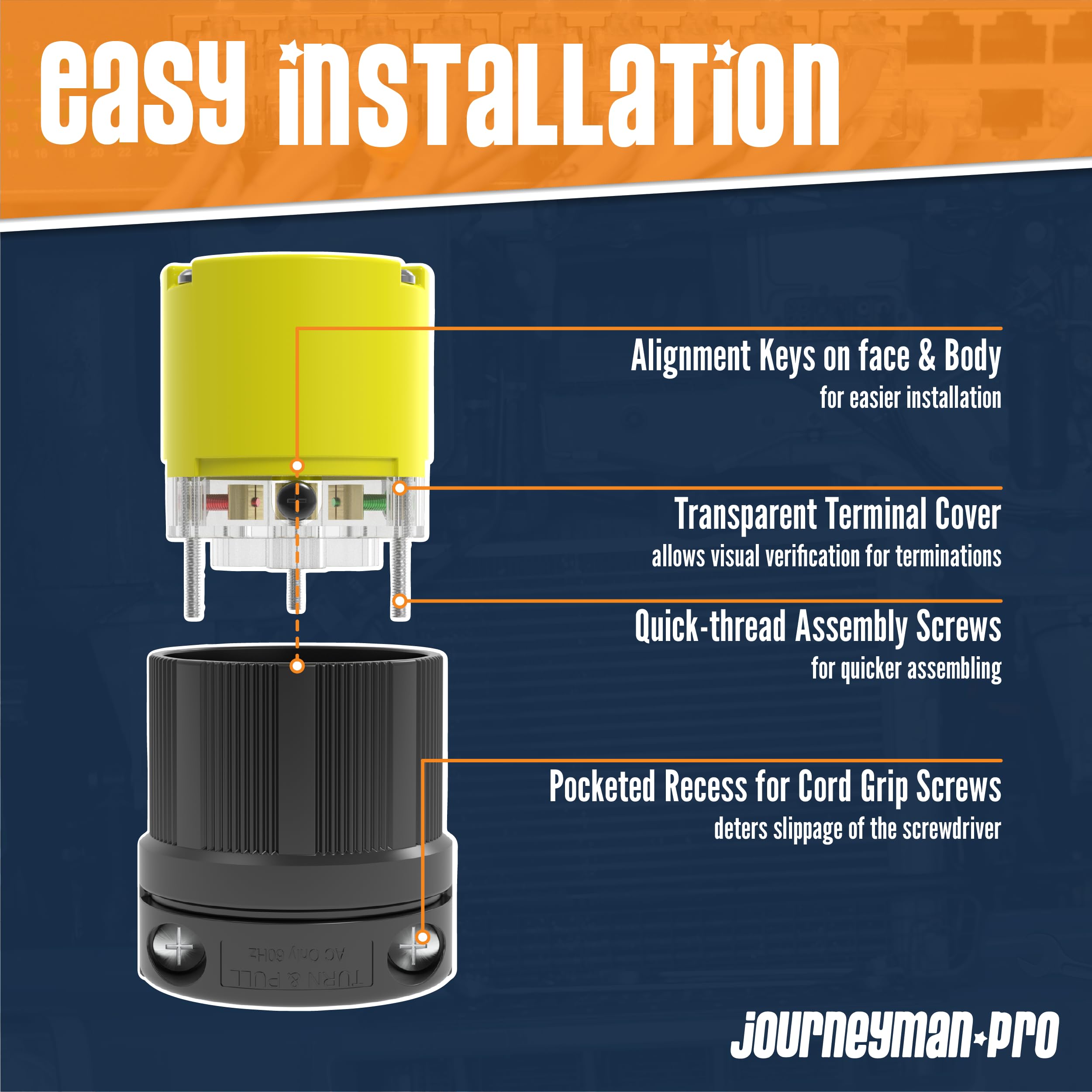 SET OF BOTH, HJP-2621 (L6-30P - MALE PLUG) & HJP_2623 (L6-30R FEMALE RECEPTACLE CONNECTOR) Twist Locking Male Plug & Twist Lock Female Receptacle Connector, Industrial Grade, Grounding - BLACK-YELLOW The Journeyman-Pro Series Industrial Grade Connector Features: + EXTRA THICK Nylon Construction that WON'T CRACK in high abuse applications. + Individual deep-funneled chamfered wire wells ,GUIDE each wire into rectangular chambers and the wire clamps BUNDLE STRANDED WIRE without cutting wire strands. + 30 AMP - 7500 WATTS 250 AC Volts RATED Terminal ID: Brass-Hot, Green-Ground, White-Neutral Terminal Accommodates: 14-8 AWG + NEMA L6-30P Plug & NEMA L6-30R Locking Receptacle (connector), Industrial Specification Grade, Grounding, 2 Pole, 3 Wire. + WORKS PERFECTLY for use with Generator Transfer Switches or Power Inlet Plug to supply power to your Home, Business, Marine/Boat or RV/Trailer. + MULTIPLE USES 7500 Watts, Perfect for Generators, Welders, Sump & Well Pumps <Add To Your Cart and Complete Your Project Now!