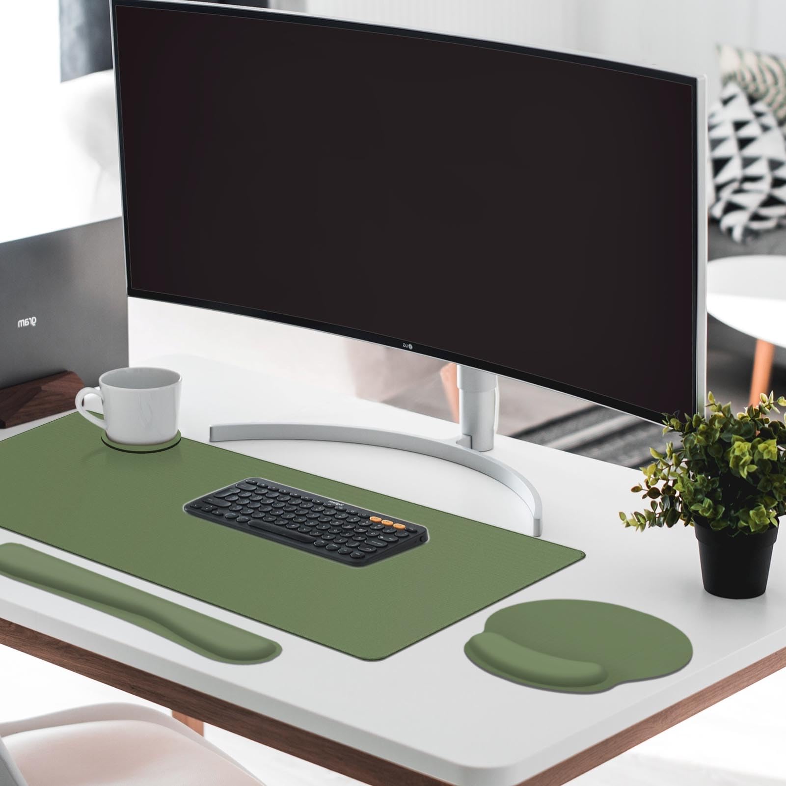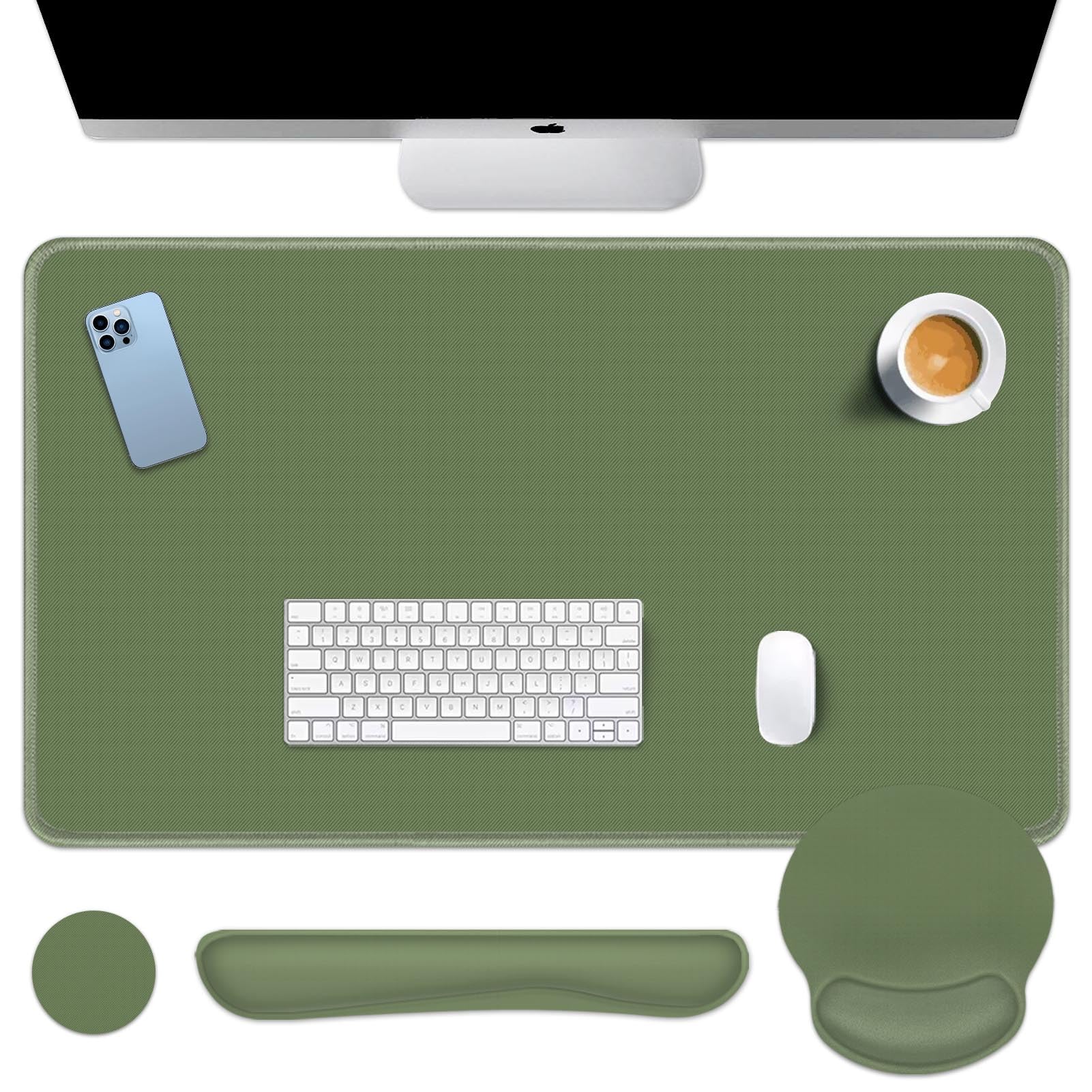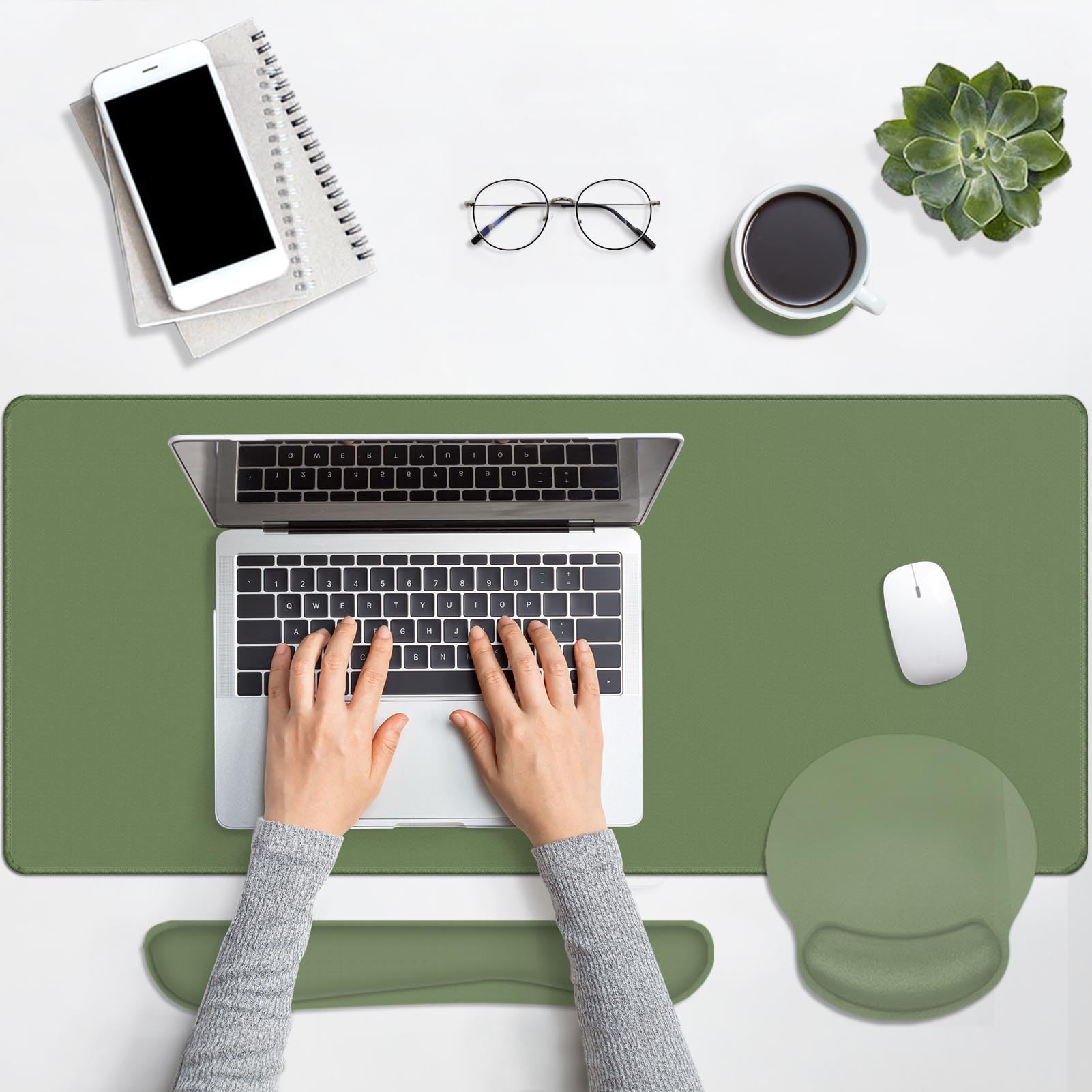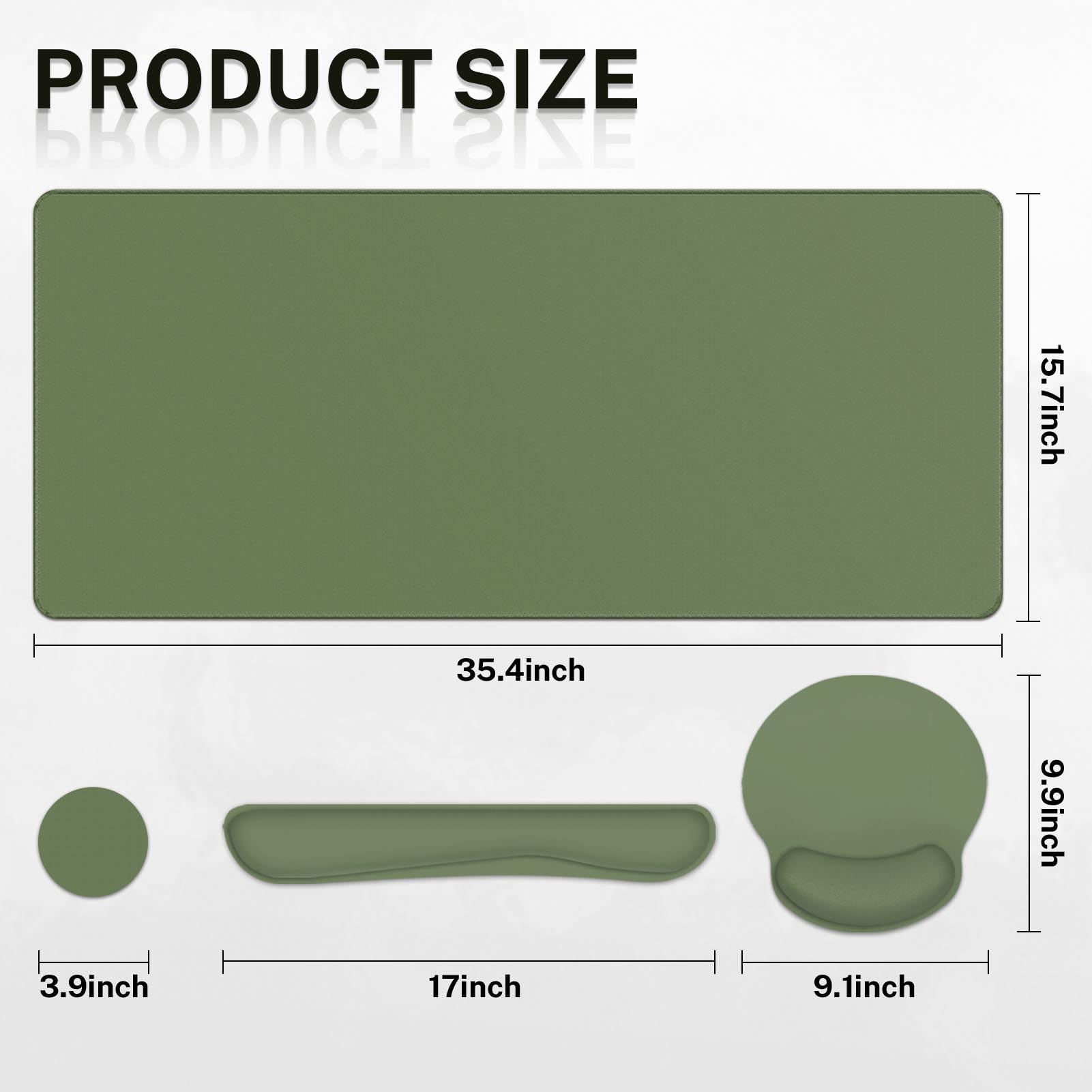 Comprehensive 4-in-1 Mouse Pad Set:This all-inclusive mouse pad set offers a large desk pad (35.4x15.7inch),a keyboard wrist rest (16.9x3.3inch),a mouse wrist rest (9.8x9.1inch),and a cup coaster (3.9x3.9inch).All these accessories come together at an incredible value,saving you the hassle and expense of separate purchases.This spacious desk pad can accommodate your mouse,gaming keyboard,and other desk essentials,while maintaining aclean.