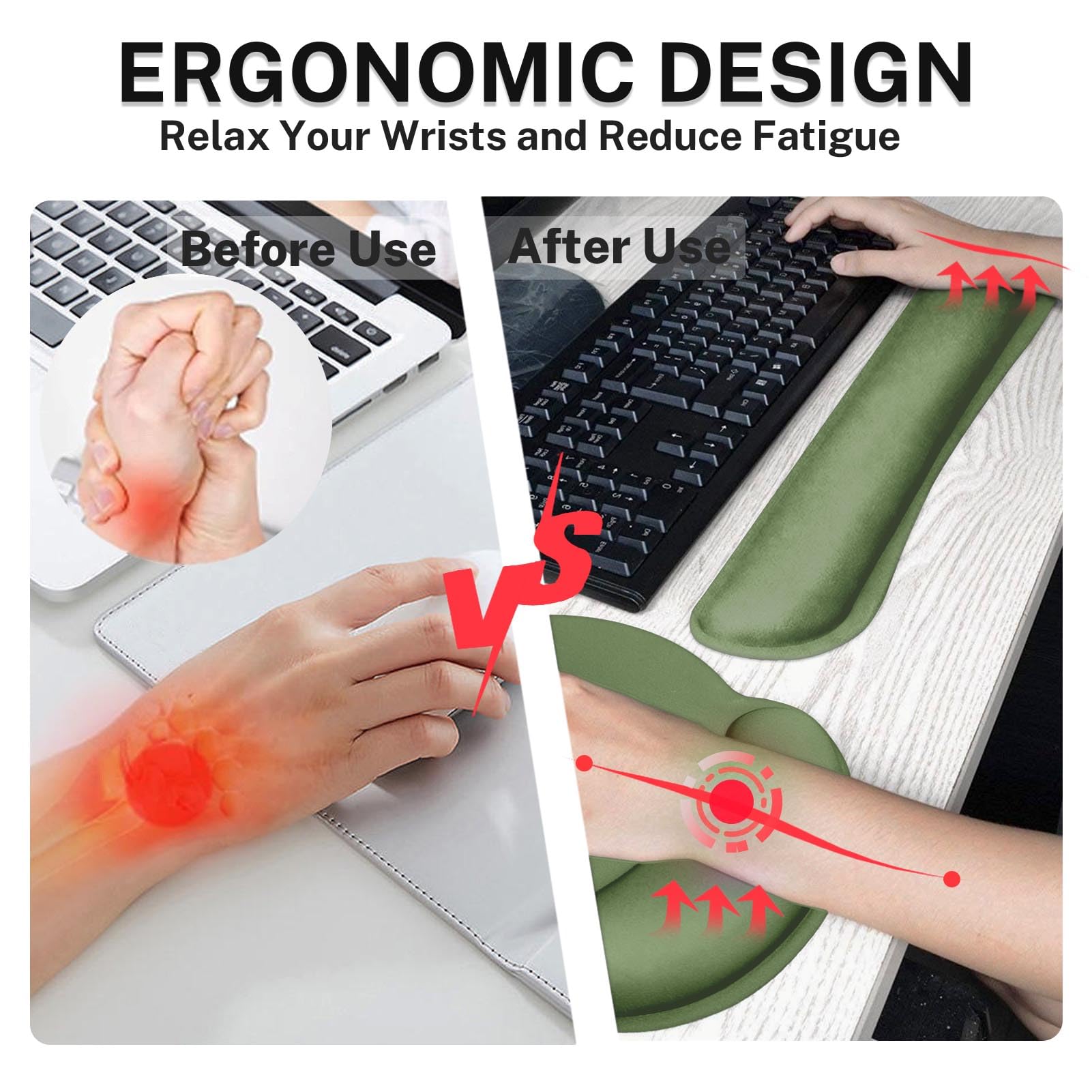 Ergonomically Designed for Comfort:The mouse pad and wrist support set are designed with memory foam and covered with a soft,smooth material,ensuring lightweight comfort and durability for your daily work life.They are ergonomically contoured to prevent soreness in your arms,wrists, and hands during long working or gaming sessions,thus significantly reducing stress and fatigue.