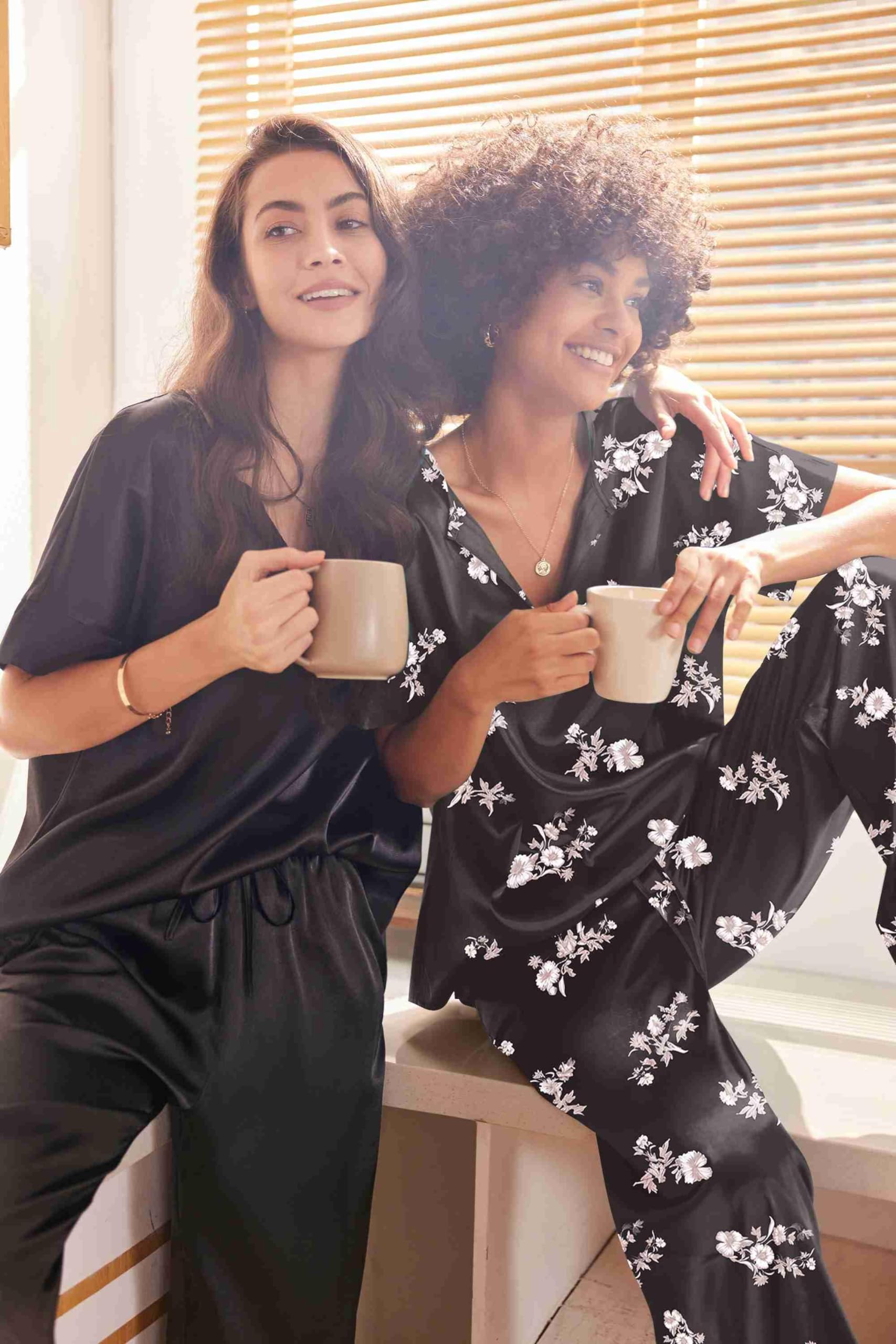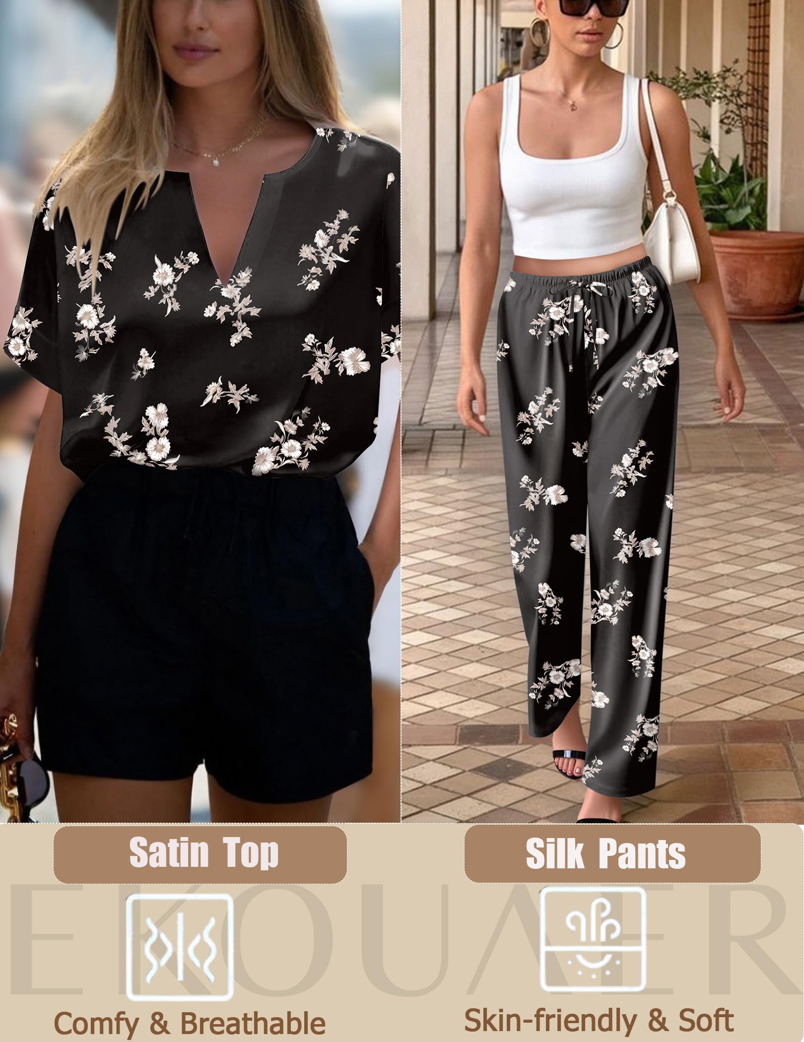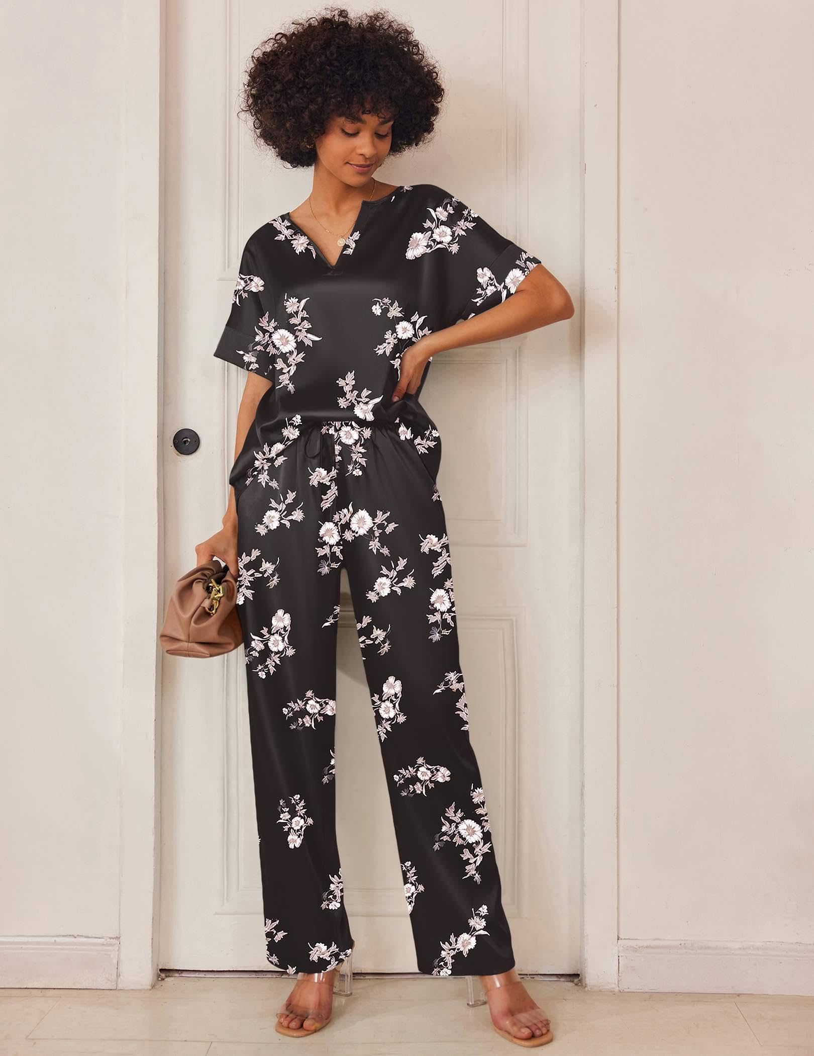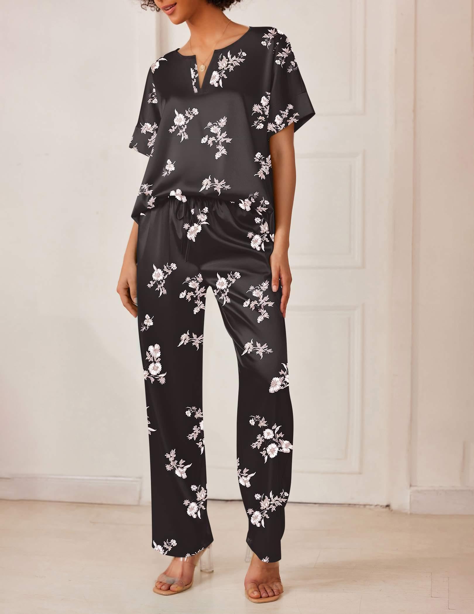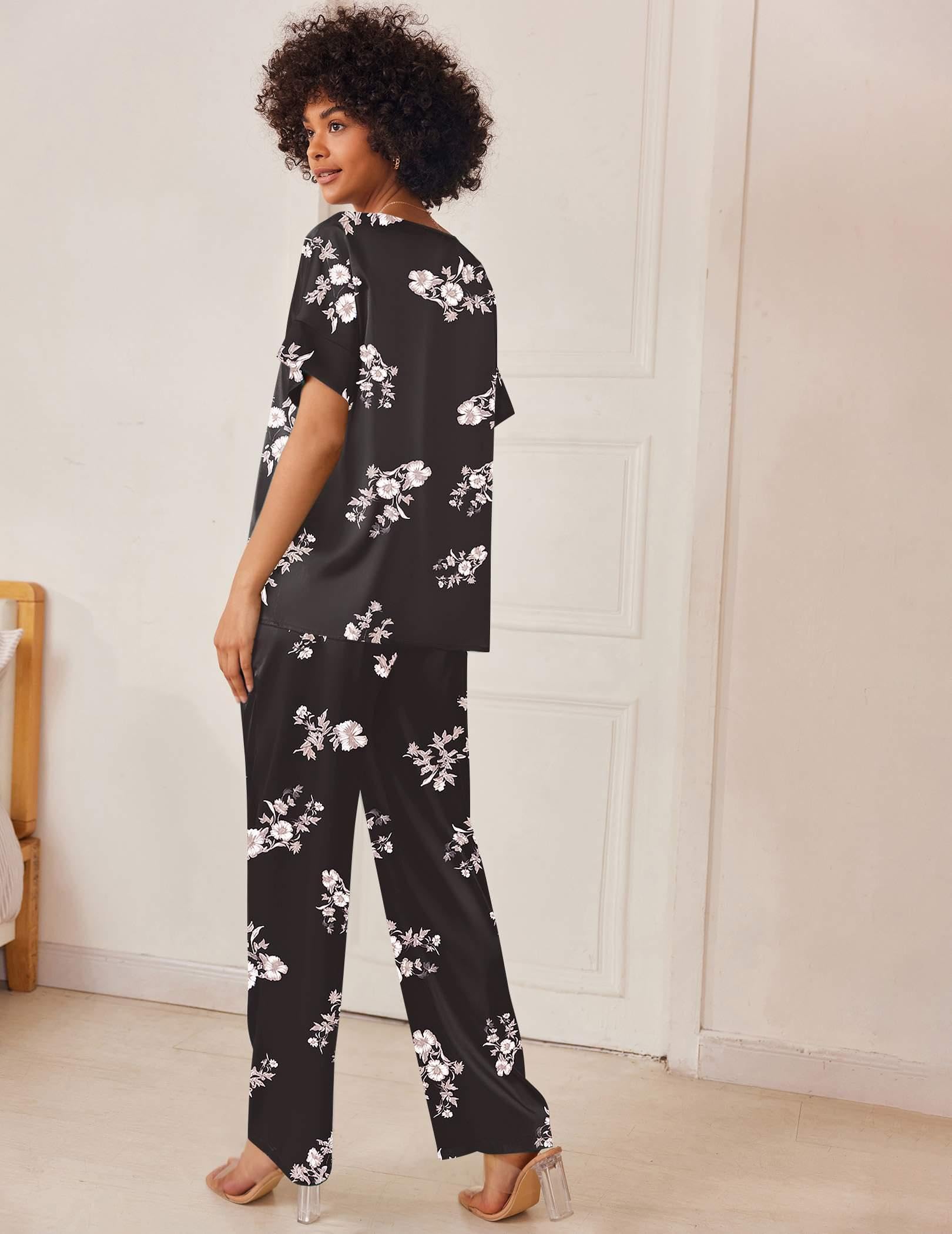 DESIGN&FEATURES: Top: Deep V-neck, short sleeve with wide sides. Pants: Relaxed fit wide legs long pants with high stretch elasticated trousers and 2 sides large pockets.Silk pajamas for women with popular designs makes your family wander more elegant
