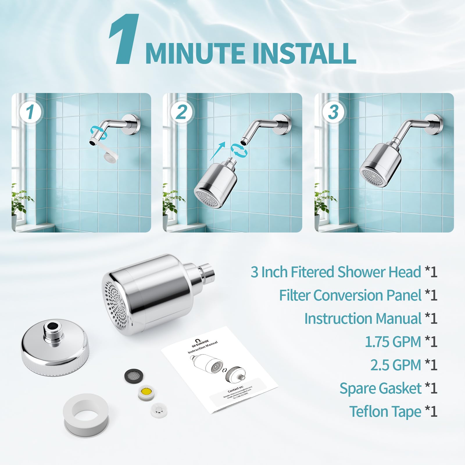 Packing list: Filter shower head * 1, User manual * 1, 1.75 GPM * 1, 2.5 GPM * 1, Spare gasket * 1, and Teflon tape * 1