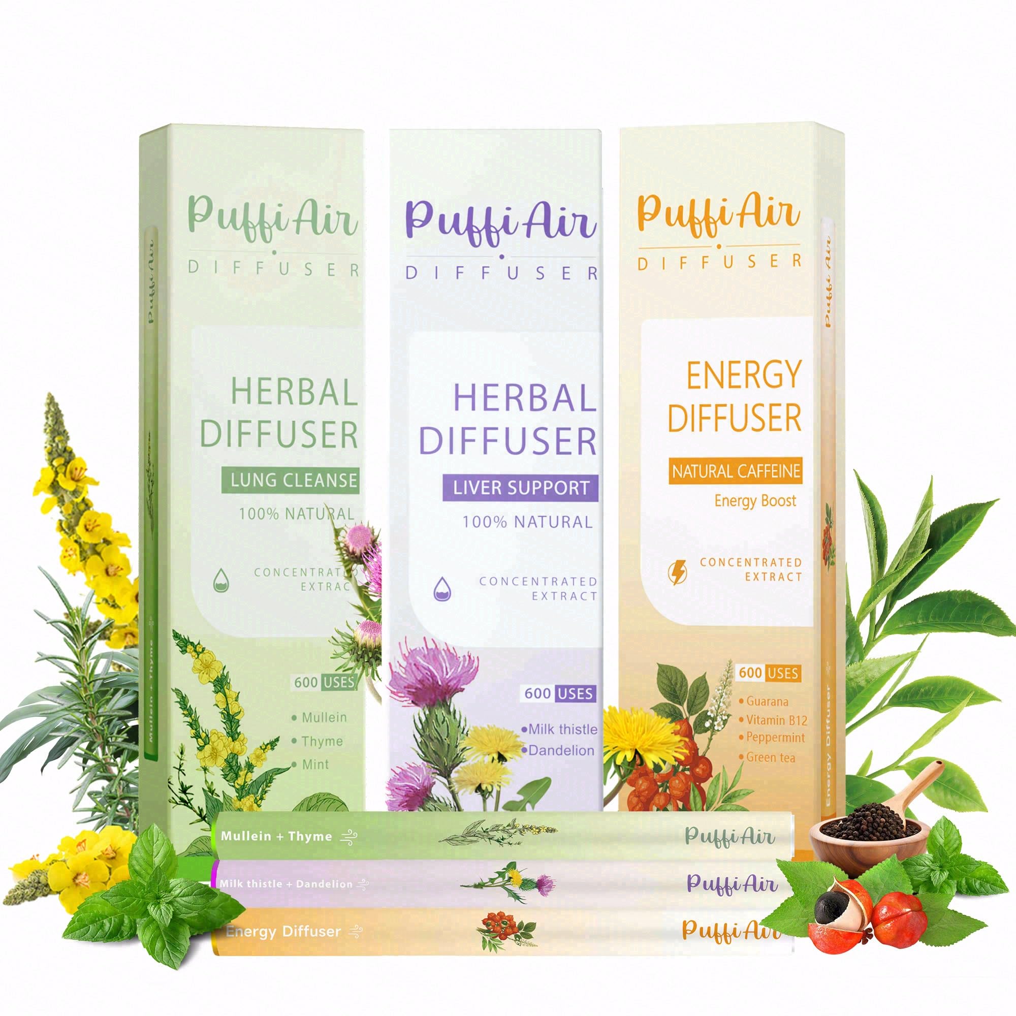 URBAN VITALITY TRILOGY: This trio builds an urban energy chain: Orange diffuser (Guarana, etc.) fuels work focus; green (Mullein, etc.) defends breathing on commutes; purple (Milk Thistle, etc.) helps metabolic balance. It forms an energy-protection-refreshment loop for city rhythms.