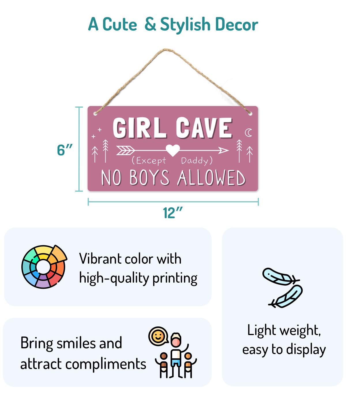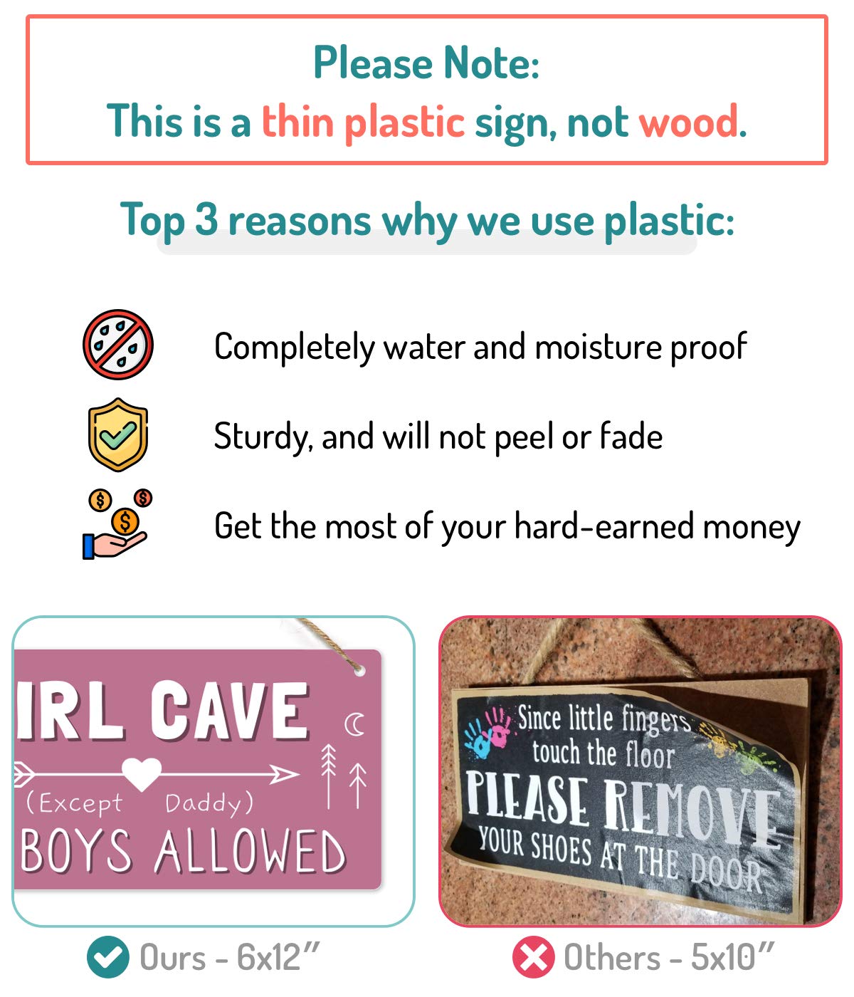 【WHAT YOU’LL GET 】Please note, this is a thin plastic sign, not wood. 1 piece of plastic girl cave sign. High-quality PVC waterproof printing. Dimension: 12x6 inches. 0.04 inches thick, slightly thicker than a standard credit card.