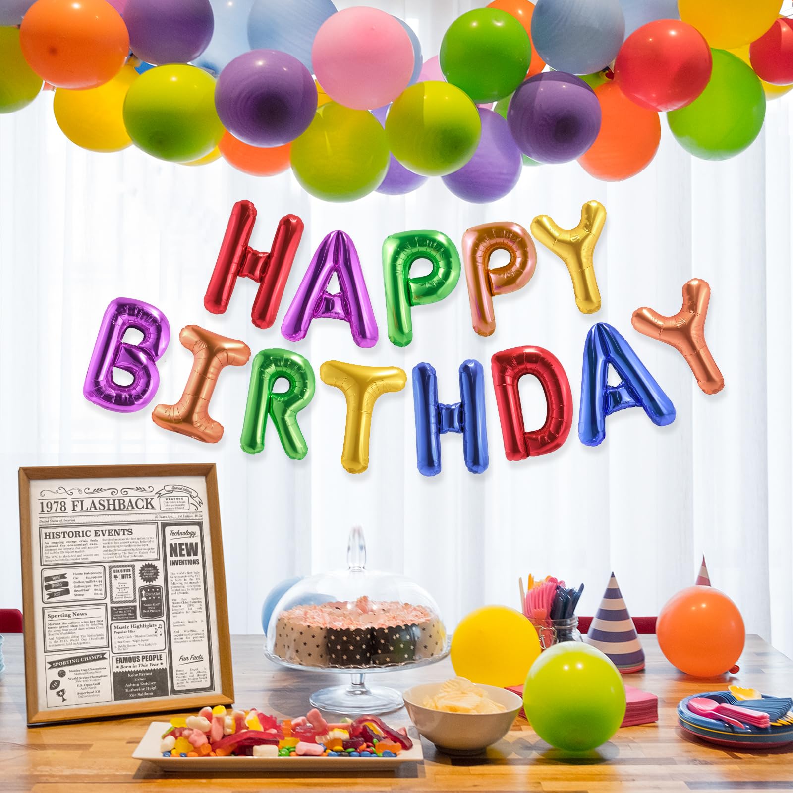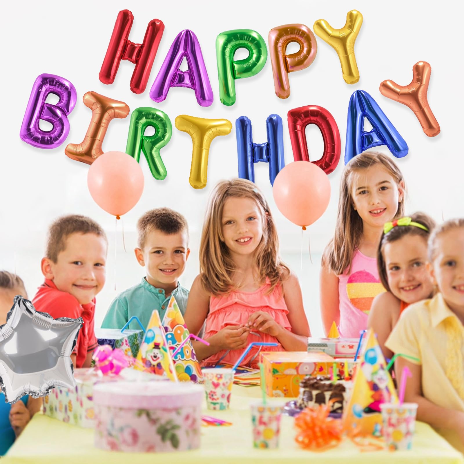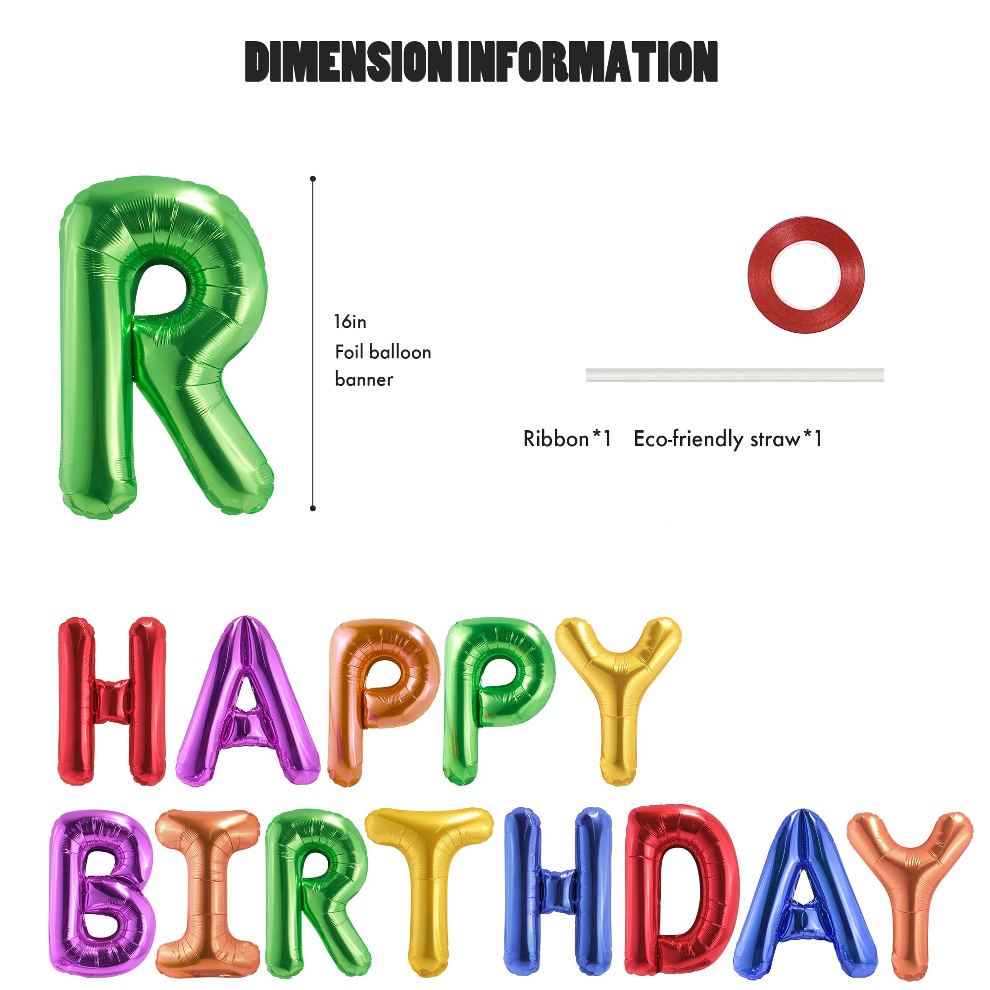 🎈 Package Included:16 inch Rainbow foil letter happy birthday balloons.Each package come with 13 pcs independent letter balloons which can be combined into "HAPPY BIRTHDAY",2 pcs straw and ribbon.