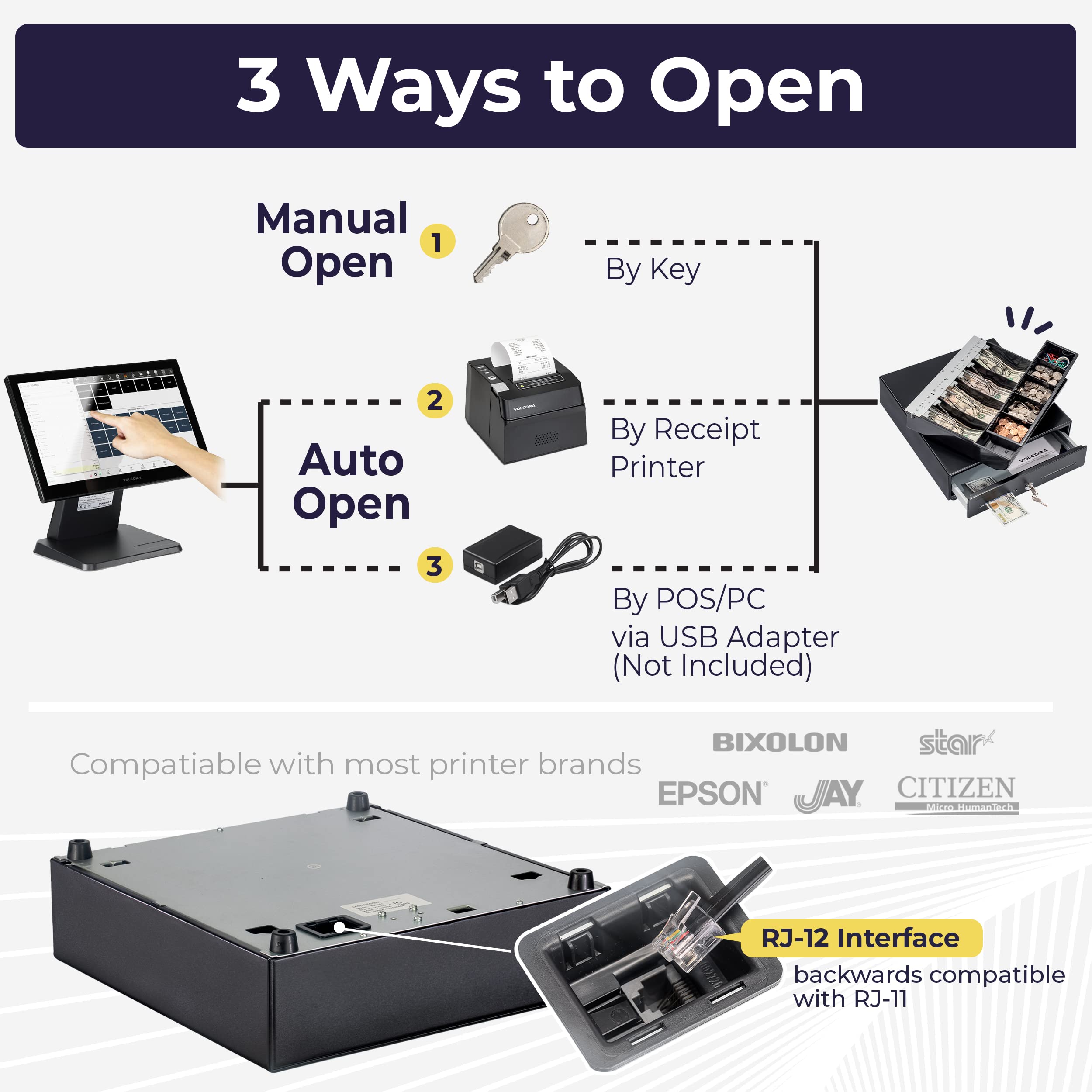 Connection: RJ11/RJ12 (Drawer Kick interface or DKD), compatible with most major Point of Sale (POS) systems and receipt printers / thermal printers, such as Star, Citizen, JAY, Bixolon and etc. RJ11/RJ12 interface cable is included.