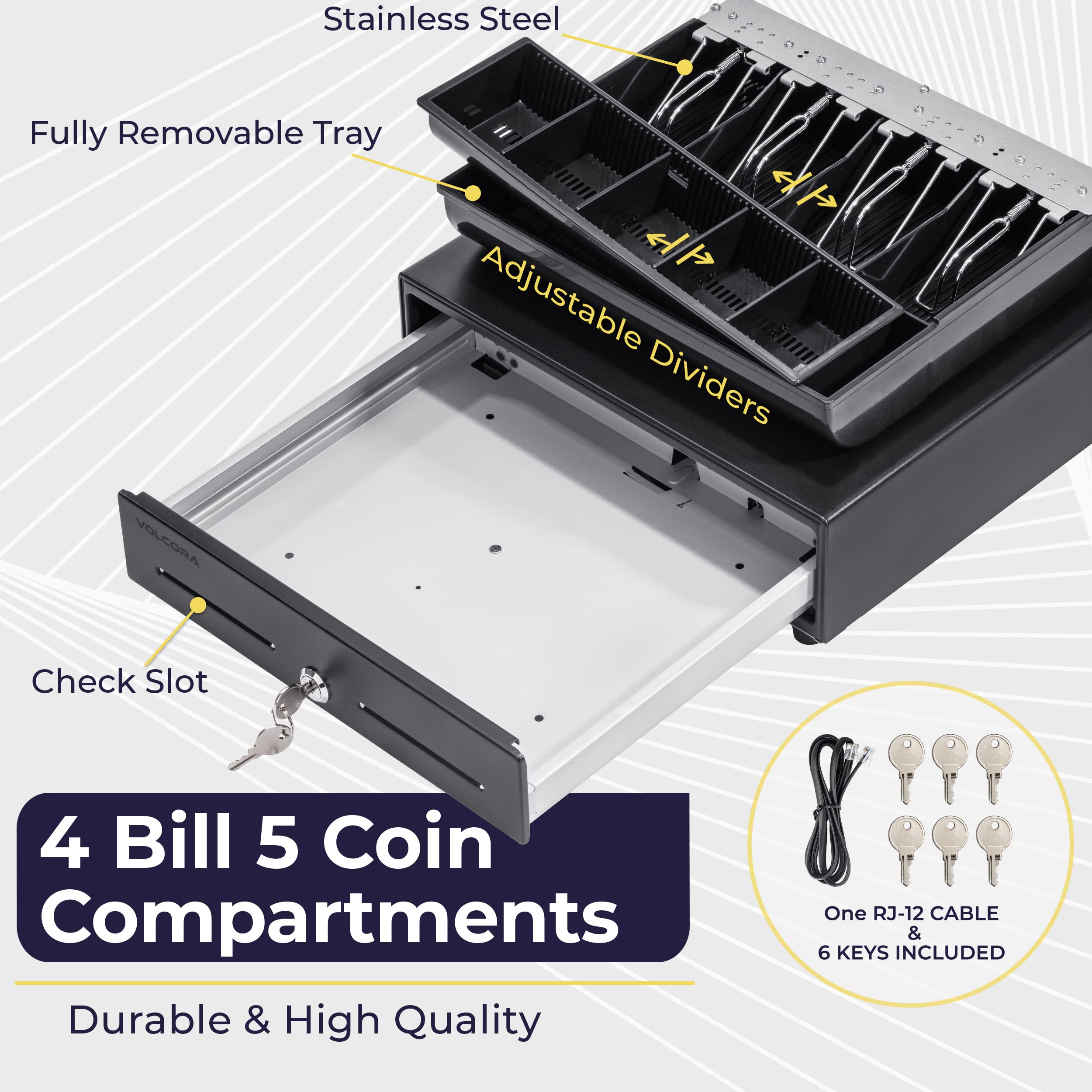 Secured with 3-position key lock: 1-manual open, 2-auto open by printer/POS, 3-lock. Package includes 6 keys for additional backup.