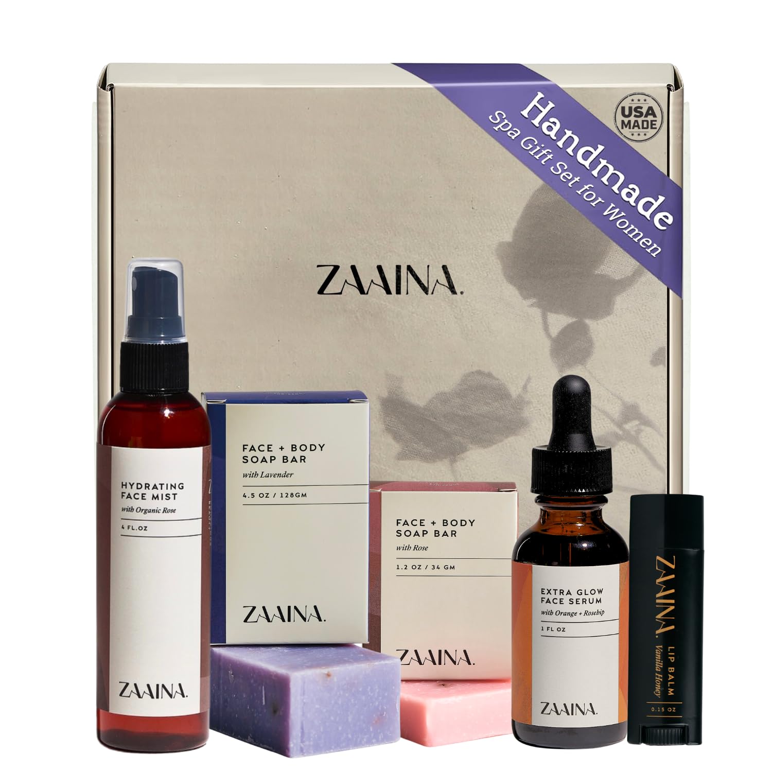 COMPLETE SPA GIFT SET: Indulge in a deluxe womens spa gift set with face mist, glow serum, lavender and rose soaps, and lip balm. Enjoy a relaxing self care ritual at home anytime.