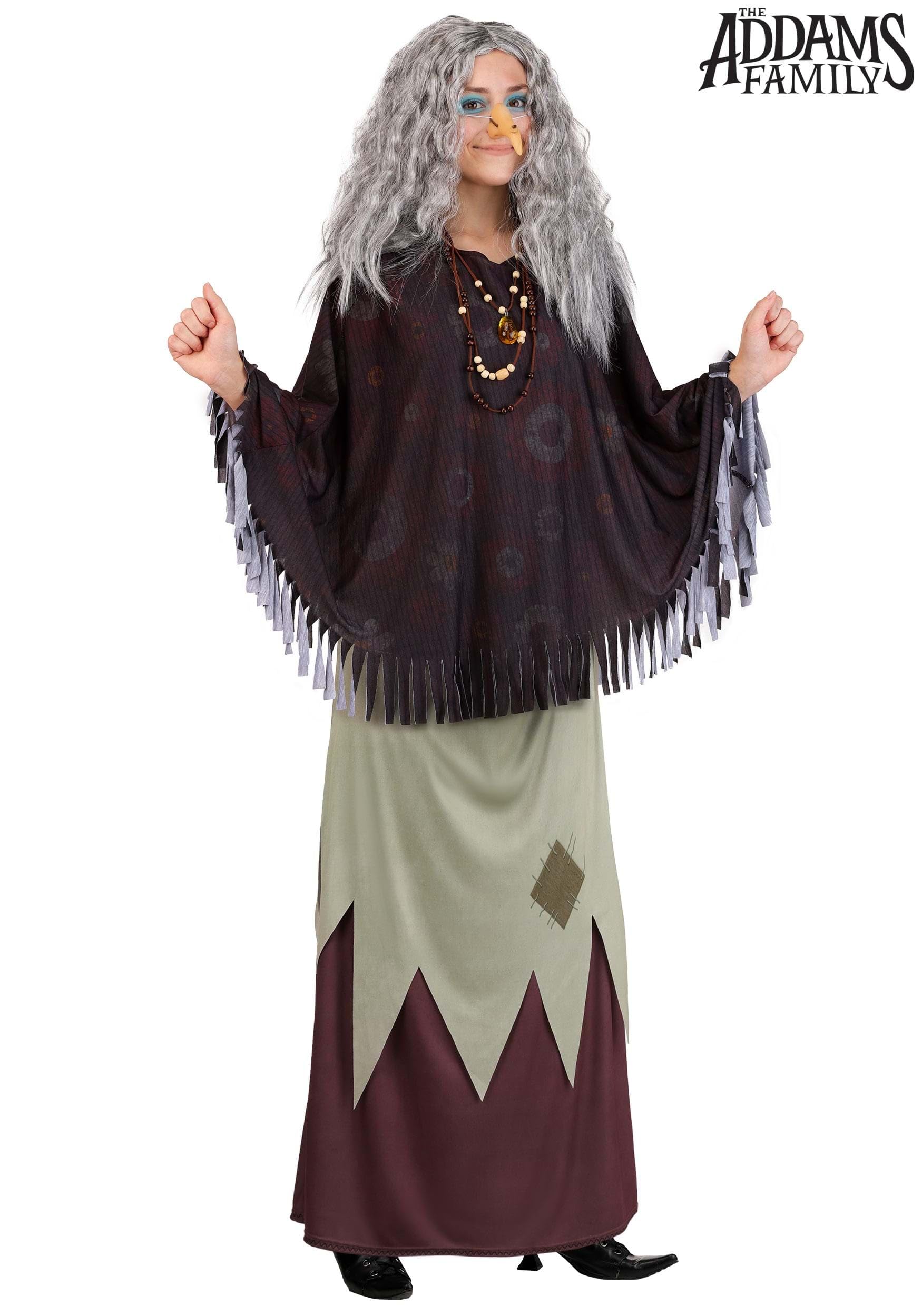 Description Transform yourself into the whimsical and enchanting character of Grandmama from the adored animated Addams Family movie with this 2019 Addams Family Grandmama Women's Costume. This ensemble is more than just a costume; it's an invitation to explore the intriguing world of the Addams Family. Embrace your inner witch with this unique attire featuring a multi-layered look designed to captivate and amuse everyone around you. The outfit is anchored by a dress with an empire waist and an elastic waistband, which ensures comfort and ease as you channel Grandmama's mystical energy. The jagged edges of the dress create a mysterious aura, heightened by the ornate designs on the poncho, which includes trendy fringe detailing for that added flair. Step into Grandmama's shoes and immerse yourself in storytelling, whether you're spicing up a family gathering, unleashing fun at a themed event, or even adding a touch of quirky magic to a cosplay convention. The latex nose and gray curly wig complete your transformation, each piece designed to capture Grandmama's signature animated look. With an elastic band for a secure fit, these accessories are perfect for a costume party, Halloween festivity, or a group outing portraying the entire Addams crew. The multifaceted nature of this costume doesn't stop at Halloween. Use it for theatrical performances, community events, or simply add it to your collection of iconic dress-up options at home. The layered necklace with beads adds the final touch to your ensemble, perfect for conjuring magical vibes wherever your adventures take you. So, whether casting spells in a reenactment or simply stirring up delightful trouble, this outfit is designed to keep the Addams Family spirit alive and wonderfully weird. It's an opportunity to join the ranks of this quirky family, ensuring laughter and a dash of eeriness follows wherever you go. NOTE: THIS ITEM IS NOT RETURNABLE IF YOU HAVE OPENED THE PACKAGE - Dress - Poncho - Latex Nose - Necklace - Wig