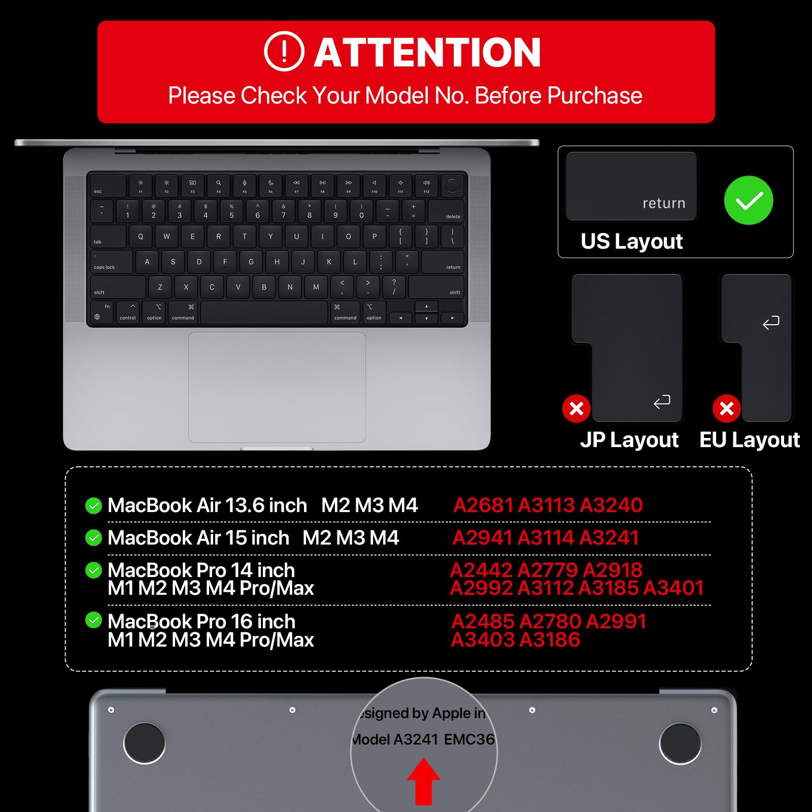 Designed for 2021+ Apple Silicon M1/M2/M3/M4/M5 Pro/Max MacBook Pro 14"/16", 2022+ M2/M3/M4 MacBook Air 13"/15", US Keyboard Layout Only