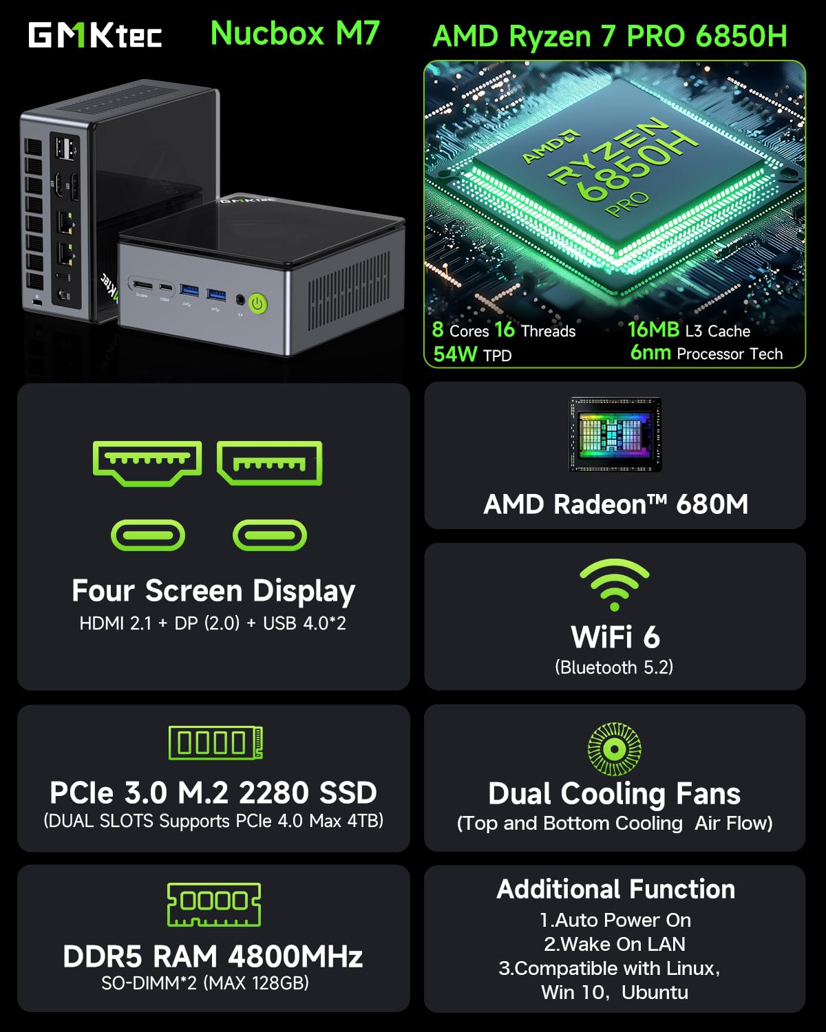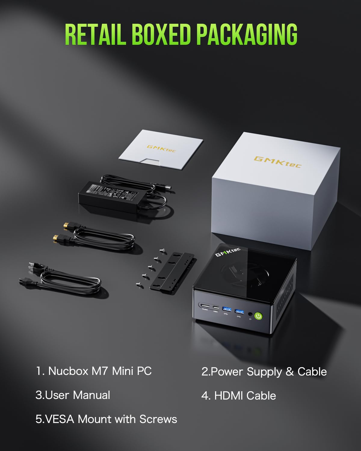 【16GB DDR5 Dual Channel RAM & 512GB PCIe SSD Dual Slot Expansion】Installed with DDR5 16GB RAM 4800MHz (Dual Channel 2x8GB), the Nucbox M7 mini pc support expansion to 128GB RAM. Featured with 512GB M.2 2280 PCIe 3.0 SSD, supports dual slot expansion to 2*PCIe 4.0 2TB SSD up to 4TB. (Upgrades not included)