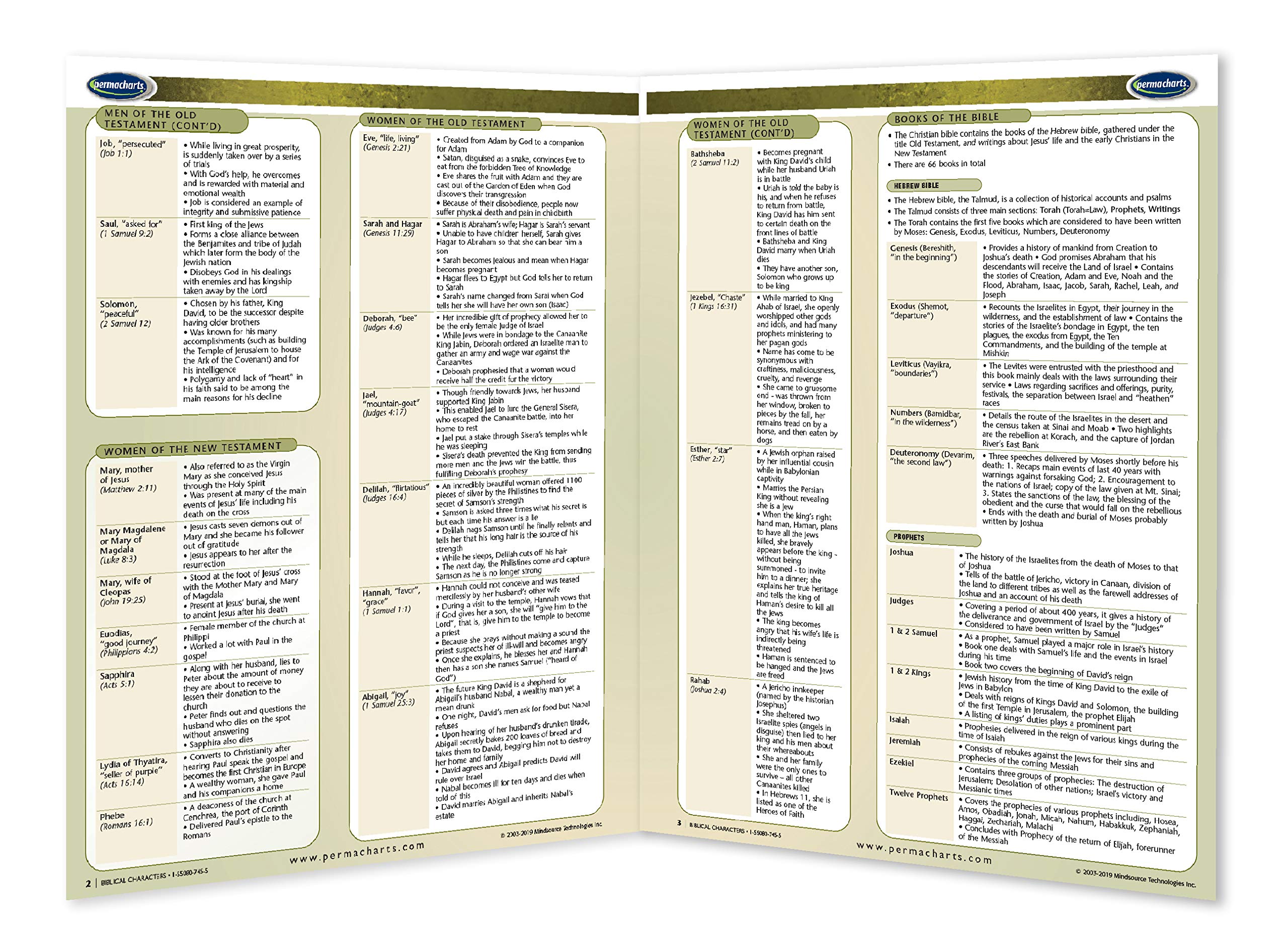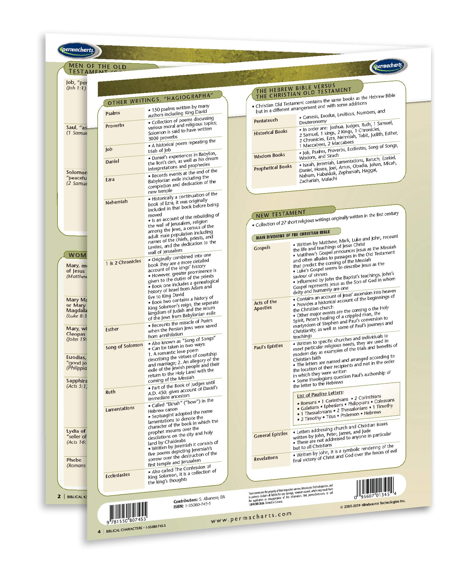 This informative 4-page laminated Guide is a comprehensive quick reference to all of the key characters developed in the bible narrative. This fact-filled quick reference study guide develops both the chronology and the thematic relationships between the great Biblical characters of both the Old and the New Testaments. Male and female characters are given their distinct significance, relative to both the Jewish and Christian traditions. The relationship between Biblical characters and other sacred writings such as the Psalms and the Song of Solomon is also explained.