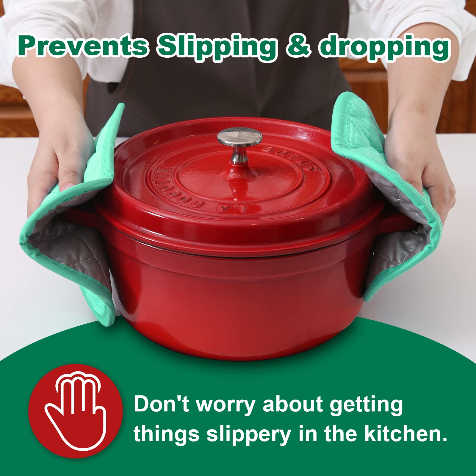 QUILTED AND PADDED - Heat resistant up to 400 degrees allowing safe removal of baking dishes and cast iron from the oven and hot pots from the stove.