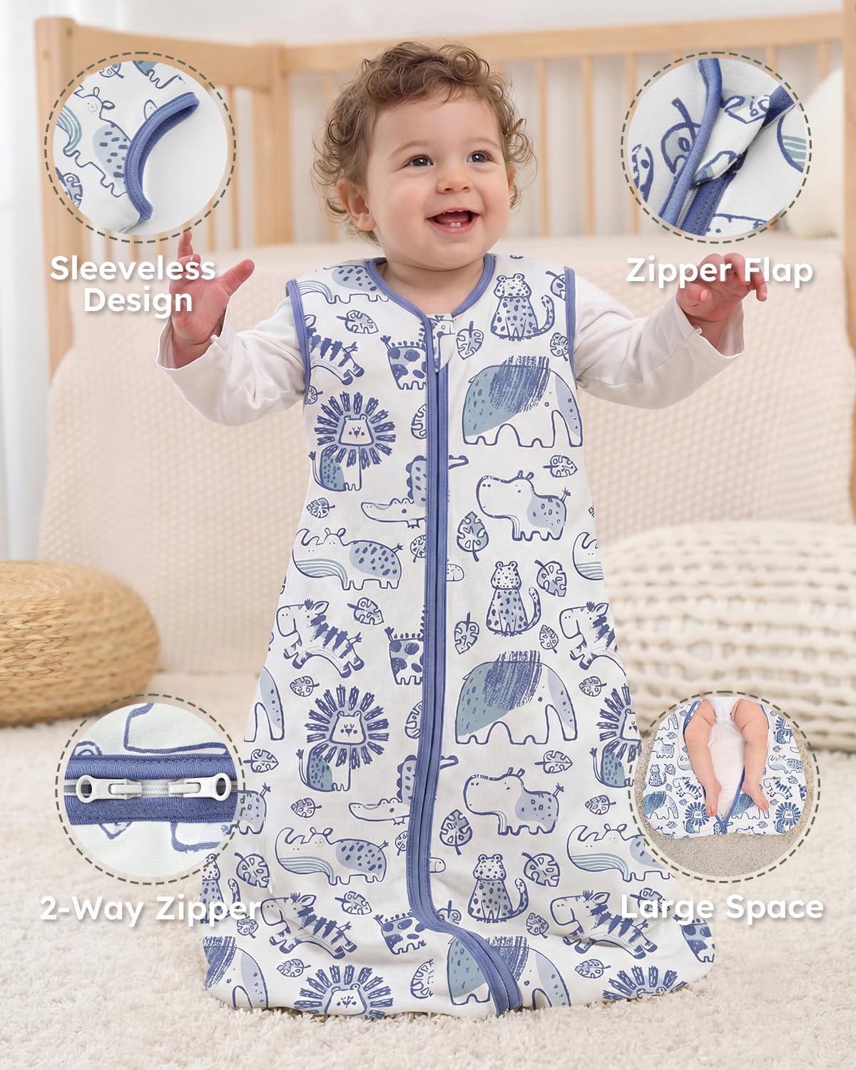 Large Space & Sleeveless: The ergonomically designed baby wearable blanket features a bell-shaped bottom to promote healthy hip joint development, spacious space allow baby to move more freely and stay comfortable while they sleep. Sleeveless design provides for greater flexibility and comfort, better regulates your baby's temperature and reduces the risk of over-heating.
