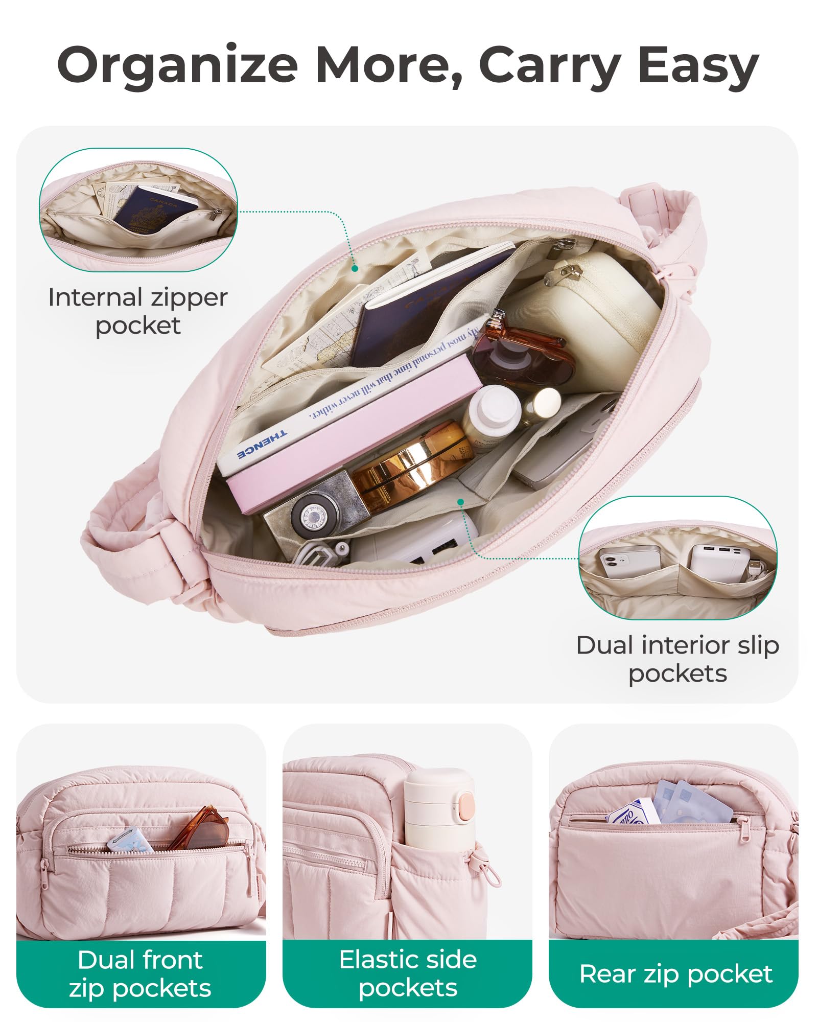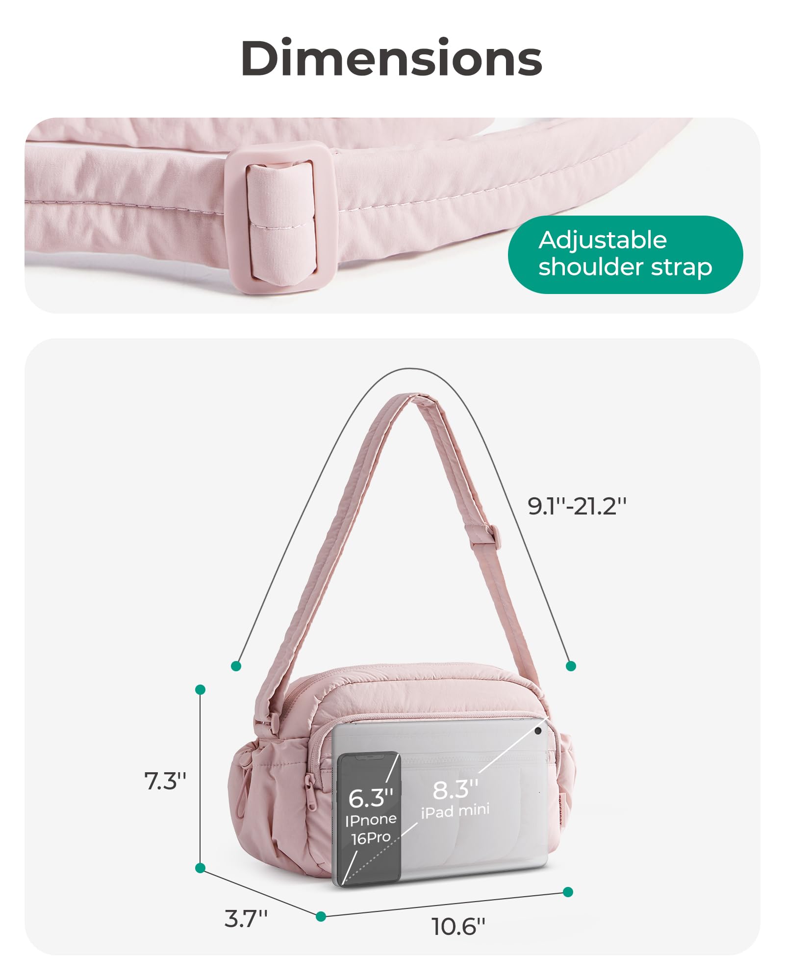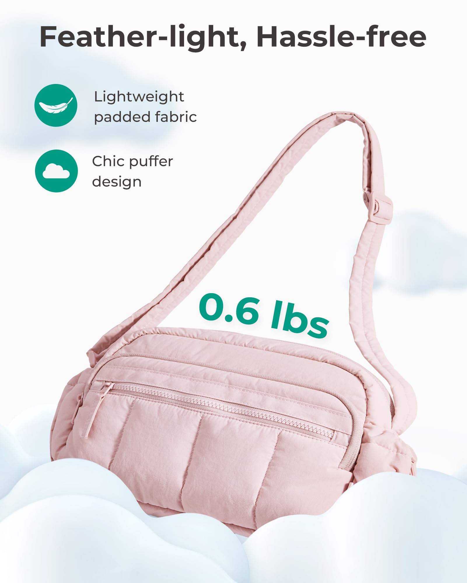 Material & Size: Lightweight & water-resistant puffy travel purse (just 0.6lbs)! Compact size 10.6''x3.7''x7.3'' with 4.7L capacity - perfect daily essentials