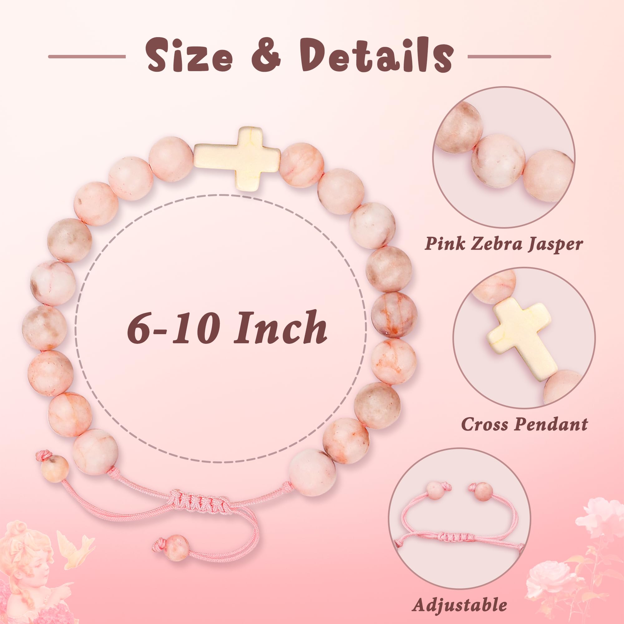 Adjustable Size: This cross charms for bracelets features 8.5mm natural stones and can be adjusted to fit wrist sizes ranging from 6 to 10 inches, making it an ideal gifts for girls age 3-16. This pink zebra stone cross bracelet is meticulously crafted from high-quality natural materials, ensuring low allergenicity and durability. The handcrafted flexible and sturdy knots allow adjustment and comfort
