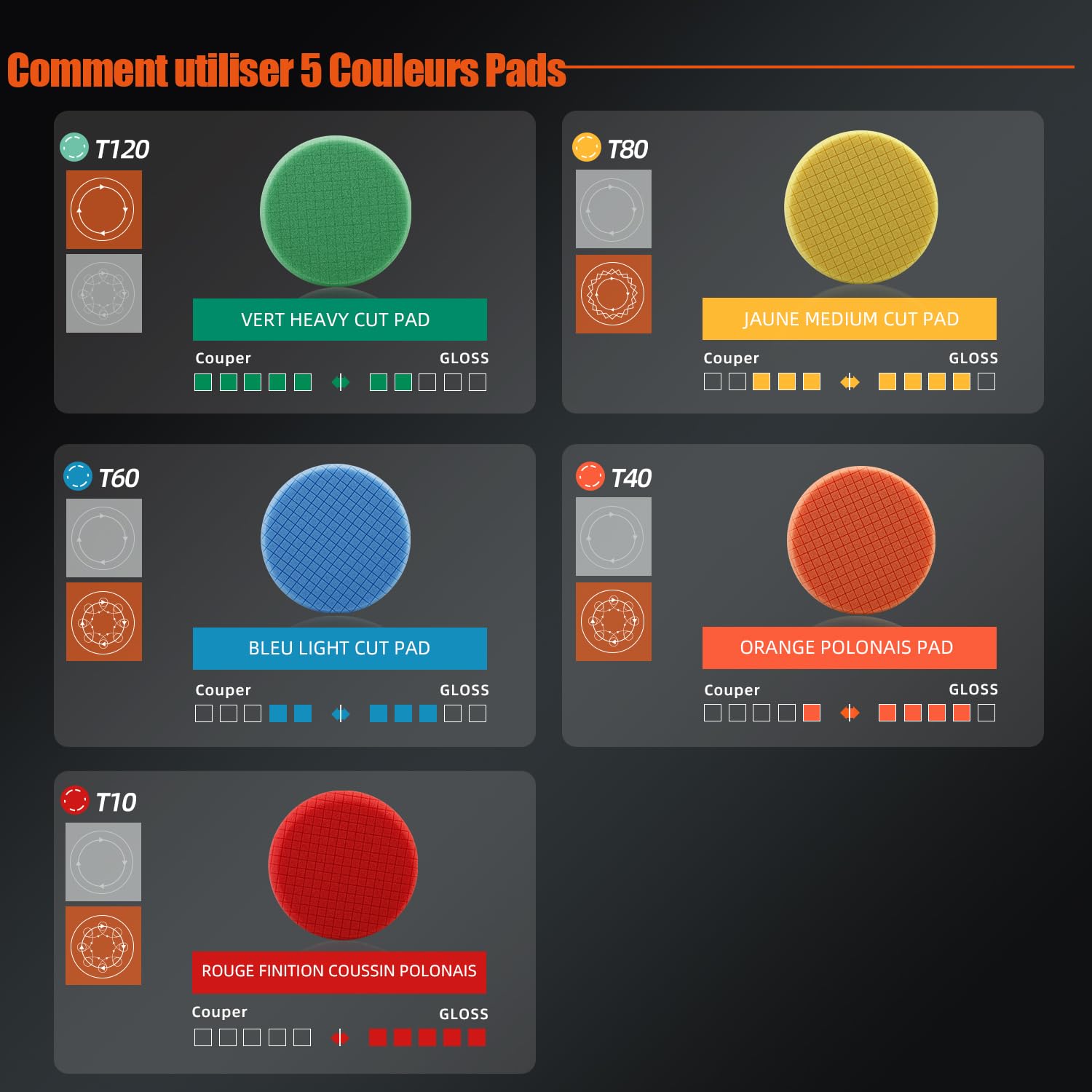 [T40 Orange Medium-Cut Polishing Pad]: T40 Orange Medium-Cut Foam Pad is Light Cutting Pad, It's Can Remove 2000# Sanding Disc Marks, Fine Scratches & Light Oxidation, It's Can Work With SPTA Medium Cut Polishing Compound ,Ideal For Rotary And DA Car Polisher.