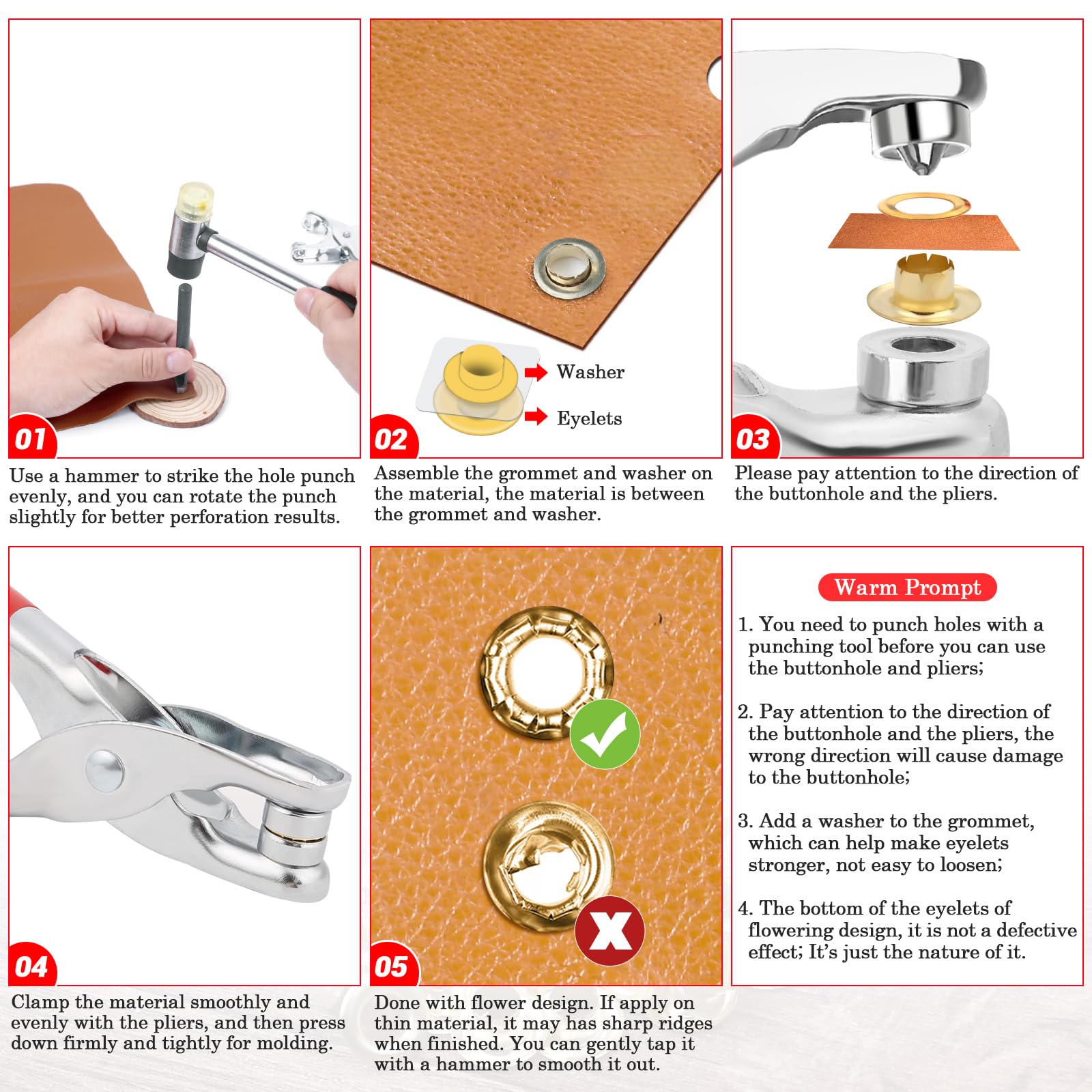 Comes with Use Manual - This 12mm (inside hole size, slightly less than 1/2 inch, An error range of 0.1 mm to 0.3 mm is normal.) eyelet pliers kit comes with a detailed graphic version user manual that can help your DIY works more easily and efficiently. Please pay attention to the direction of the buttonhole and the pliers, the wrong direction will cause damage to the buttonhole
