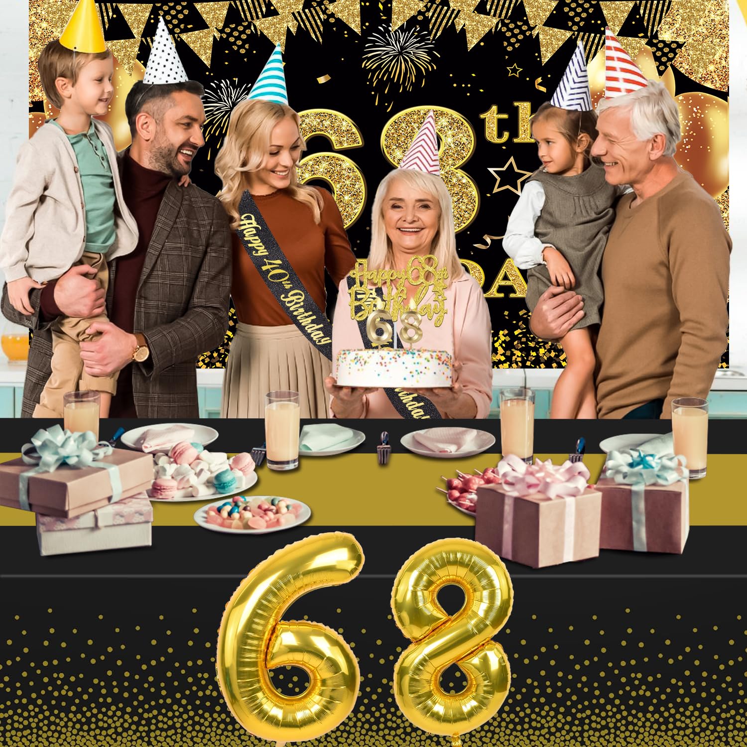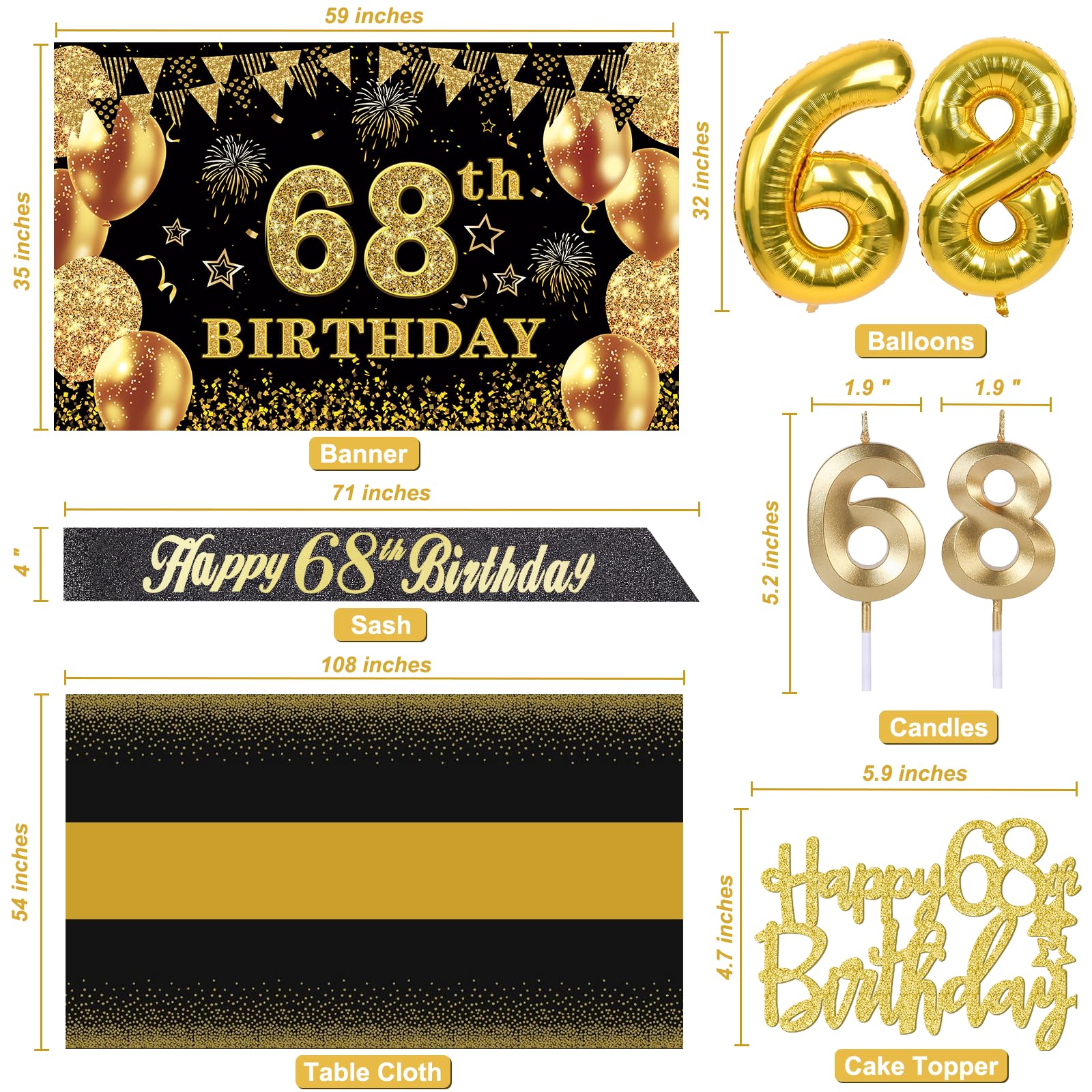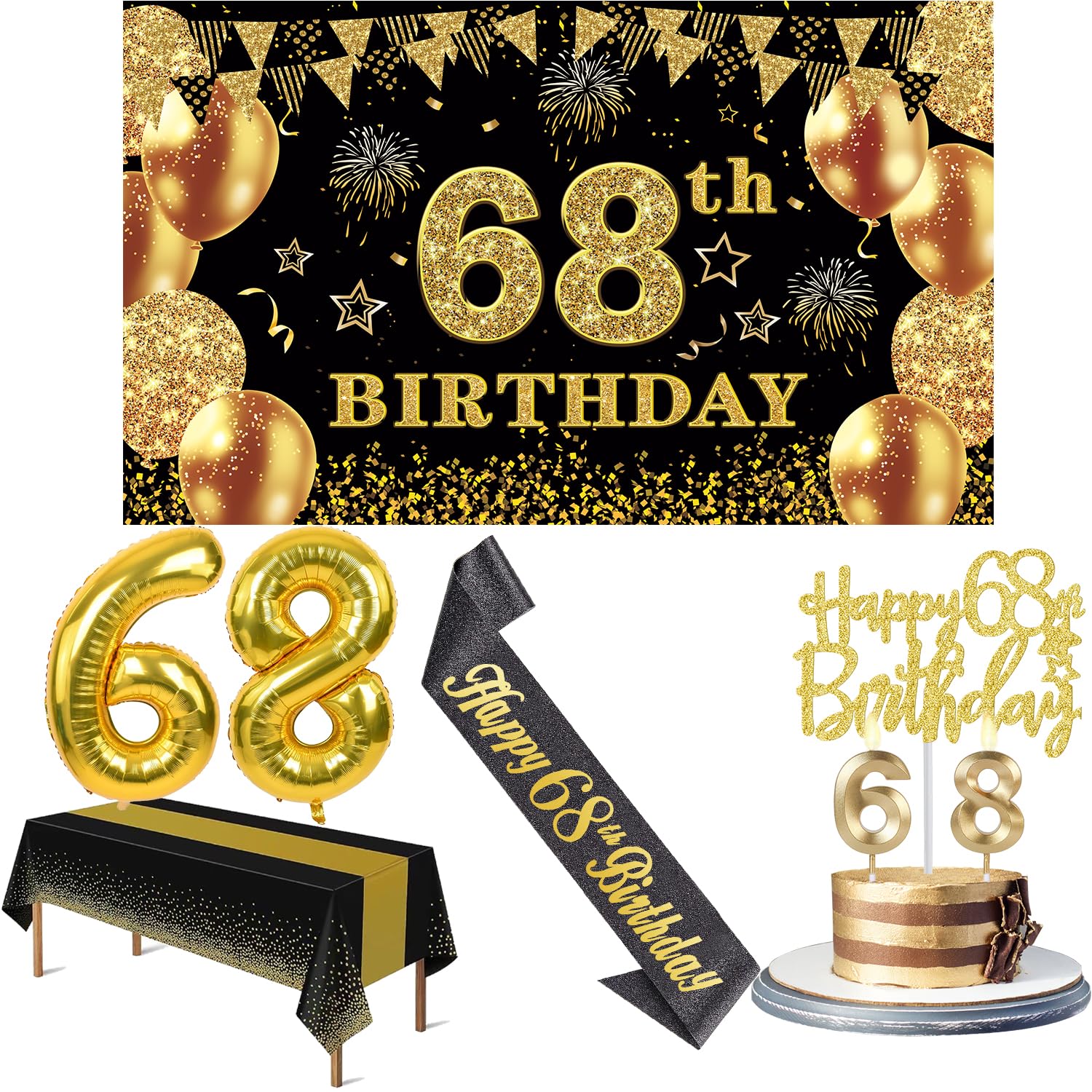 68th Birthday Decorations Kit: Packing coming with Large 68th Birthday Banner x 1pc, Big Gold 68th Birthday Balloons x 1set, Black and Gold Table Cloth x 1pc, Black Glittery with Gold Foil Words Happy 68th Birthday Sash x 1pc, Happy 68th Birthday Cake Topper x 1pc, Gold Number 68 Candles x 1set. This Value Black and Gold Party Decorations Set Meet Your Every Needs and Expects in 68th Birthday Milestone