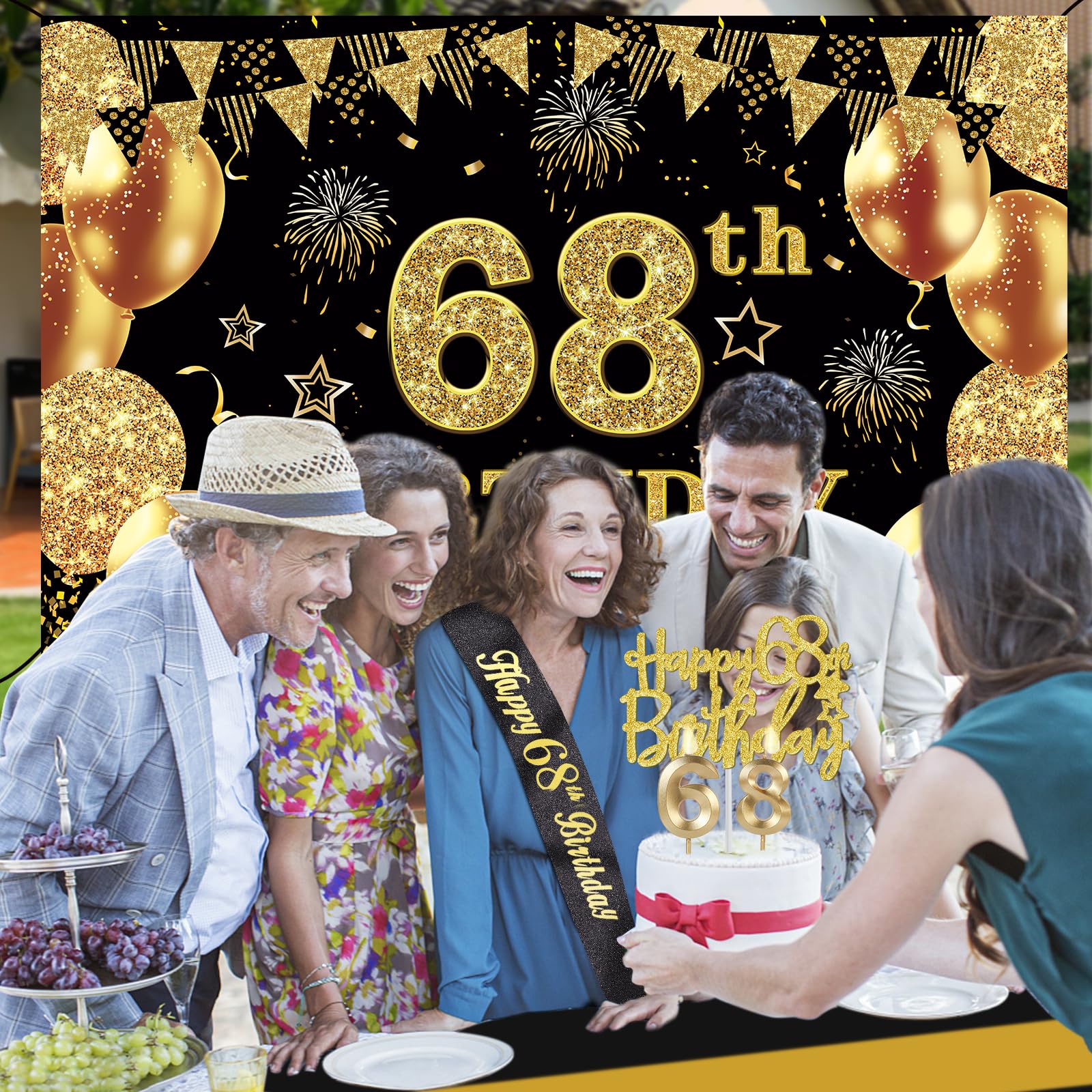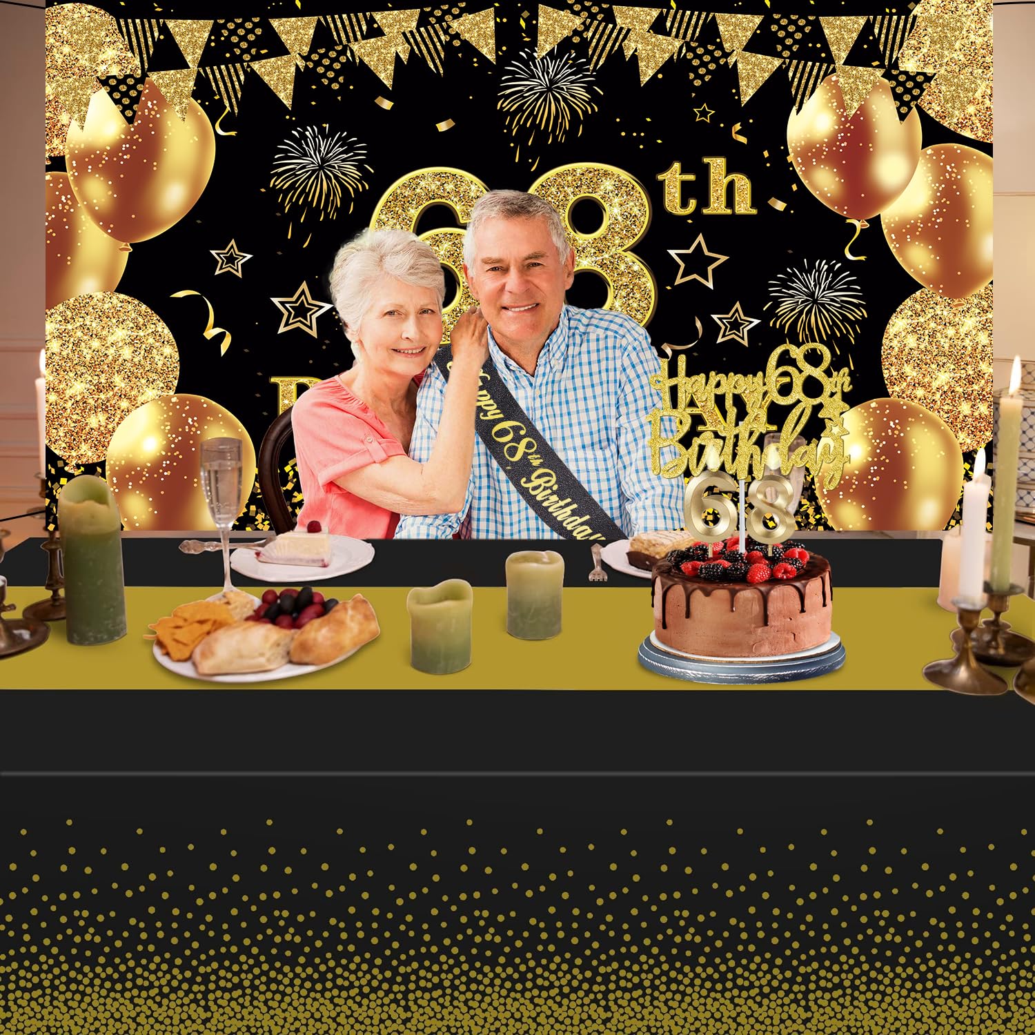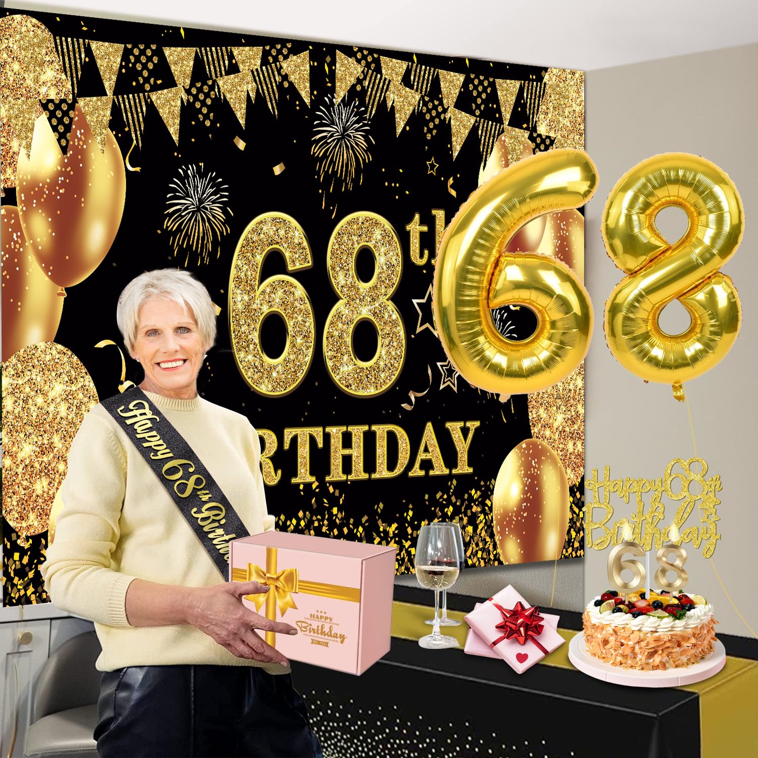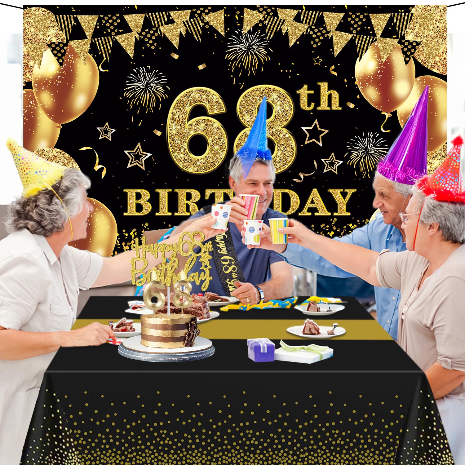 68th Birthday Decorations Kit: Packing coming with Large 68th Birthday Banner x 1pc, Big Gold 68th Birthday Balloons x 1set, Black and Gold Table Cloth x 1pc, Black Glittery with Gold Foil Words Happy 68th Birthday Sash x 1pc, Happy 68th Birthday Cake Topper x 1pc, Gold Number 68 Candles x 1set. This Value Black and Gold Party Decorations Set Meet Your Every Needs and Expects in 68th Birthday Milestone