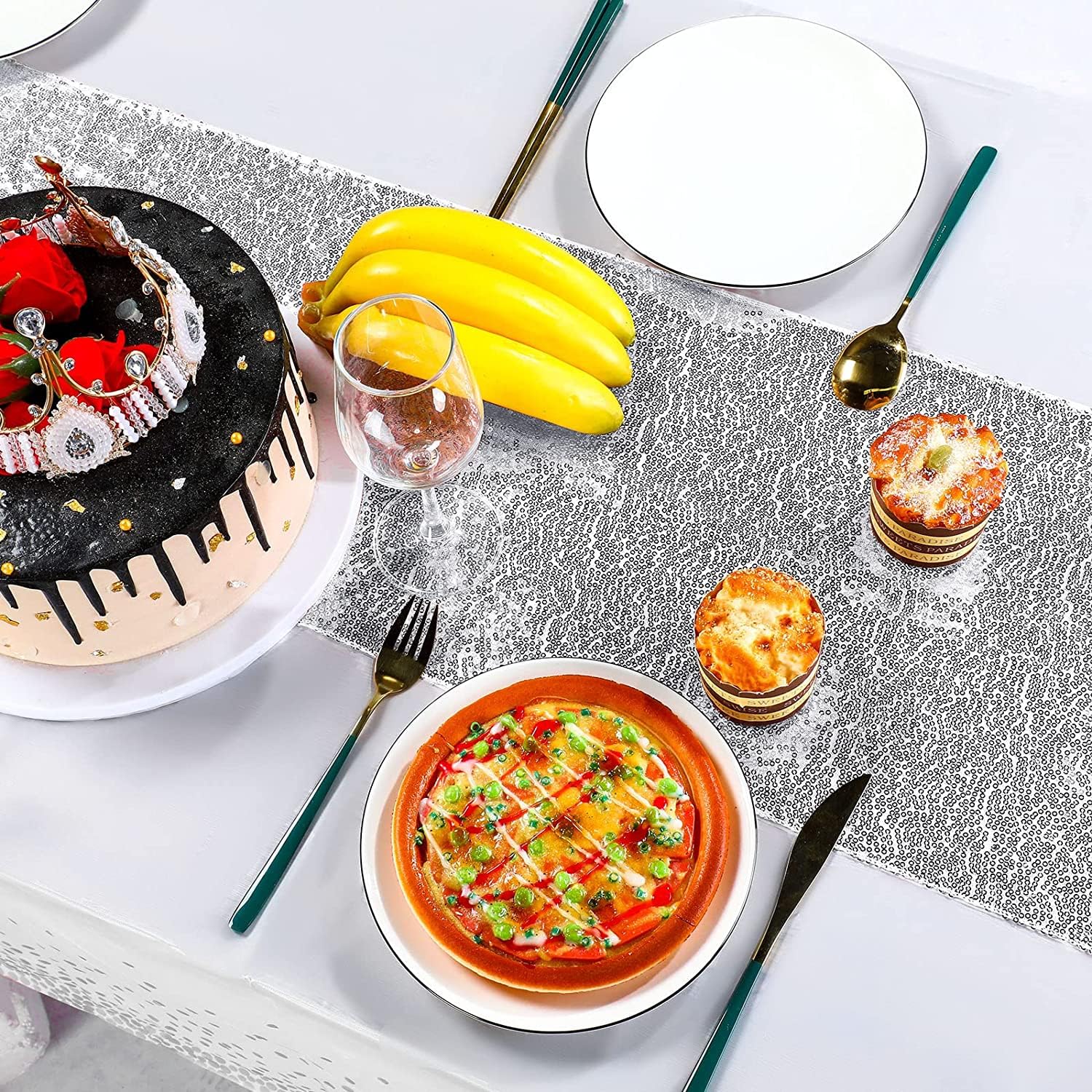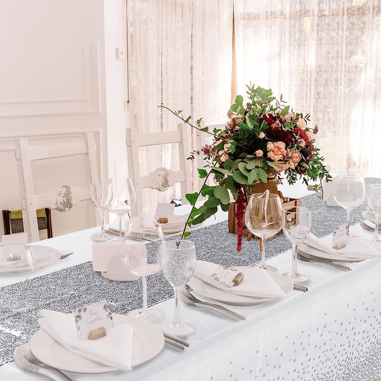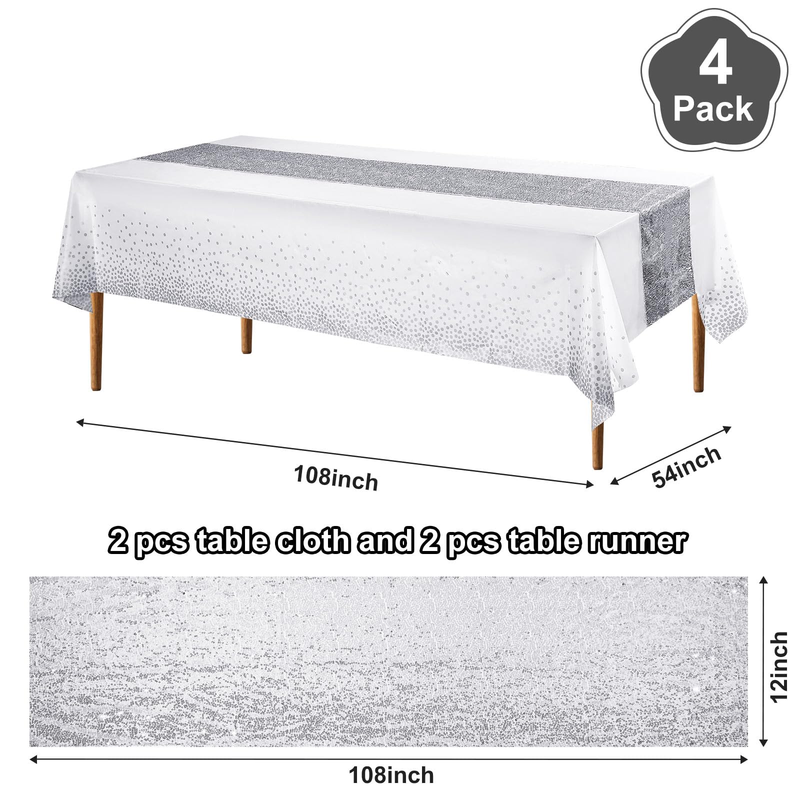 Dimension information: the glitter tablecloth measures approx. 12 x 108 inches, and the other plastic table cover is about 54 X 108 inches, large enough for you to decorate your table, moreover, suitable for most styles of tables