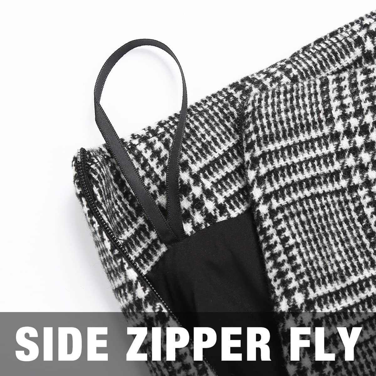 Features: High waisted, side invisible zipper fly closure, above the knee length