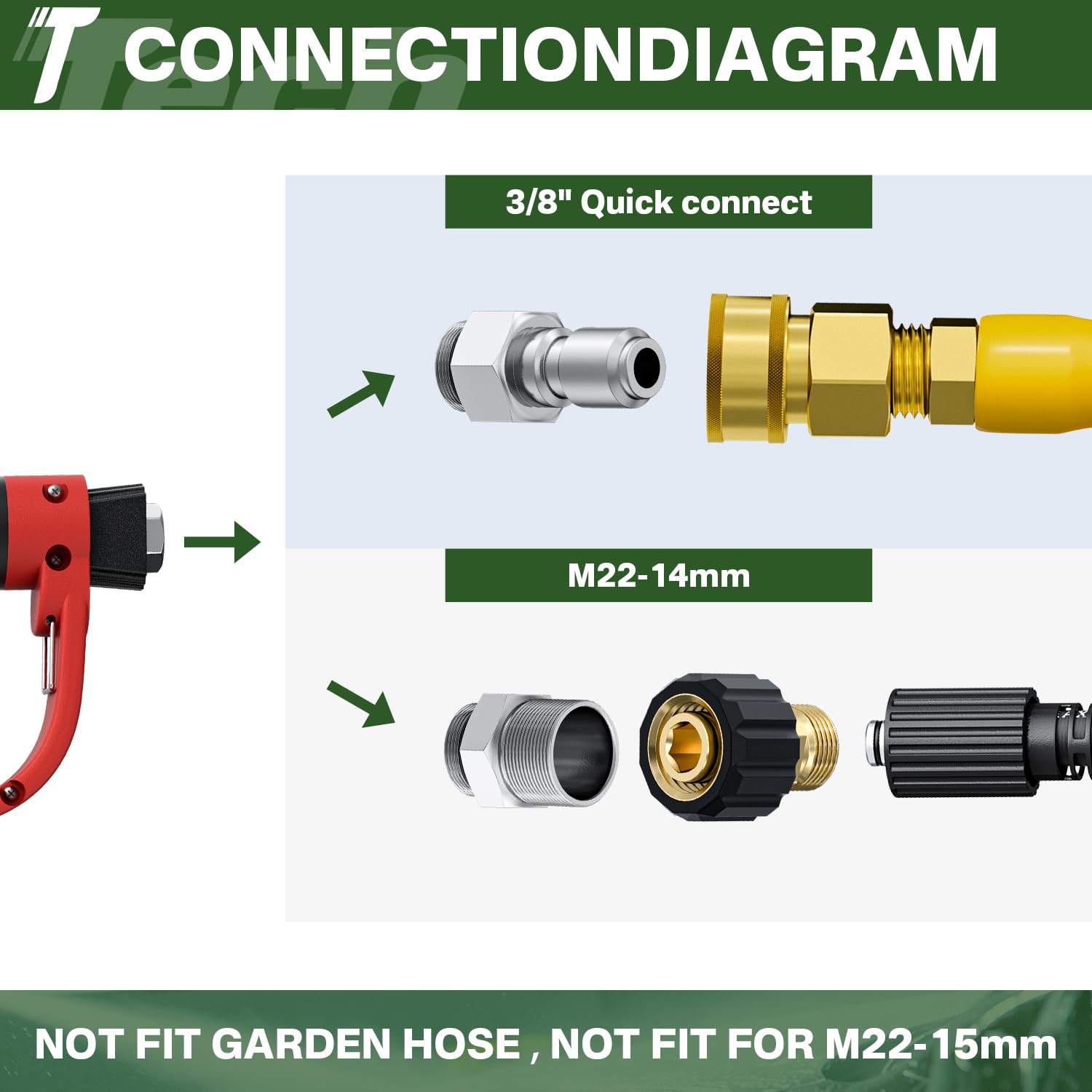 【Swivel Quick Connect Kink Resistant】: 4800 PSI high pressure washer hose is equipped with a swivel 3/8" quick connect, which will help you relax more, no hose kinks, and can be used at any angle. It is also equipped with M22 14MM adapters, which can handle the cleaning work easier and faster, better support your home washing car, motorcycle, floor, window, driveway, roof, siding.