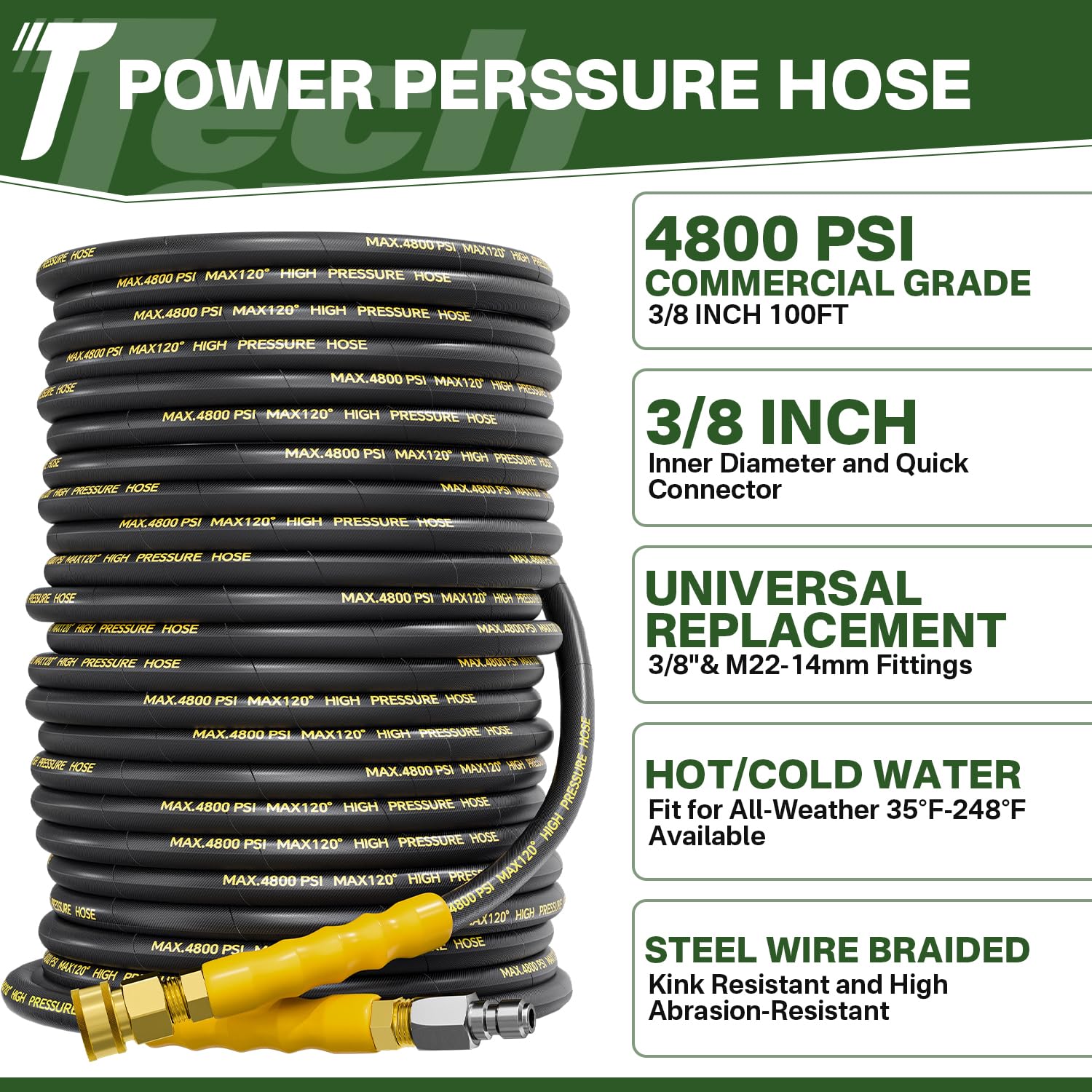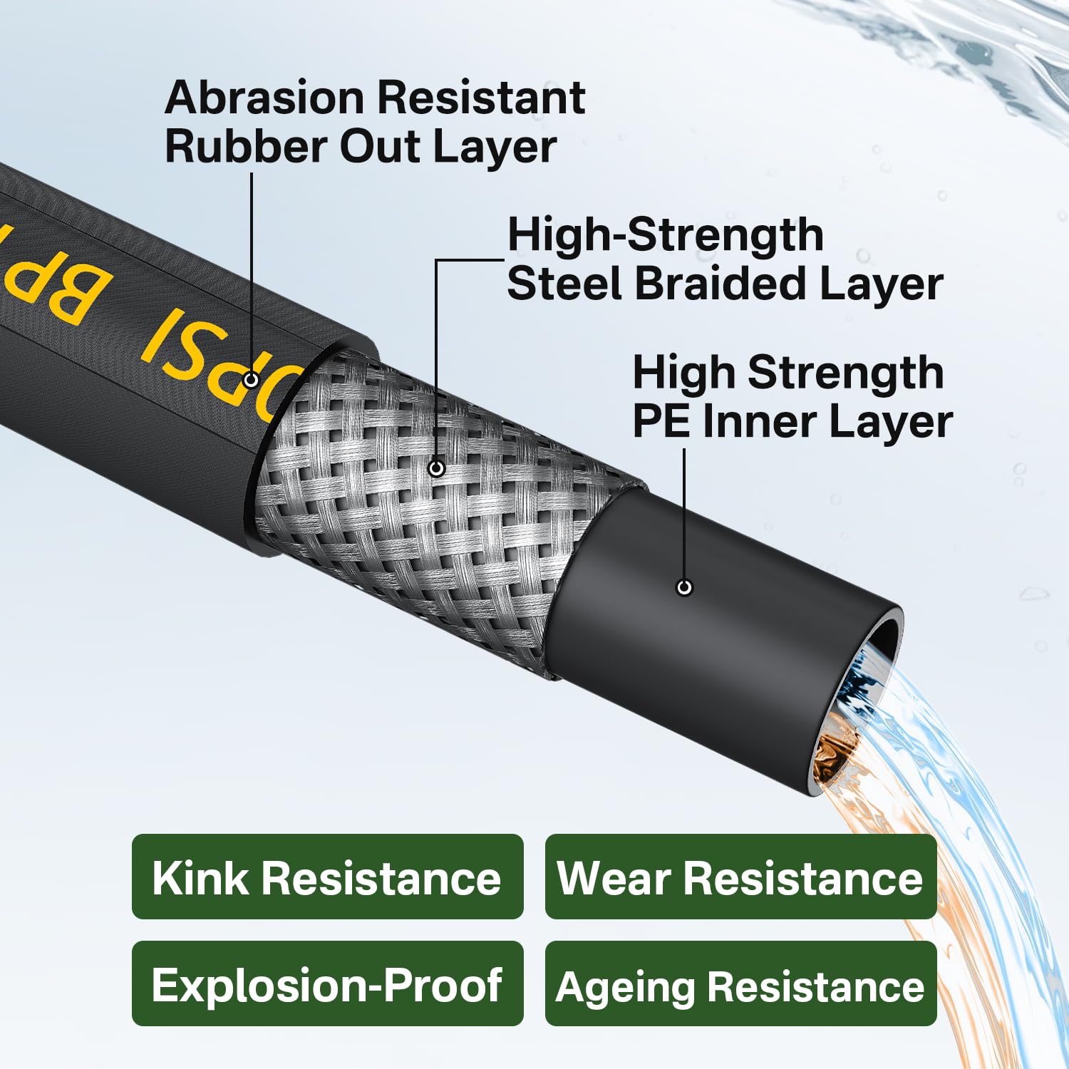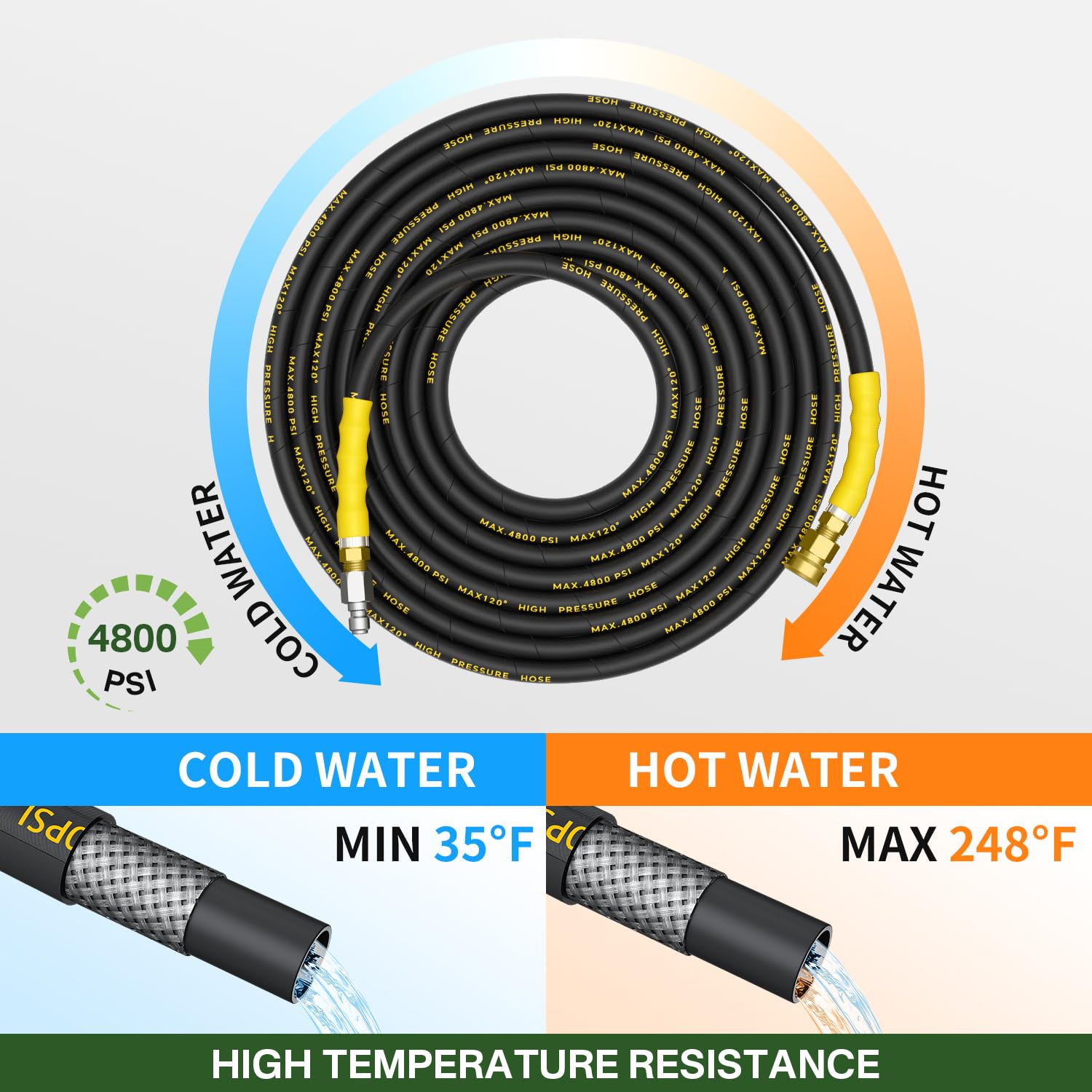 【4800PSI Pressure Washer Hose 50FT】: 3/8" power washer hose is made of high-quality synthetic rubber & tensile steel braid, MAX working pressure can reach 4800 PSI with 16000 PSI burst pressure, Withstands high temperatures up to 120℃ /248°F. designed for a commercial and industrial pressure washer for homework and business.