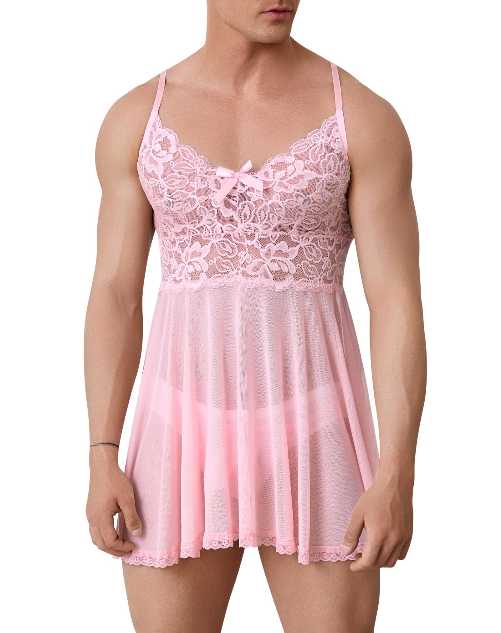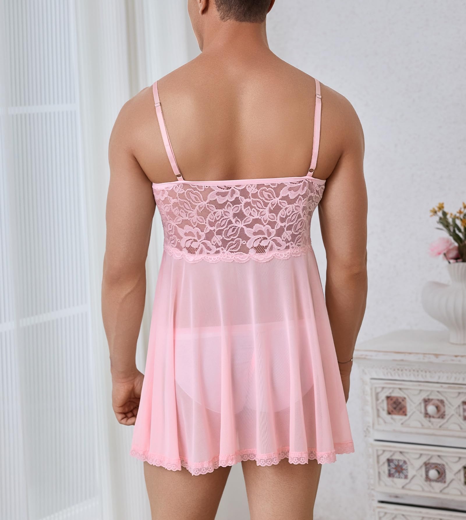 Design: Mens sissy lingerie outfits, sissy underwear for men sheer lace nightdress mesh nightgowns, sissy crossdress lingerie nightwear for men, spaghetti strap sissy lace mesh lingerie dress for men, floral lace and mesh spliced design, sheer see through, sissy night dress for men. With adjustable straps for a better comfortable fit. Sheer mesh nightdress robe for men, with matching g-string panties,as nightwear or sleepwear.