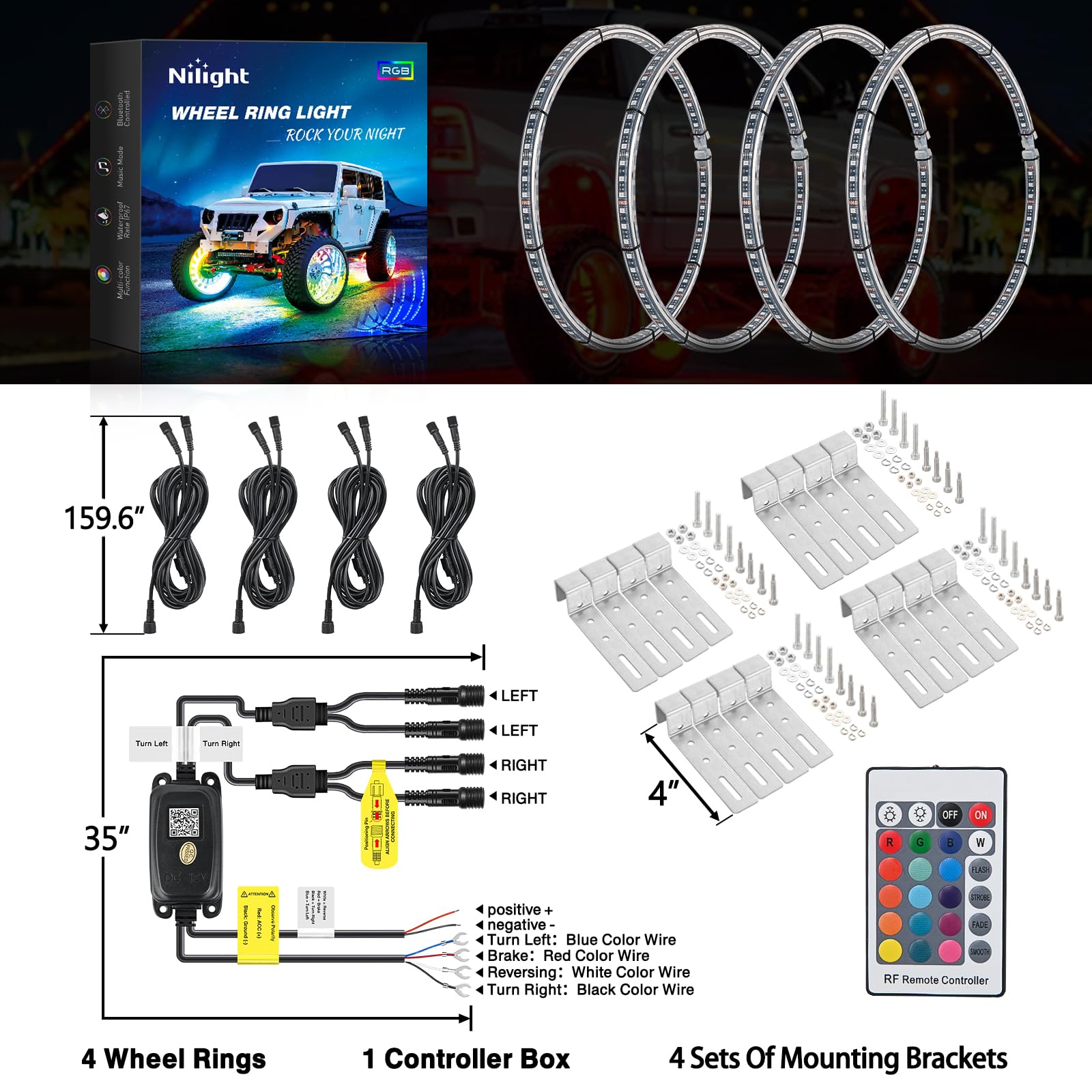 Durability: IP67 waterproof, protect the LED strips to work well. In addition, mounting brackets and cable ties ensure stable installation. Even driving through lots of rain, highway speeds, potholes, the Wheel Ring lights can still stay on and work great.