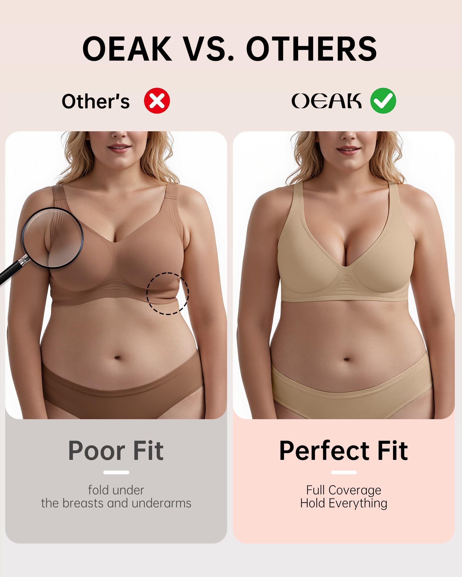 Full Support Bras - These no-wire bras feature a "W-shaped" and innovative 3D supportive technology formed by liquid jelly band, providing full support for your breasts and creating a full, natural-looking chest without the discomfort of a traditional underwire bra. The widened side of the bras with jelly band can effectively conceal excess fat.