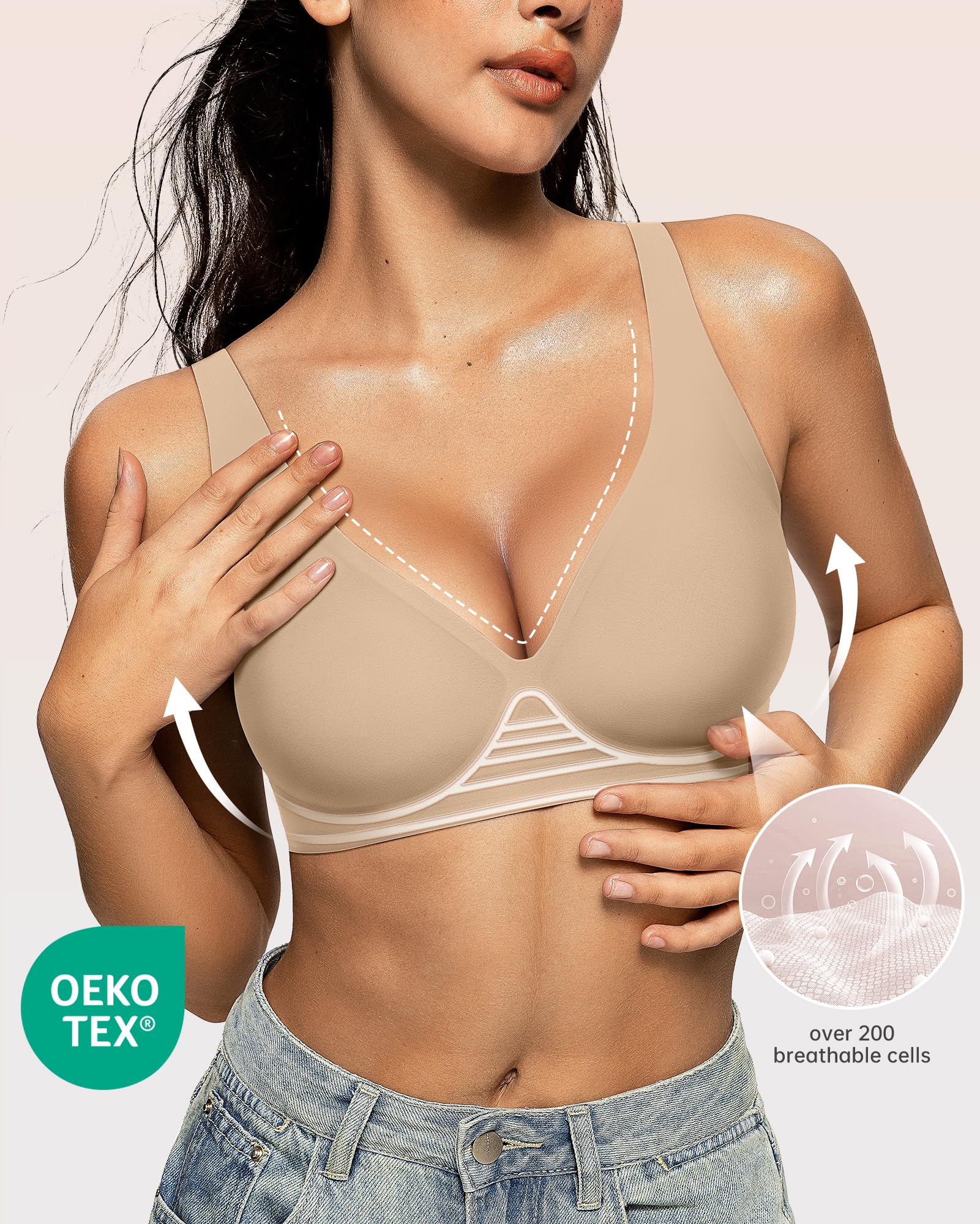 Ultra Soft and Comfortable Bras - These deep V bras with semi-fixed pads are made from high-quality fabric with a delicate texture, super breathable and gentle on the skin, providing a feather-light feeling with zero pressure. The highly stretchy design fits perfectly under your chest curve, effectively preventing the bra from slipping when lift your hands. Each semi-fixed pad has over 200 breathable holes, keeping you cool and comfortable for 24 hours.