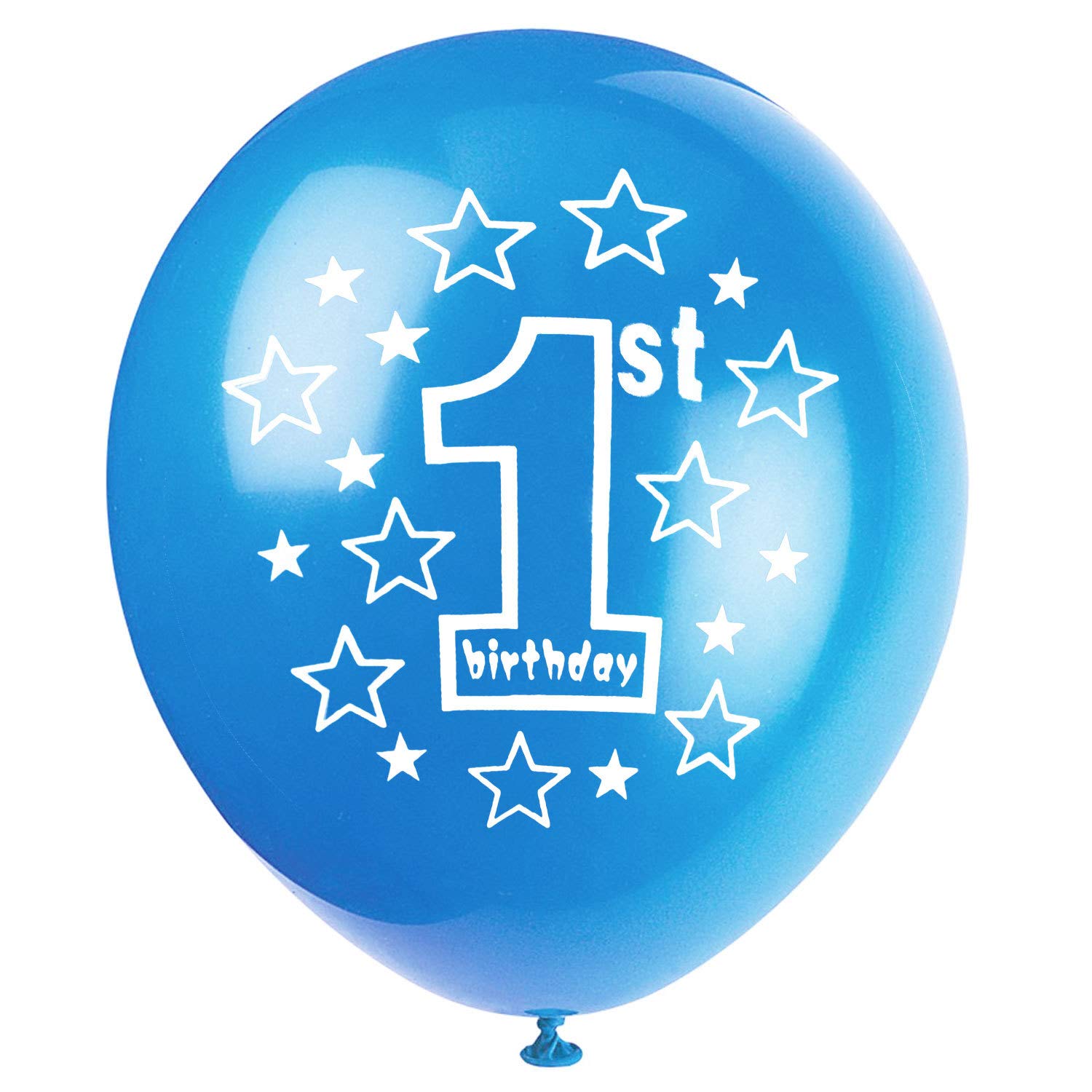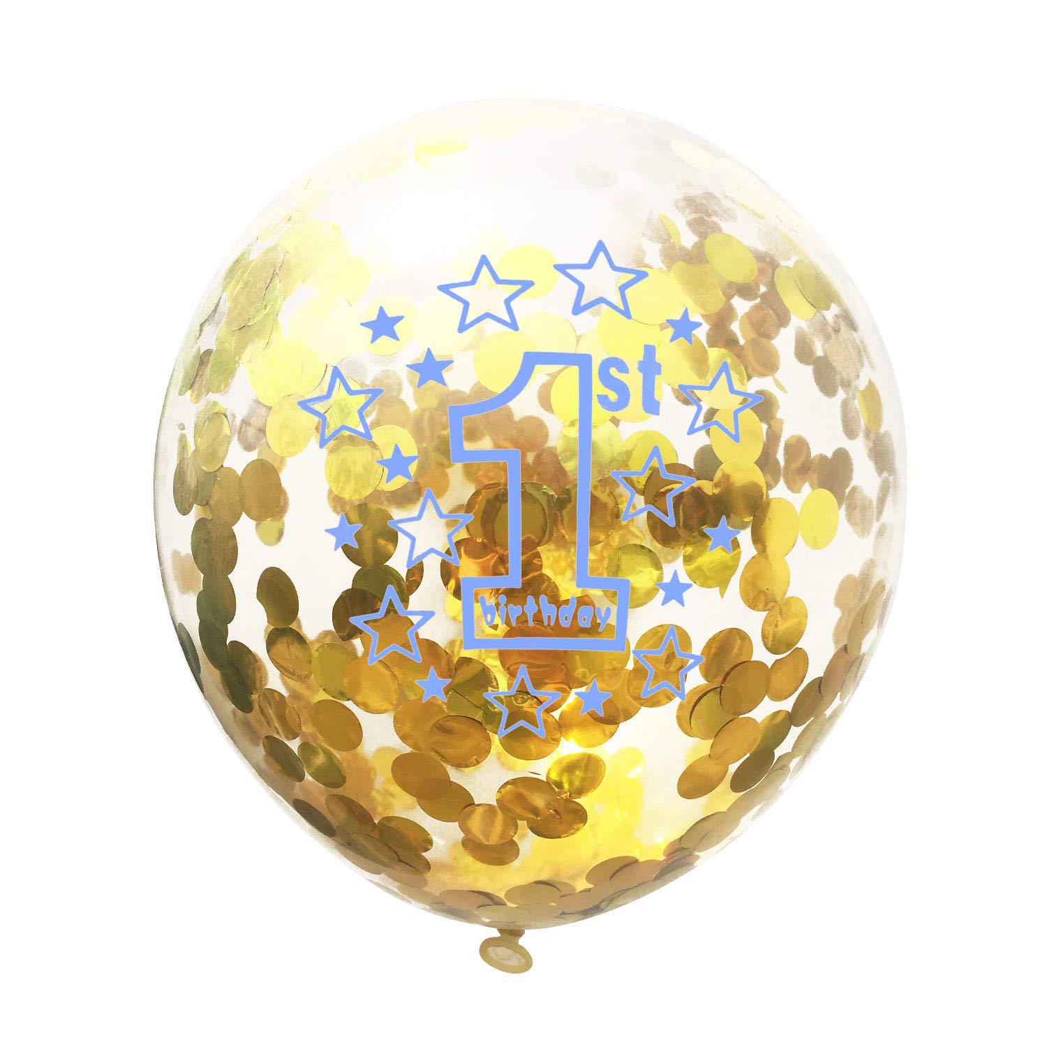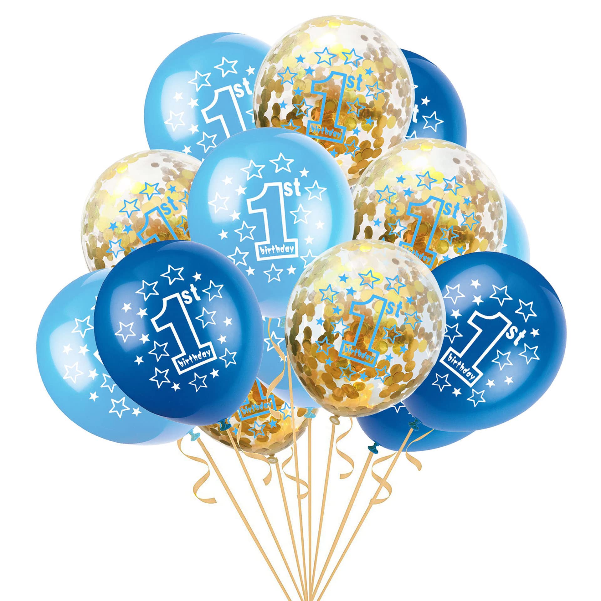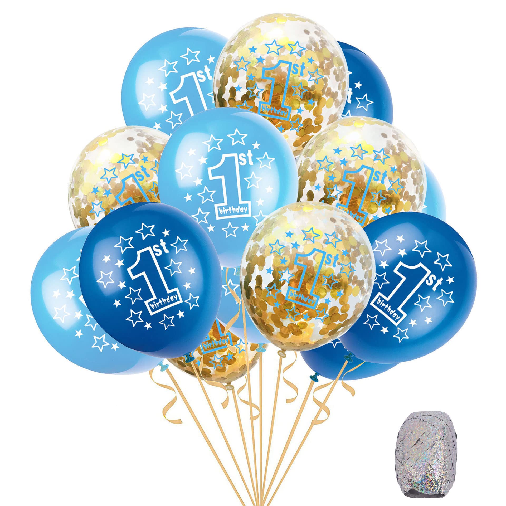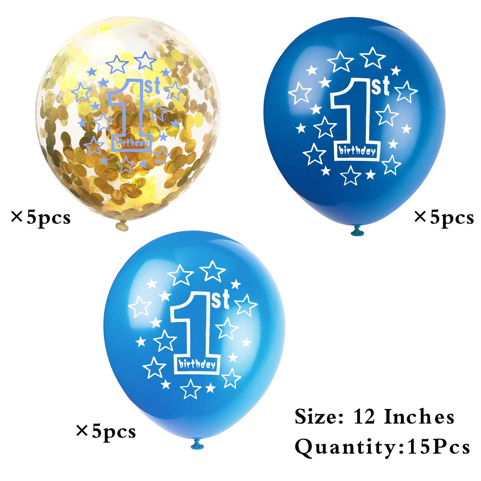 Package:5 pieces 12 inch navy blue latex balloon printed with the words "1st Birthday" 5 pieces 12 inch light blue latex balloon printed with the words"1st Birthday"5 pieces 12 inch gold confetti balloons printed with the words"1st Birthday",1 roll ribbons