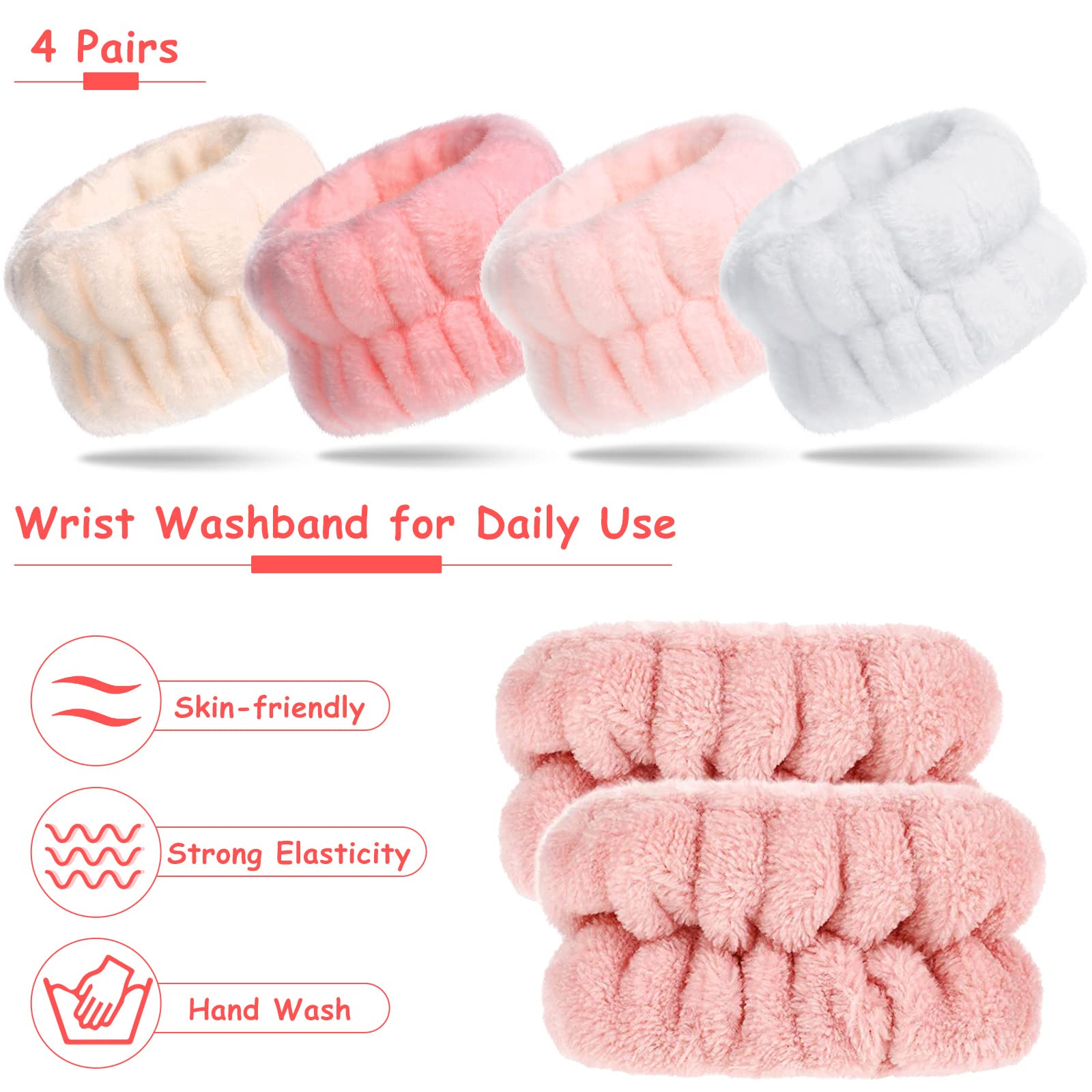 Wrist spa wash band set: there are 4 pairs of microfiber wristbands in different colors, you can wear these cleansing cuffs in line with your headband to reduce and prevent liquid from spreading and spilling down to your arms when washing
